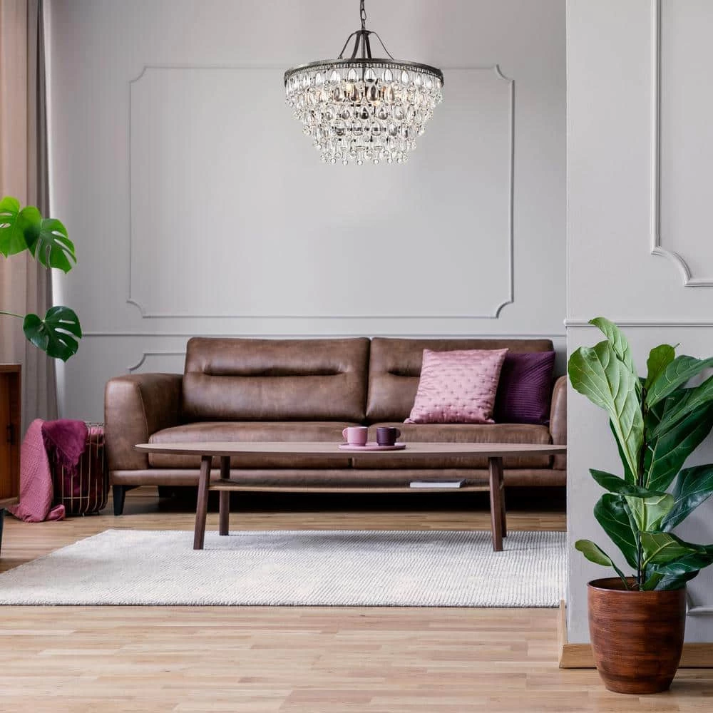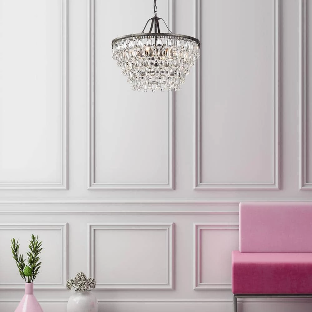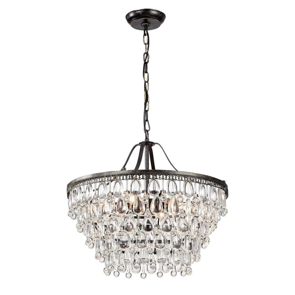 Five tiers of gleaming crystals make this crystal chandelier breathtaking. Draped with tendrils of alternating teardrop and raindrop crystals, this bronze chandelier is guaranteed to leave an impression. The ornate antique bronze hardware tops off this glam ceiling light fixture and comes with a 40 in. adjustable chain.