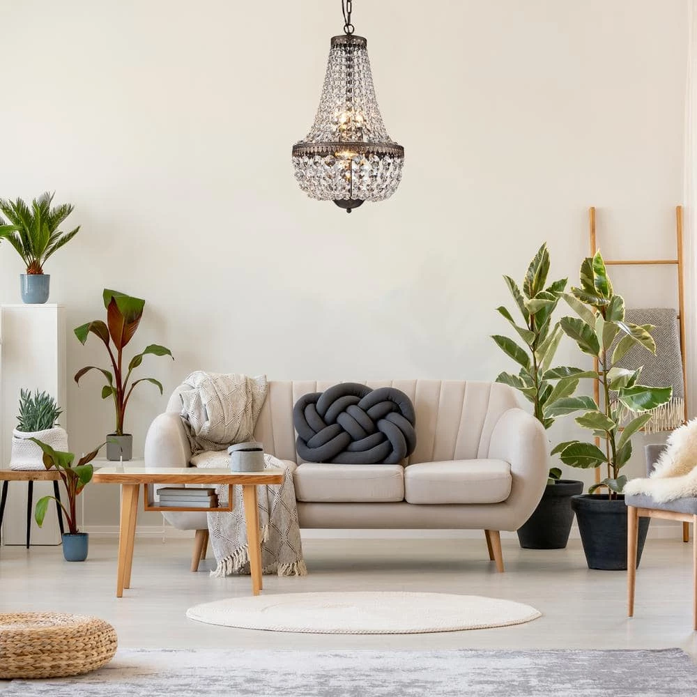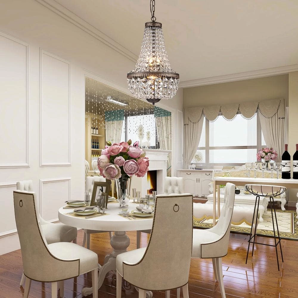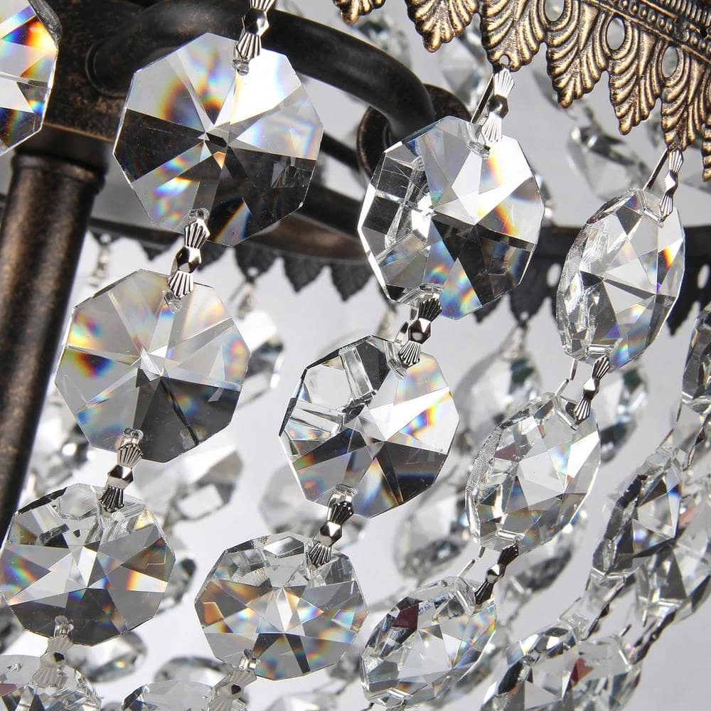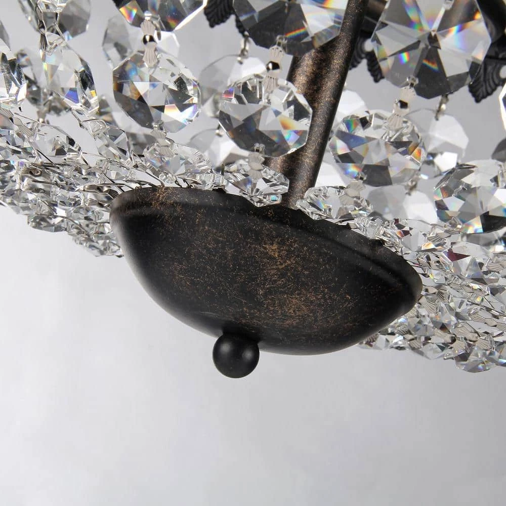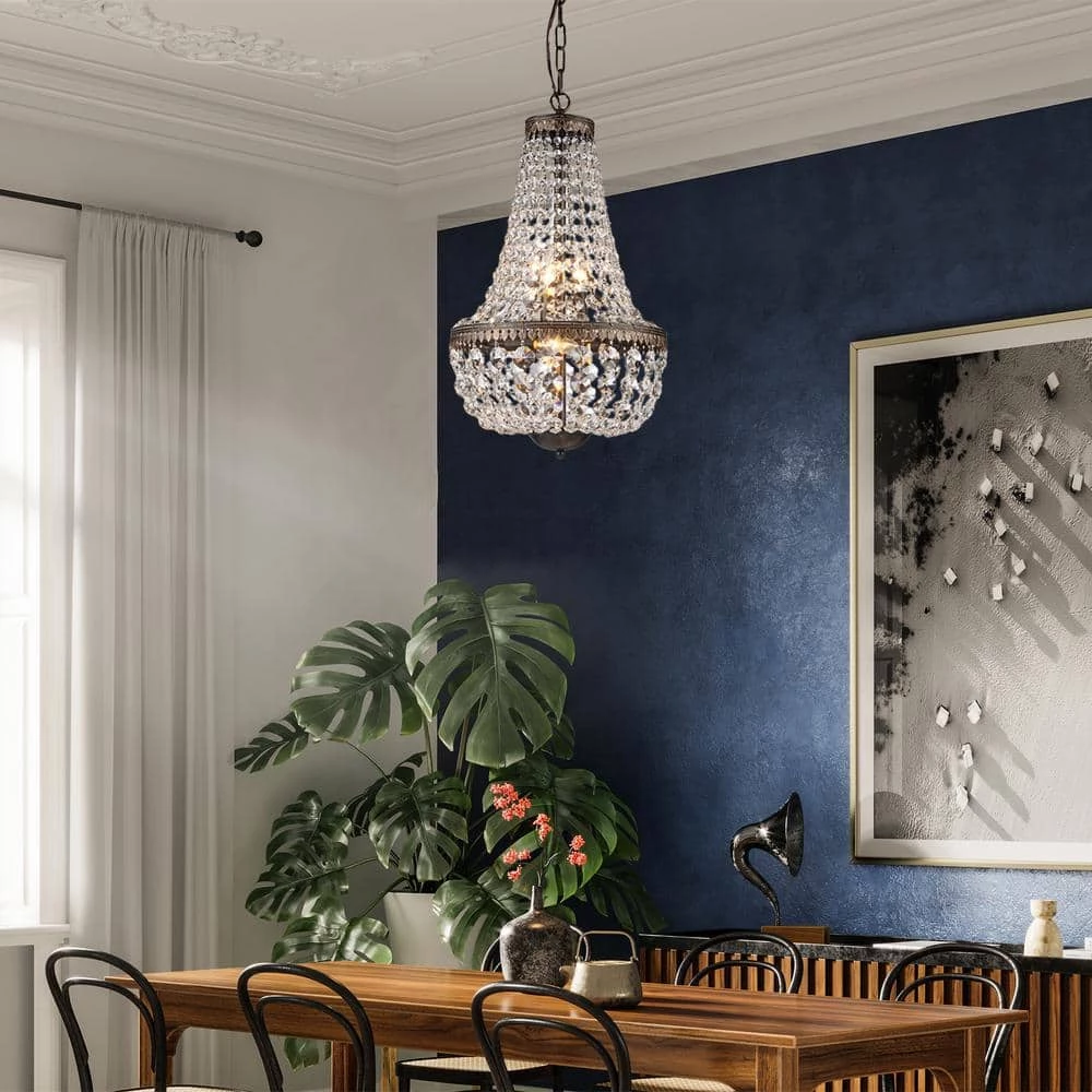 This stunning classic French-Empire chandelier combines antiqued brushed bronze hardware and exquisitely draped crystals. The dazzling crystals of this modern chandelier cover 6 bulbs and extend from an ornate bronze leaf design to form 2 dramatic tiers. The crystal chandelier has a 39.5 in. adjustable chain that makes it accessible to any ceiling height and room size.
