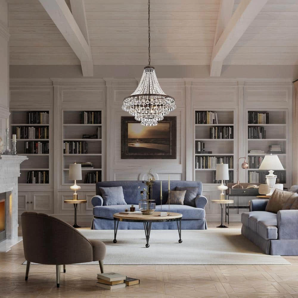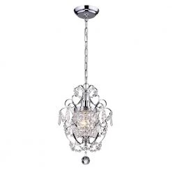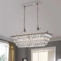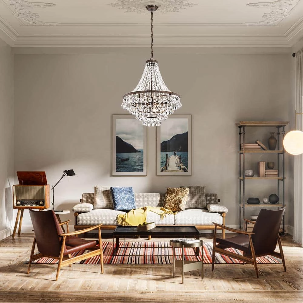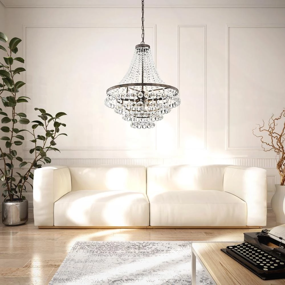 This dazzling 4-tier empire chandelier creates a focal point in your space. The filigree detailing on the antique copper bands add elegance to this stunning crystal chandelier. The layers of multi-faceted clear glass crystals make this piece stand out. This ceiling light fixture comes with a 40 in. chain that can be adjusted by removing links.
