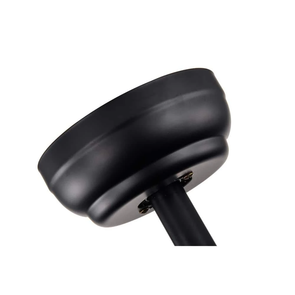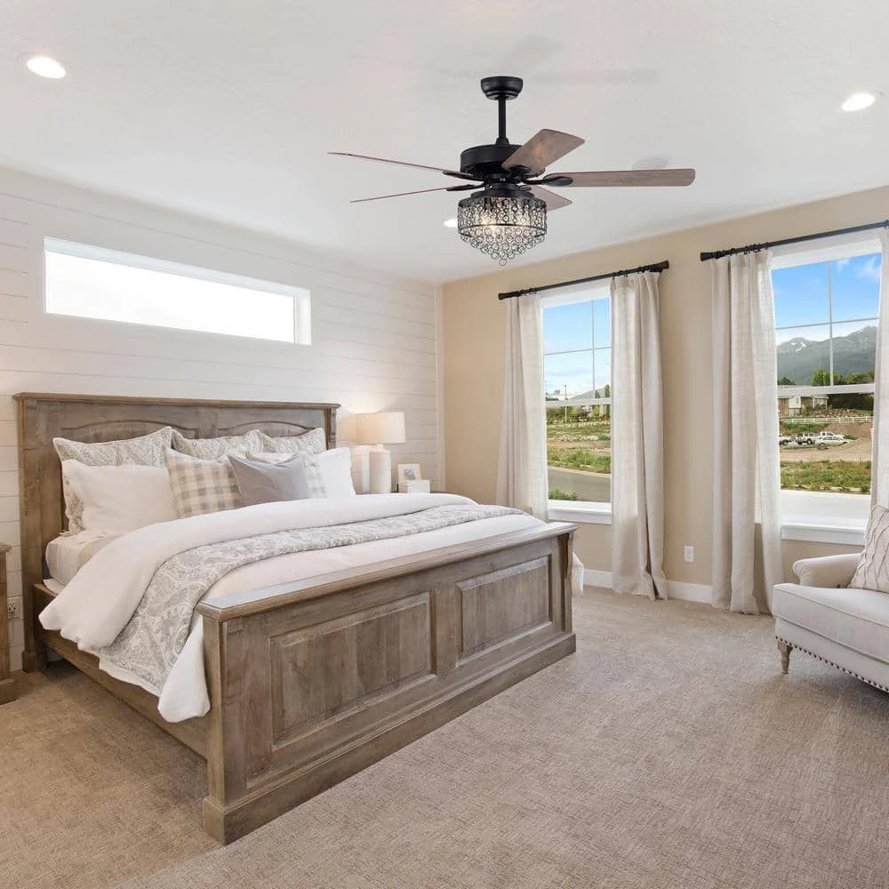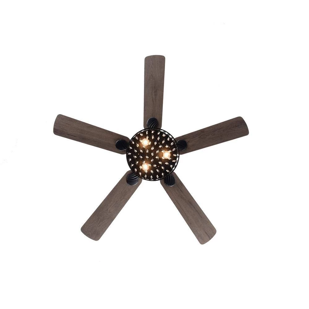 - Matte black finish with 5 brown reversible blades and crystal light kit
