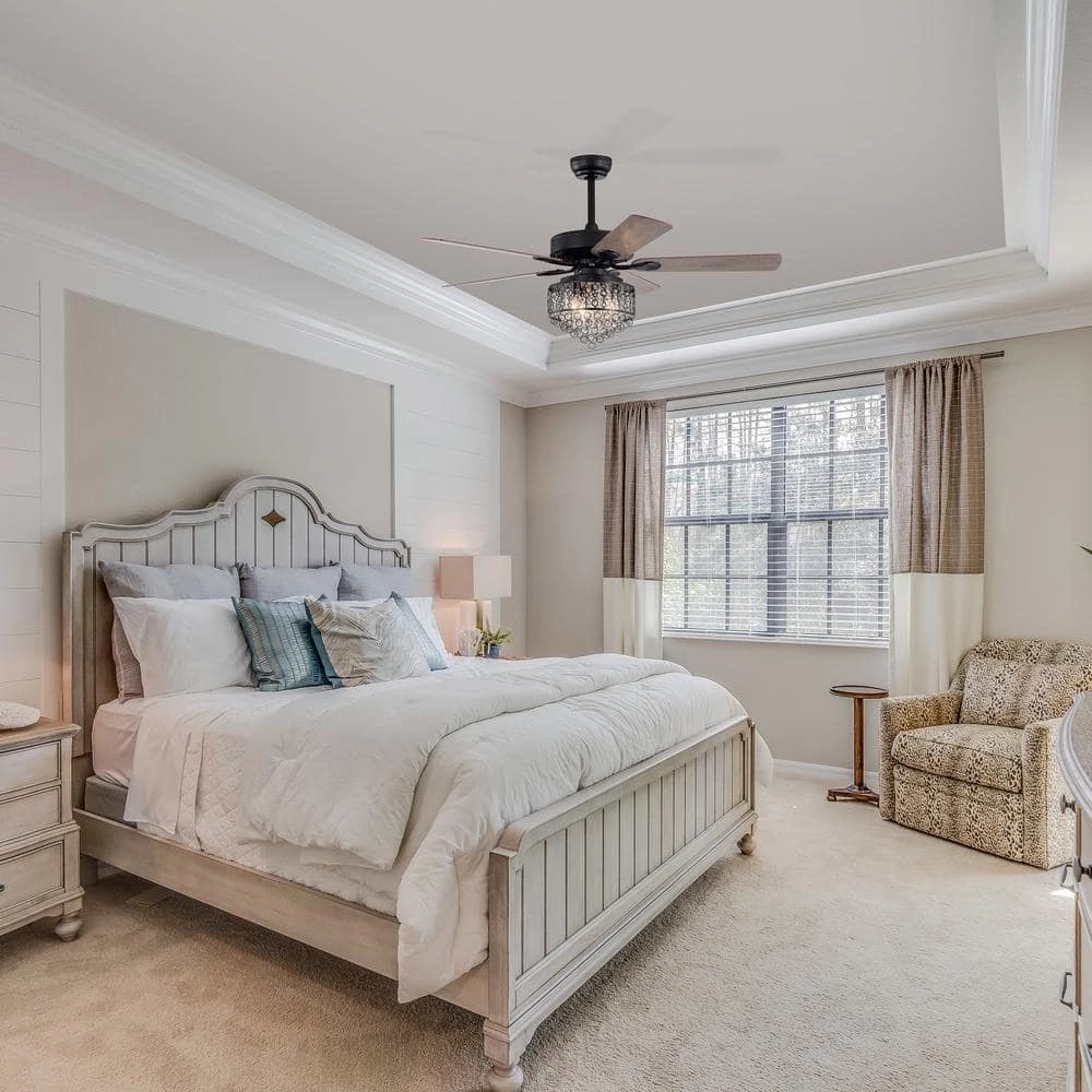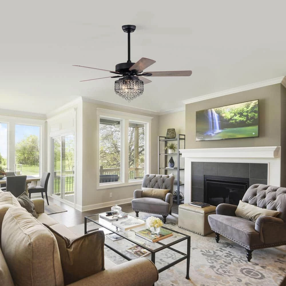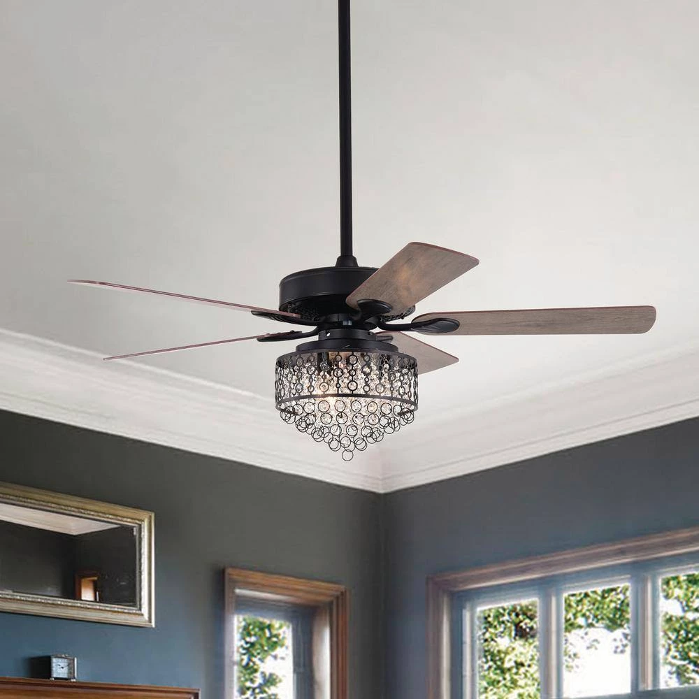 Featuring a glam design, this unique ceiling fan is the perfect solution to your indoor spaces. 5 brown reversible blades allow ample airflow to circulate throughout your home. The matte black finish brings a current look to your decor and coordinates effortlessly with modern furnishings. The light kit supports a beautiful cascade of crystals behind a black patterned overlay.