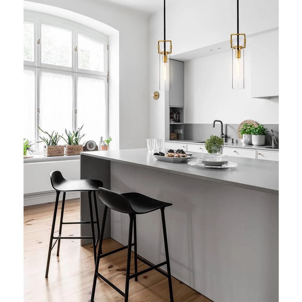 Featuring a sleek cylinder glass shade and antique gold accents, this 1 light pendant fits perfectly in today’s design trends. Crafted with fine detail, this modern pendant imbues elegance with its slim design and gold textured hardware. Perfect above your kitchen island or dining table, the contemporary elements of this cylinder pendant provide a timeless quality.