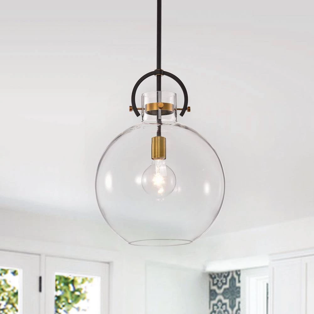 Featuring a clear glass shade and antique gold accents, this sleek 1-light globe pendant is suitable for a variety of interiors. The smooth lines and neutral color scheme make this modern pendant light perfect above any kitchen island or table, on its own or in multiples. 4 rods allow you to hang this globe pendant light at your desired height.