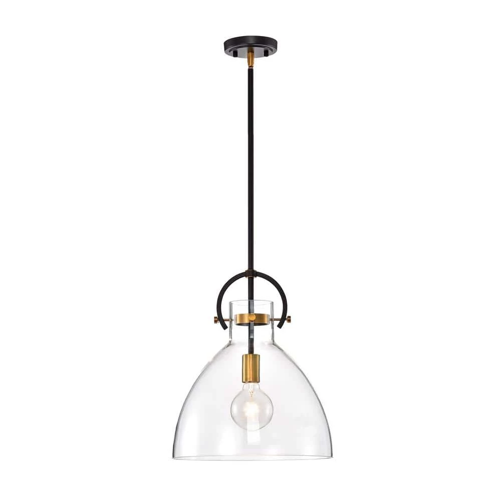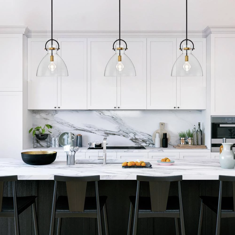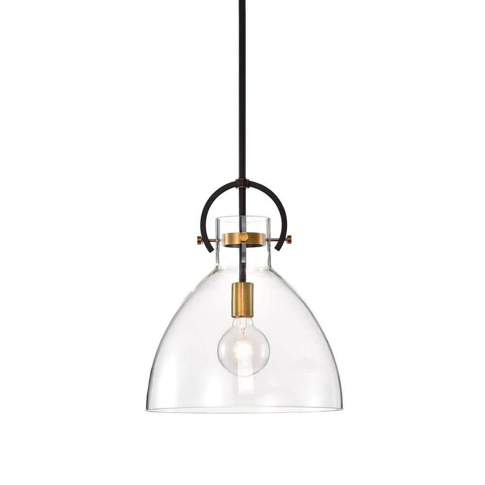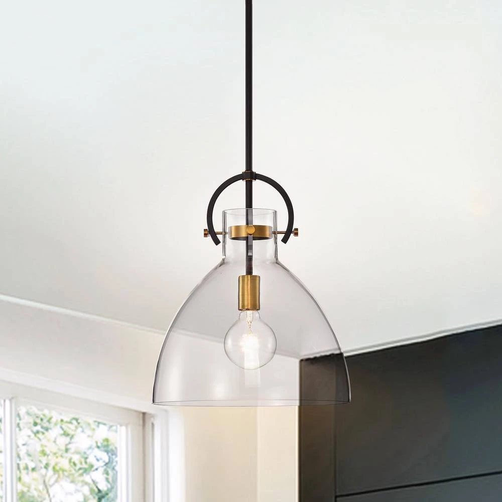 Featuring a clear glass shade and antique gold accents, this sleek 1-light bowl-shaped pendant is suitable for a variety of interiors. The smooth lines and neutral color scheme make this single light fixture perfect above any kitchen island or table, on its own or in multiples. 4 rods allow you to hang this modern pendant light at your desired height.