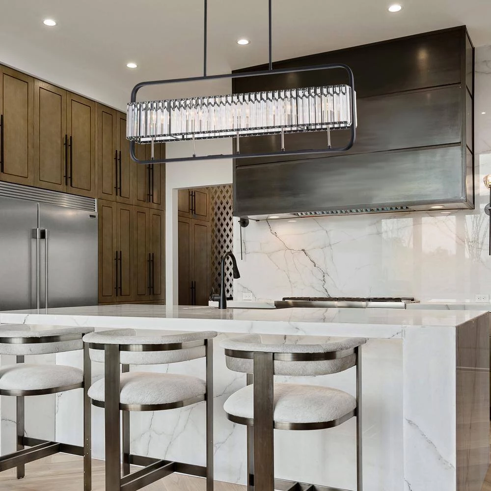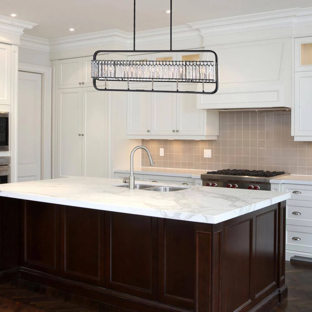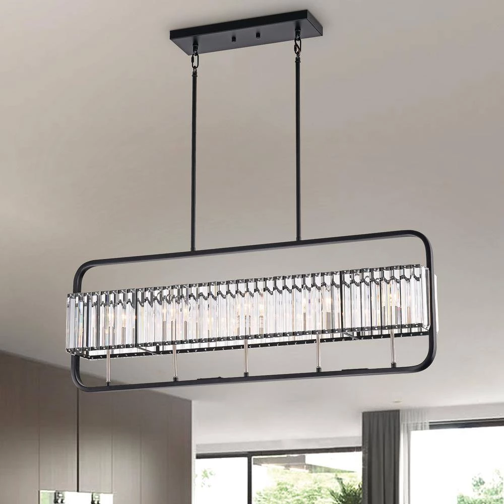 Join the farmhouse glam movement with this dazzling linear chandelier. Rectangular colonial crystals surround the black and nickel wrought iron frame of this 5-light kitchen island light fixture. Use the included rods in any combination to create a custom hanging position. We recommend that you add a dimmer switch to this crystal chandelier for an enhanced dramatic effect.