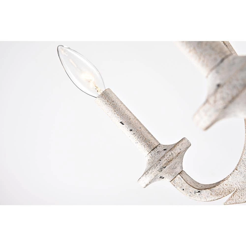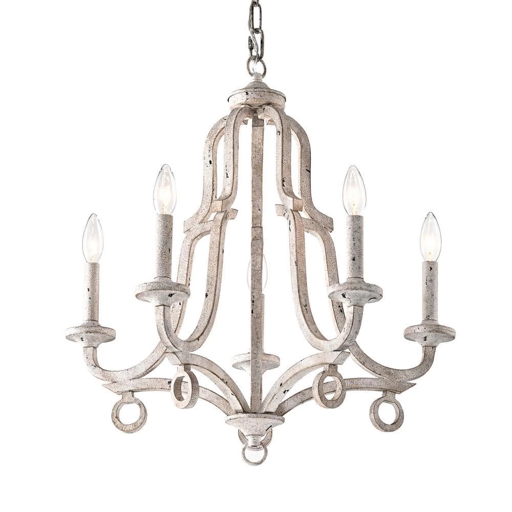 Bathed in white and distressed, this beautiful farmhouse chandelier will add charm and elegance to your entryway, living room, dining room, and bedroom. This 5 light chandelier features candelabra size bulbs that can be used with a dimmer switch for even more style. The adjustable 48 in. chain makes this vintage style chandelier completely customizable.
