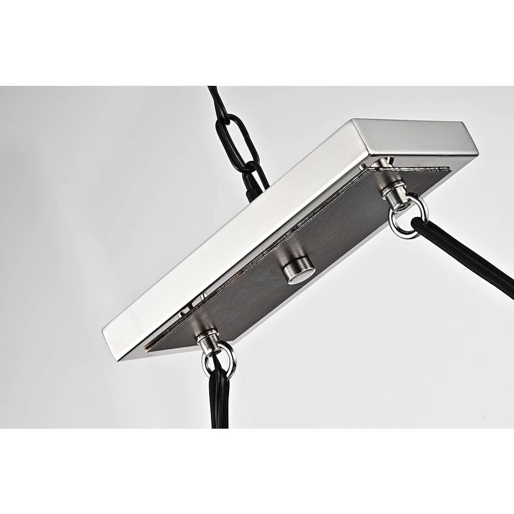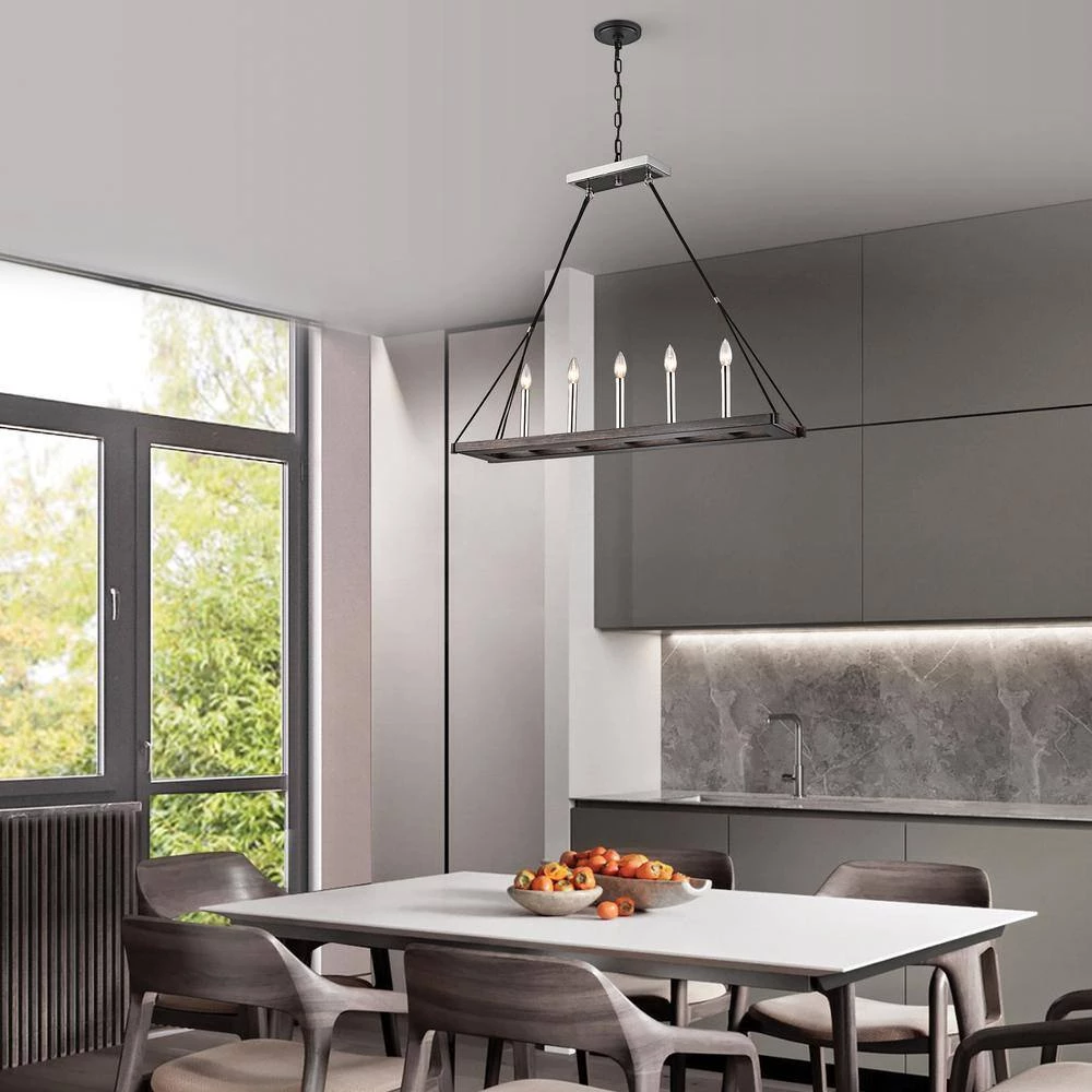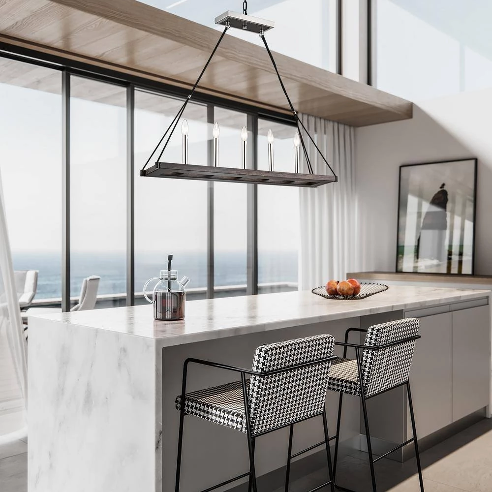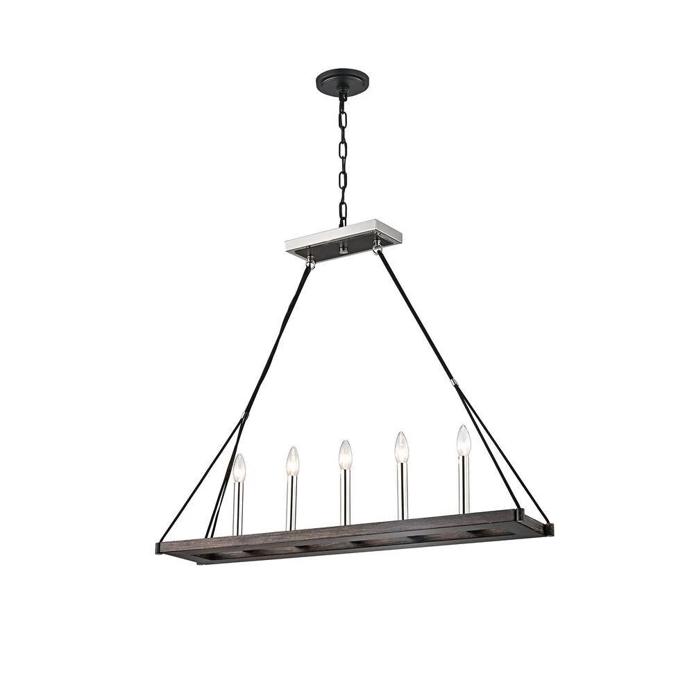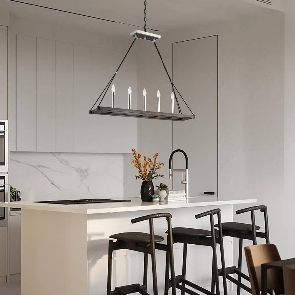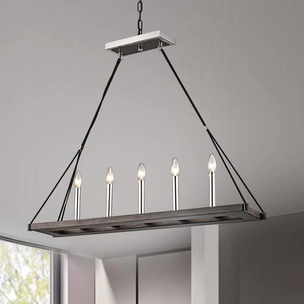 This sleek and modern linear chandelier will grace your home with style. It’s wood finish combined with the brushed nickel accents and bulb sleeves of this industrial farmhouse chandelier provides an eye-catching contrast. The ample 48 in. chain of this adjustable hanging light can be adjusted by simply removing links. Add furthercustomizing by installing a dimmer switch.