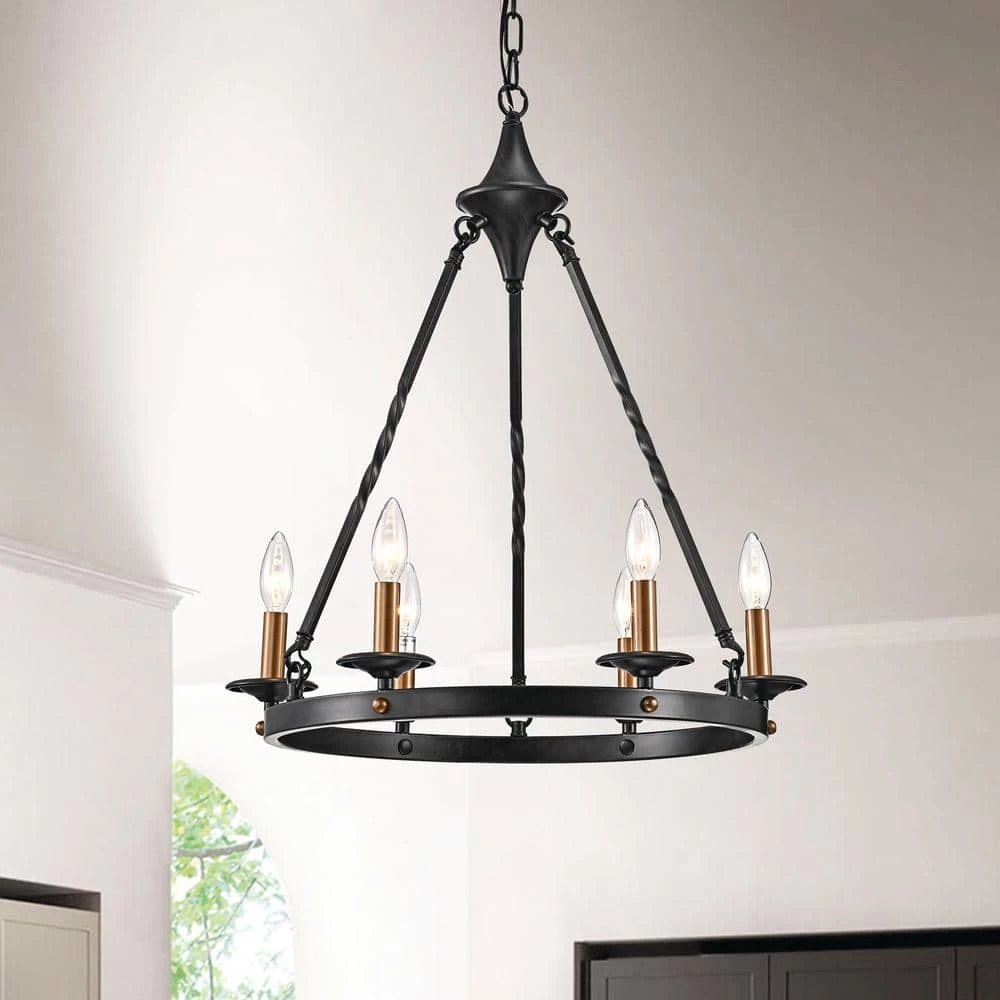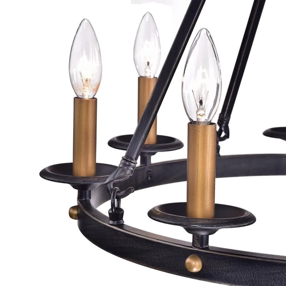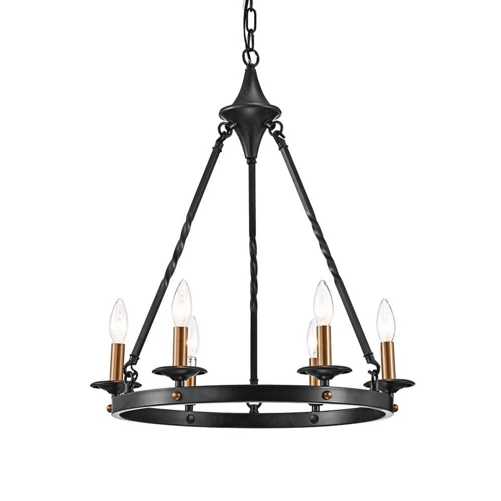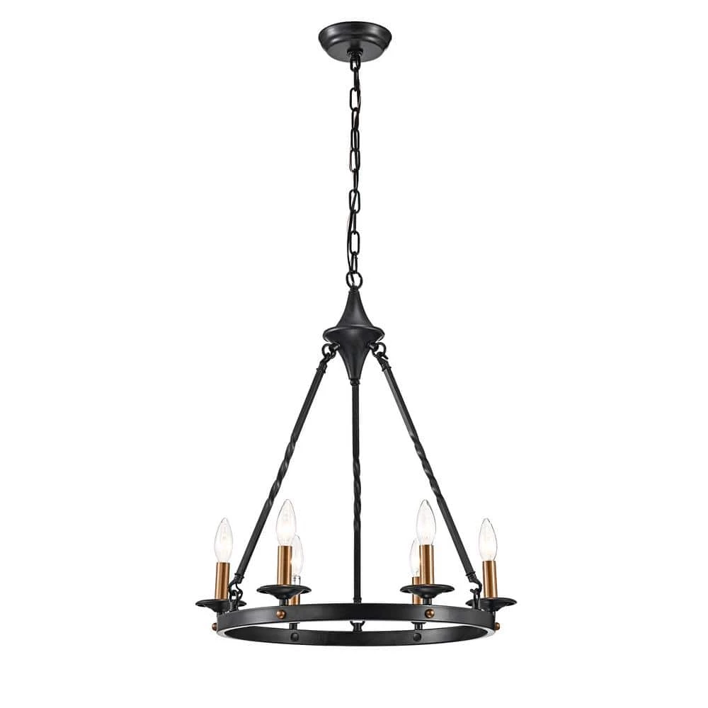 This stunning farmhouse chandelier features an old world design with 6-candelabra style lights and a metal construction. The circular base of this wagon wheel chandelier is highlighted with brass nail heads and coated in an antique black finish for a dramatic look. This candlestick chandelier is suspended from 3 twisted rods with an additional adjustable 40 in. ceiling chain to make a bold statement in your dining room, living room or entryways.
