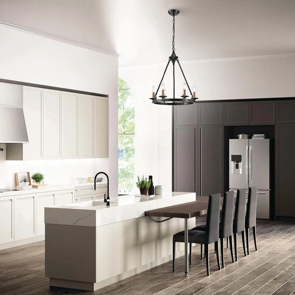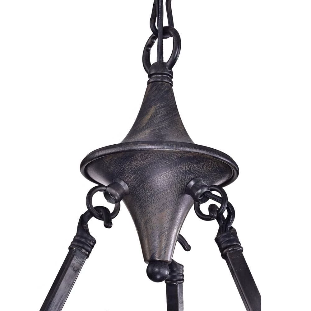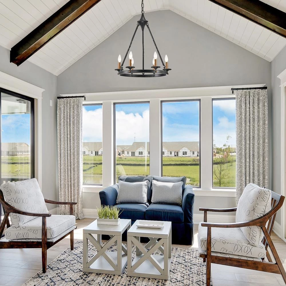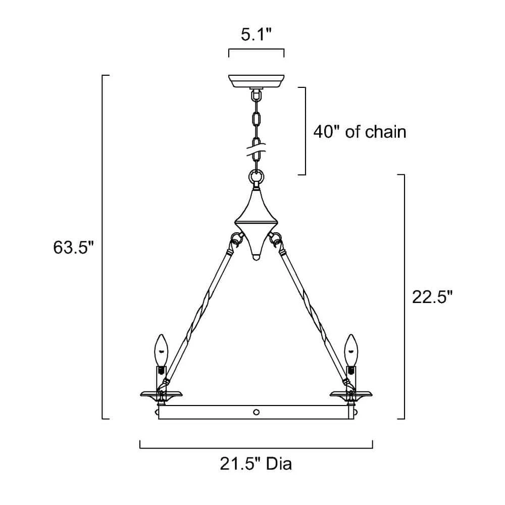 This stunning farmhouse chandelier features an old world design with 6-candelabra style lights and a metal construction. The circular base of this wagon wheel chandelier is highlighted with brass nail heads and coated in an antique black finish for a dramatic look. This candlestick chandelier is suspended from 3 twisted rods with an additional adjustable 40 in. ceiling chain to make a bold statement in your dining room, living room or entryways.