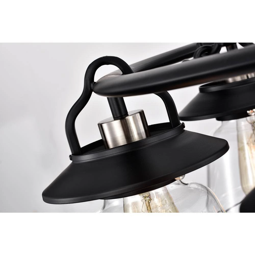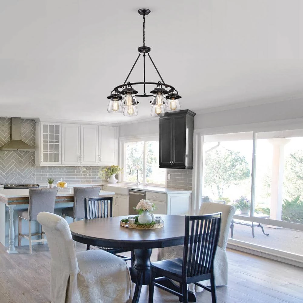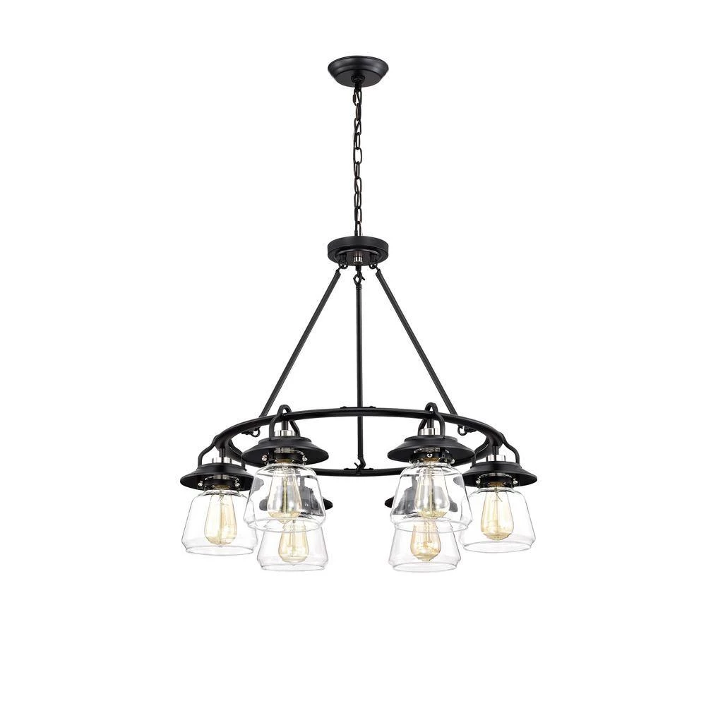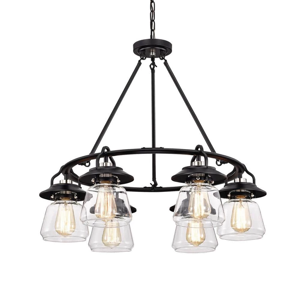 Originally designed, this striking wagon wheel chandelier takes a modern approach to classic lighting. The clear glass shades of this modern chandelier make a sleek statement, while the black lines and brushed nickel detailing add a finishing touch. Hanging by a 48 in. chain, this indoor ceiling light fixture is perfect above your kitchen or living room.
