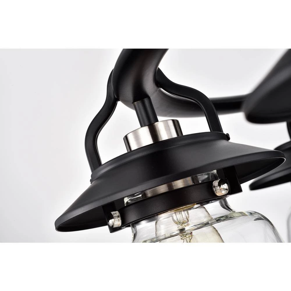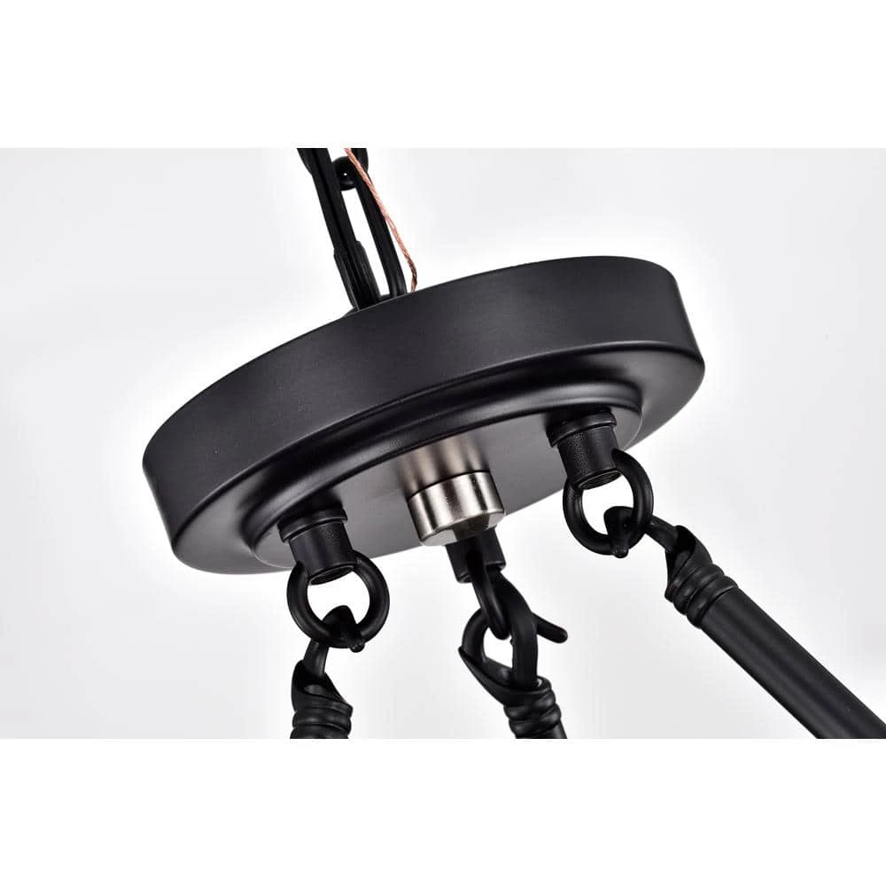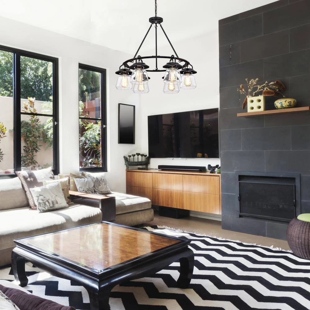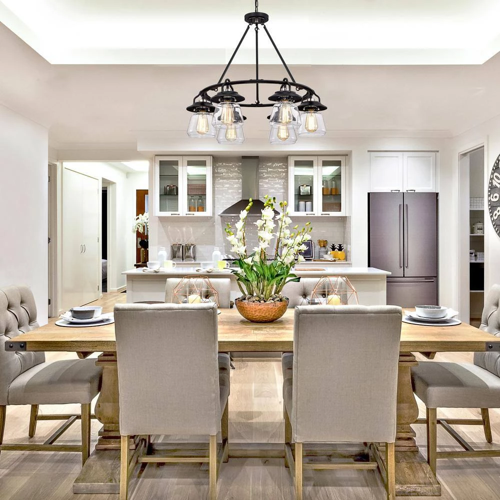 Originally designed, this striking wagon wheel chandelier takes a modern approach to classic lighting. The clear glass shades of this modern chandelier make a sleek statement, while the black lines and brushed nickel detailing add a finishing touch. Hanging by a 48 in. chain, this indoor ceiling light fixture is perfect above your kitchen or living room.