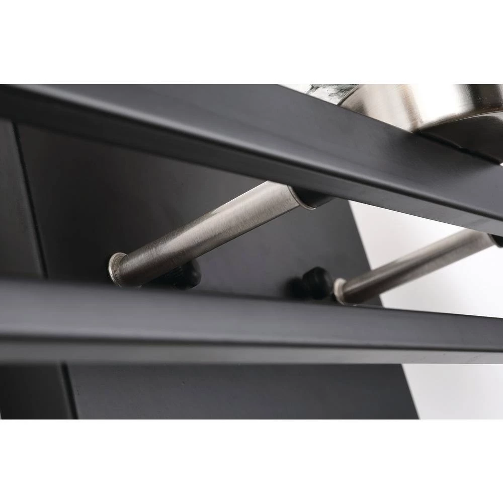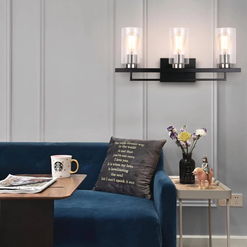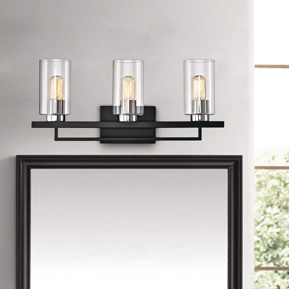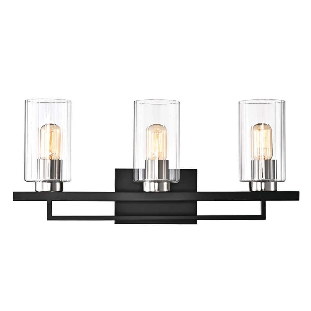 This sleek black and brushed nickel vanity light is perfect for today’s modern design styles. Its clean and simple angular lines include 3-lights covered by brush nickel sleeves. This modern lighting fixture can be hung with the bulbs facing up and we recommend installing dimmer switches for even more flexibility. This contemporary vanity light will beautifully adorn any bathroom or mirror.