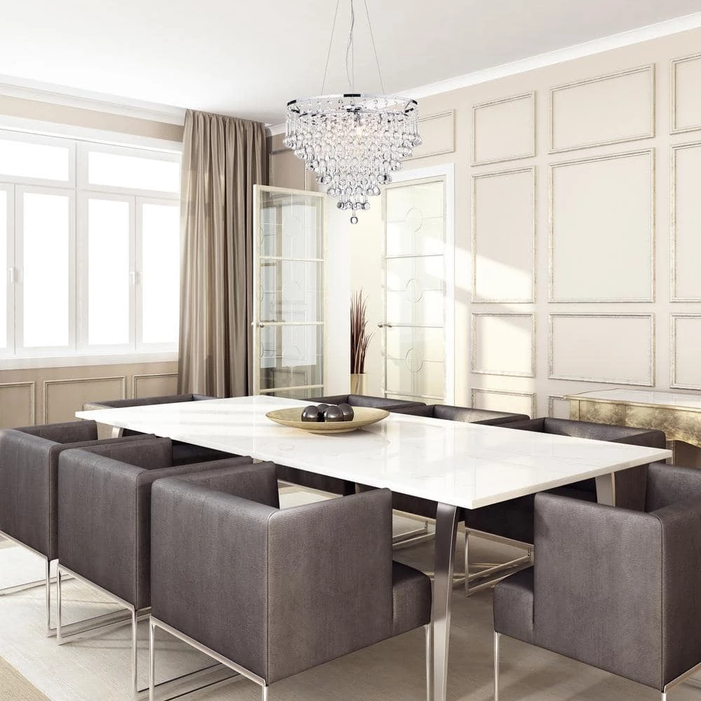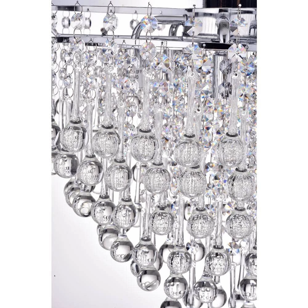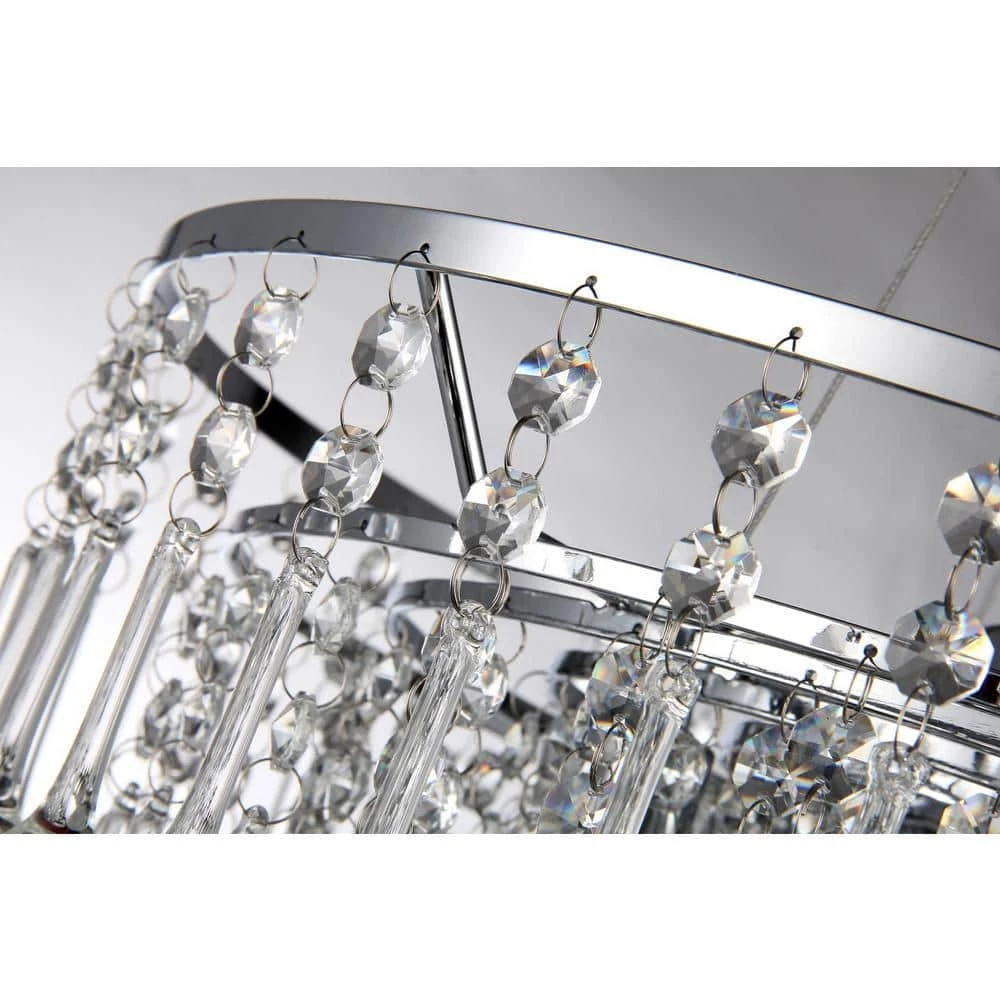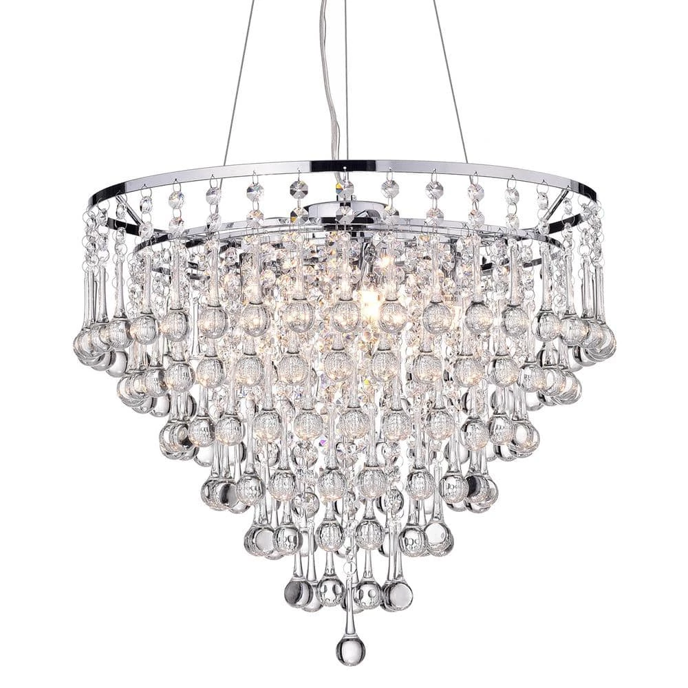 This exquisite crystal chandelier couples dazzling crystals with a shiny chrome finish to create a stunning focal point in your favorite space. The 5-lights of this modern chandelier are surrounded by 7-layers of elongated teardrop crystals that are each capped with a gentle sphere in a symmetrical cascade. The chrome hardware and 3 adjustable metal chords measure at 40 in. making this chrome chandelier ideal for multiple ceiling heights and room sizes.
