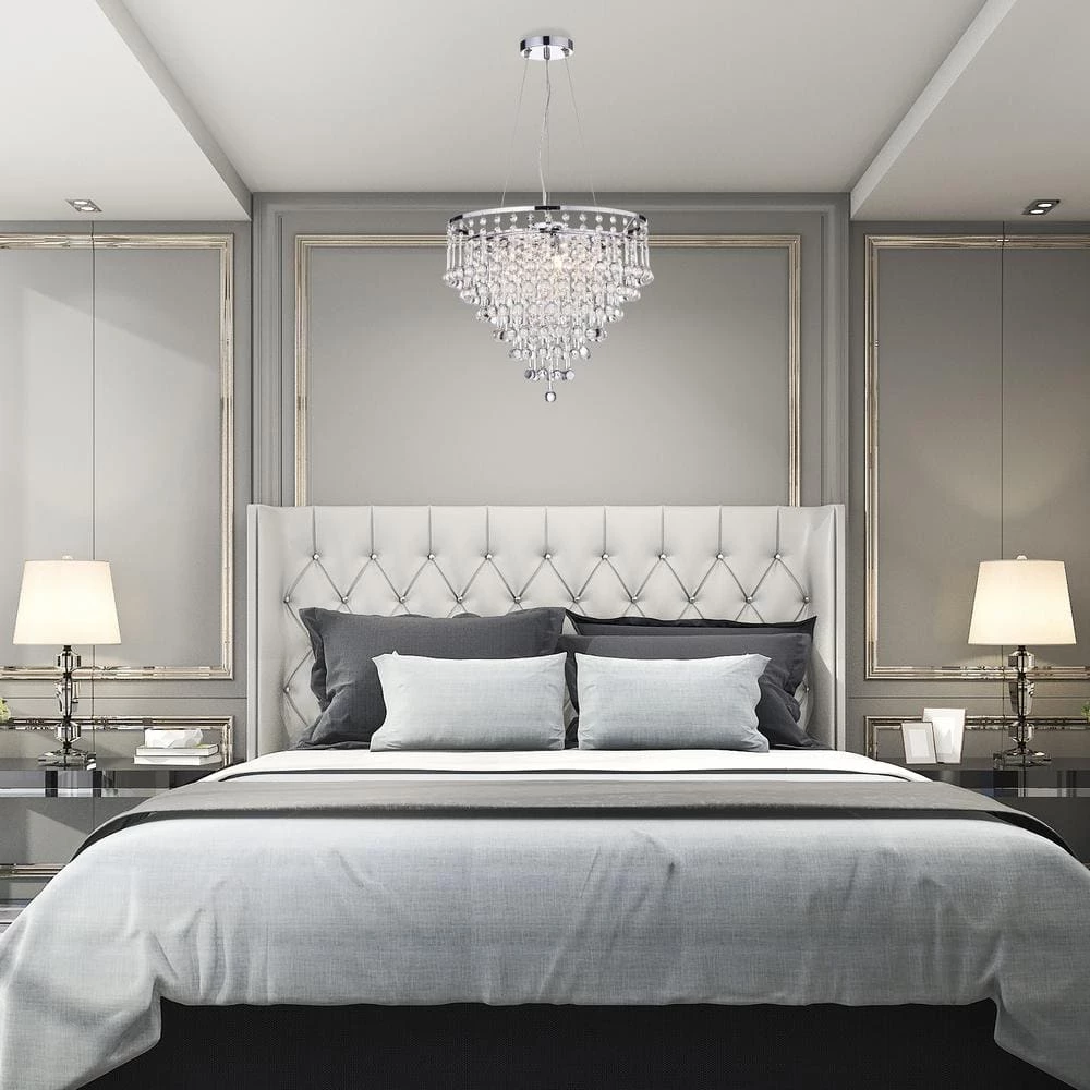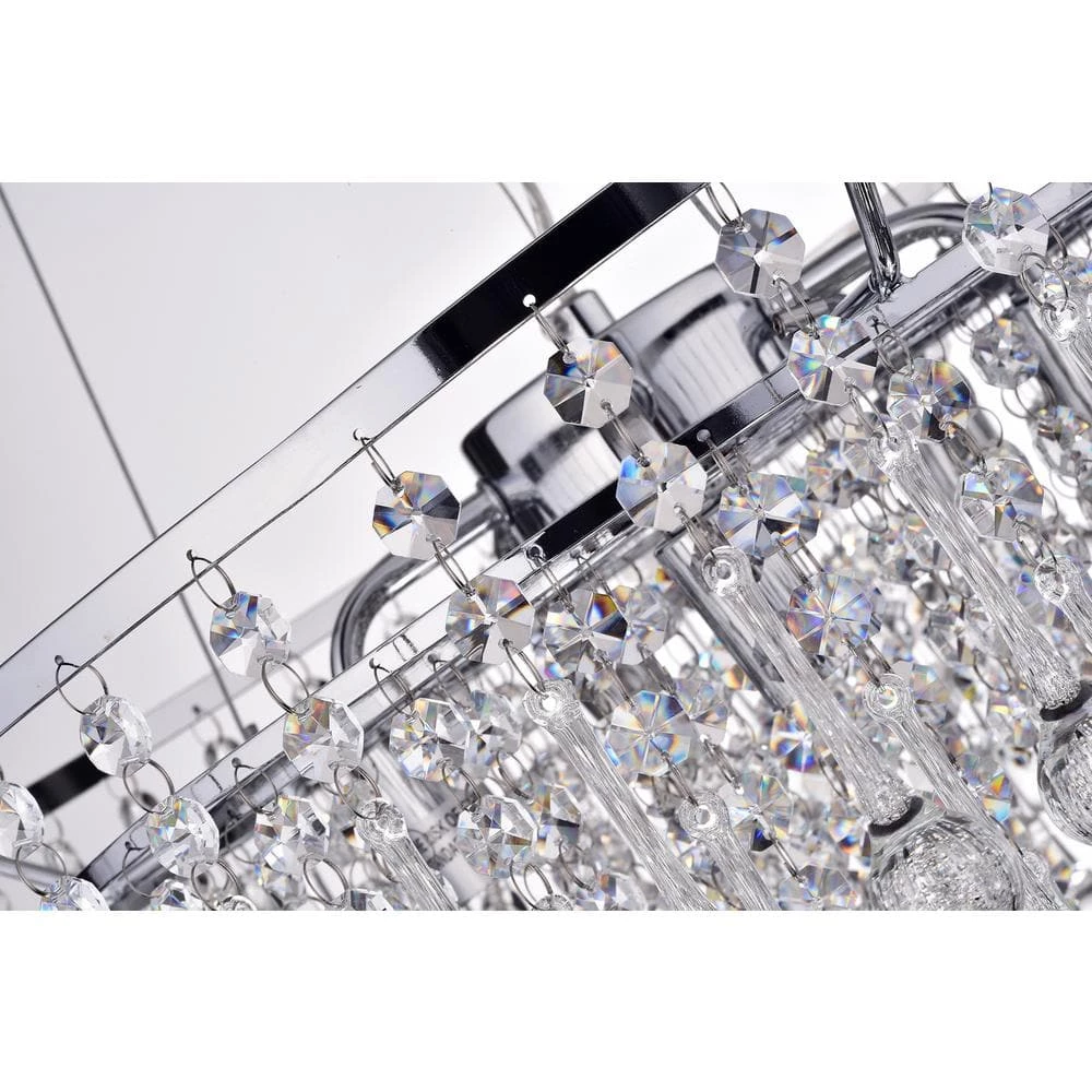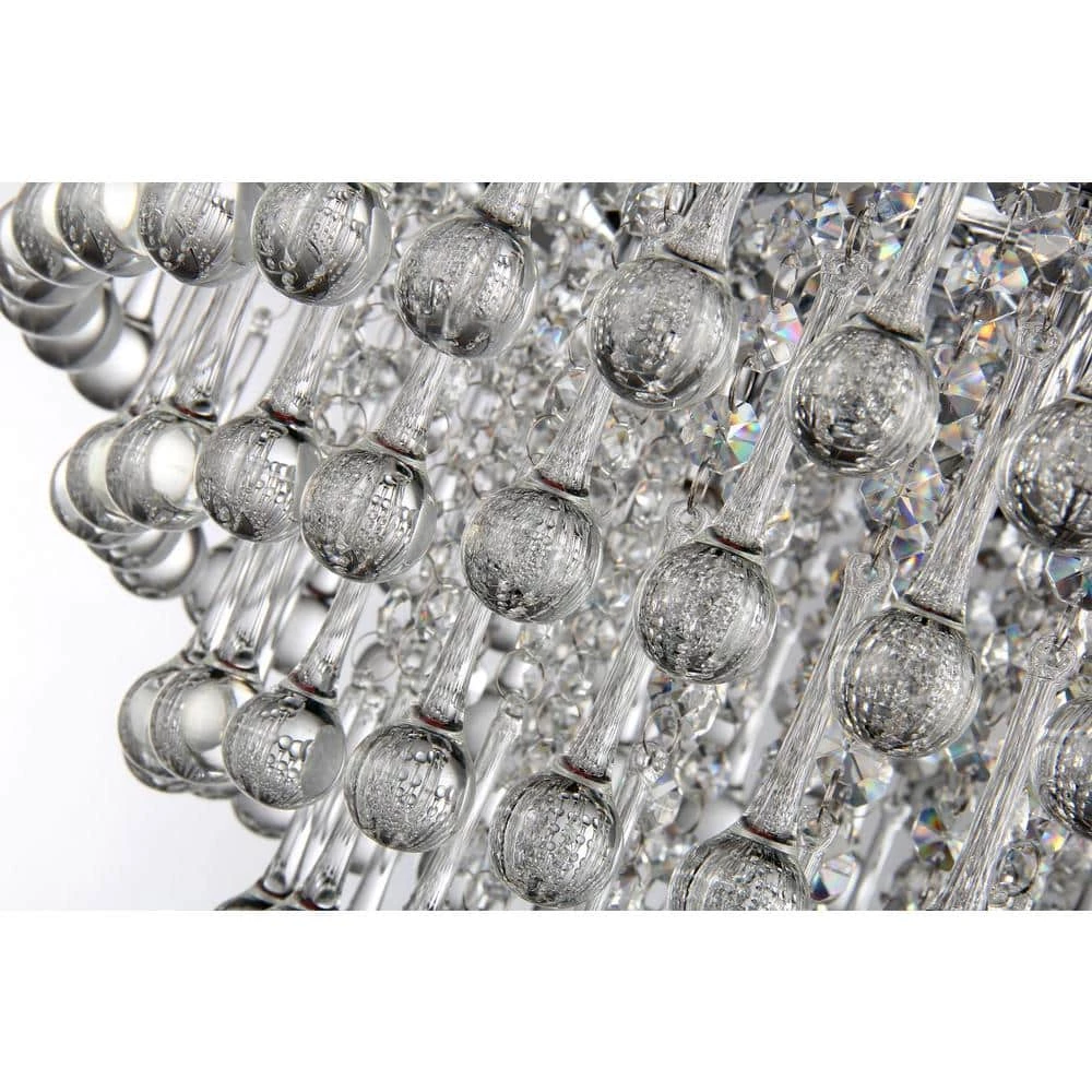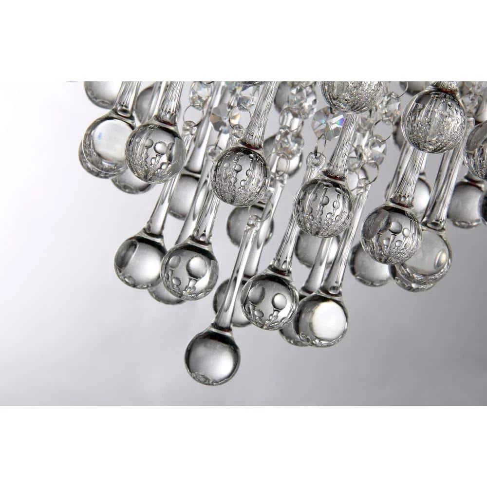 This exquisite crystal chandelier couples dazzling crystals with a shiny chrome finish to create a stunning focal point in your favorite space. The 5-lights of this modern chandelier are surrounded by 7-layers of elongated teardrop crystals that are each capped with a gentle sphere in a symmetrical cascade. The chrome hardware and 3 adjustable metal chords measure at 40 in. making this chrome chandelier ideal for multiple ceiling heights and room sizes.