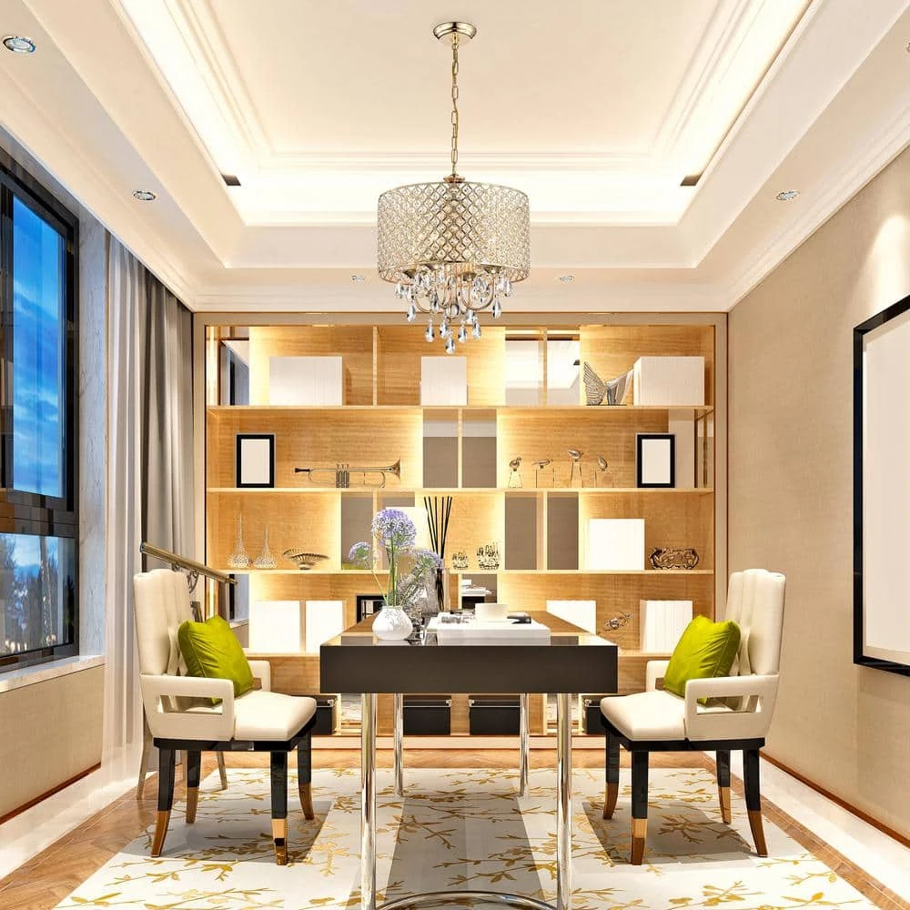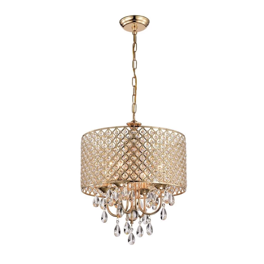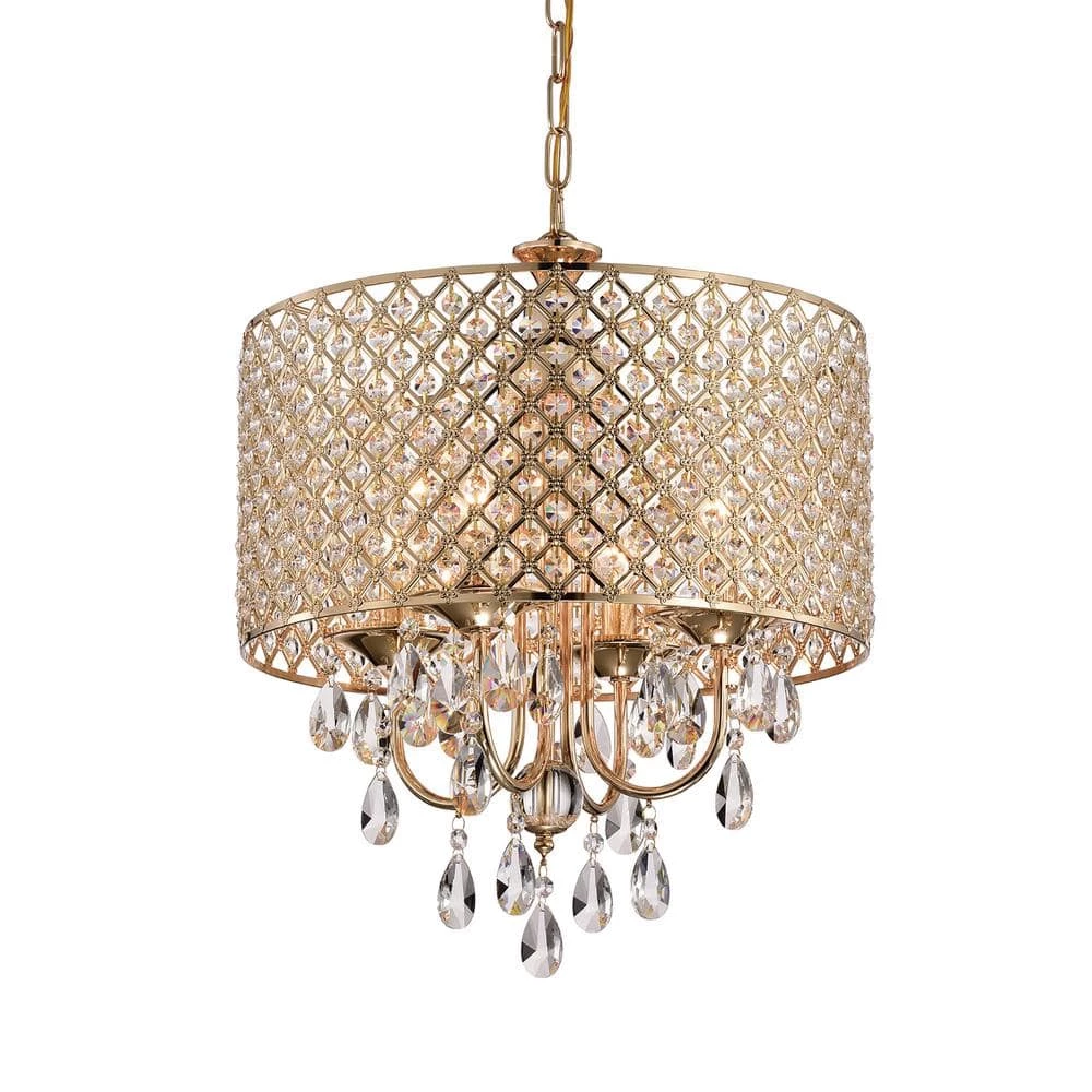 Enhance your entryway, kitchen, dining room, bedroom, and closet with the elegance and glamour of this 4-light chandelier. Featuring a crystal encrusted drum shade and cascading crystals, this glam chandelier makes a statement with its striking gold finish. The upward facing lights cast an ambient glow in the room and sets a mood of drama and romanticism that is perfect for any situation. The chain is 40 in. L and is adjustable. This modern chandelier can be shortened by removing some links, which makes it perfect for practically any ceiling height or room size.