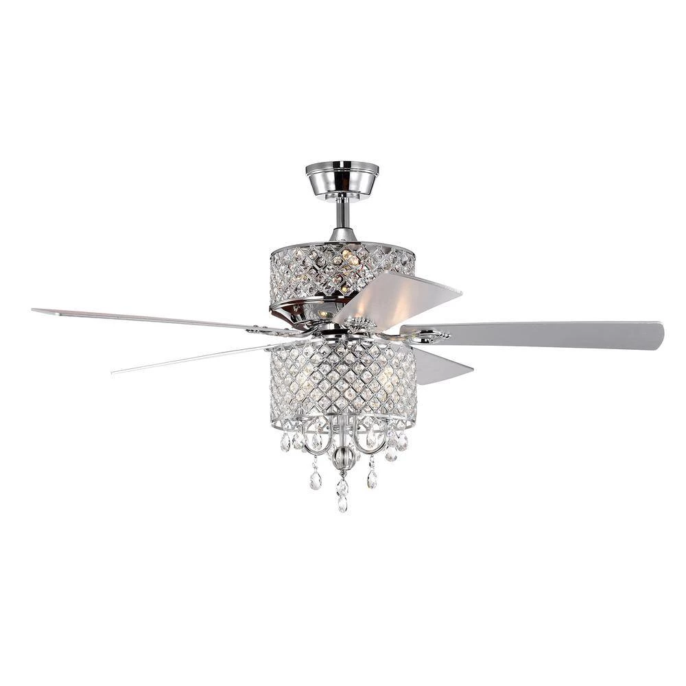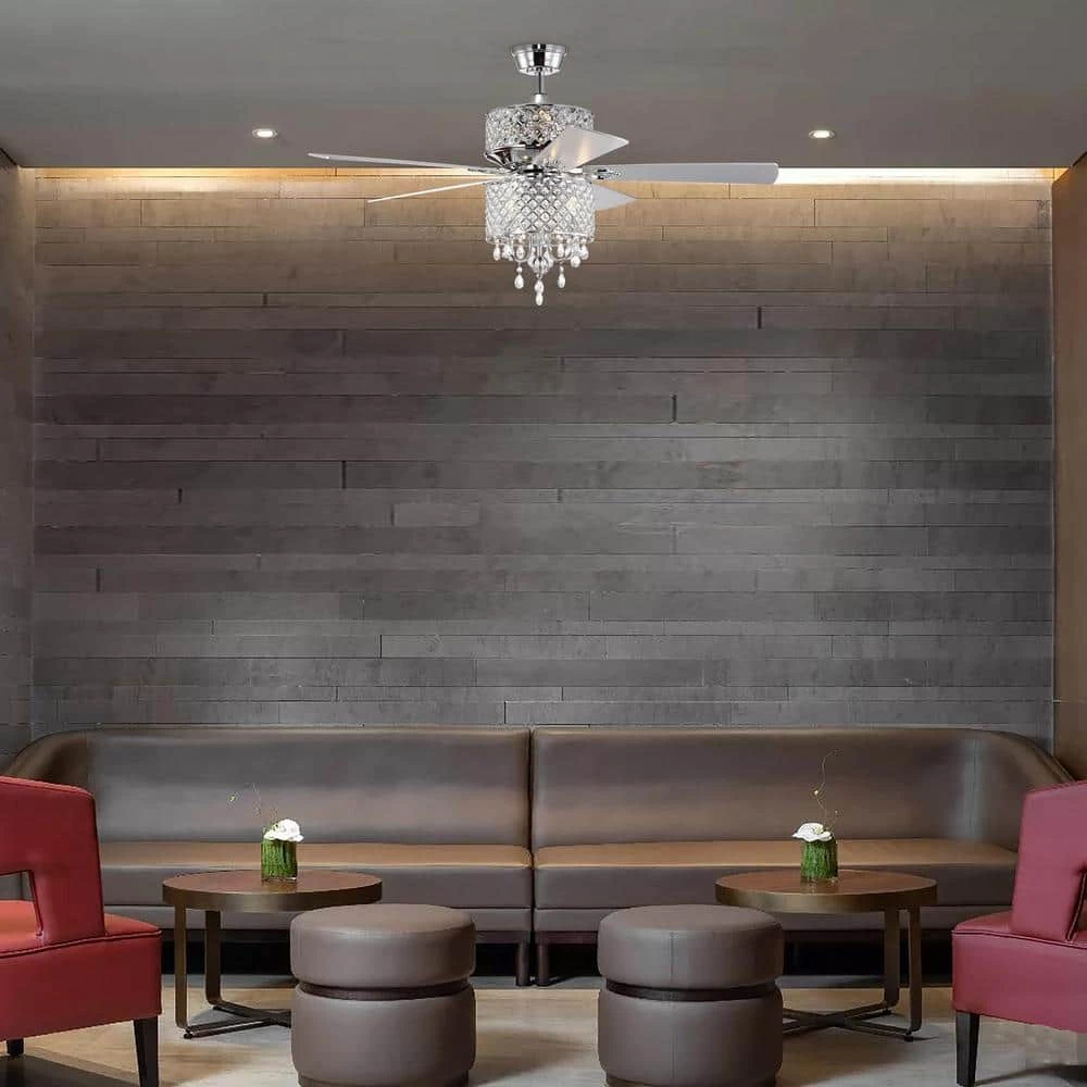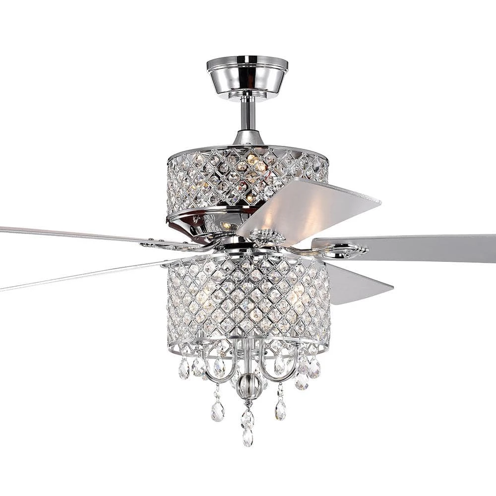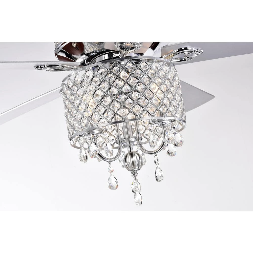This stunning chrome ceiling fan provides ample airflow to your indoor spaces while gracing your home with ambient light. The crystal light kit features six E12 candelabra style bulbs covered by a beautifully crafted lattice drum shade that casts a soft reflection of light and hanging crystals for added glamour in the living room or bedroom. Easy to install with 2 different mounting options: close or, standard down rod (as pictured). The reversible motor allows this glam ceiling fan to not only cool during the summer but helps keep your rooms warm during the winter.