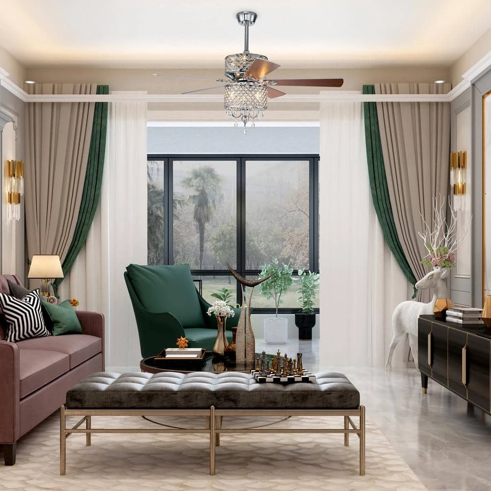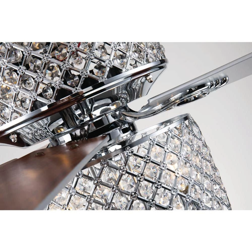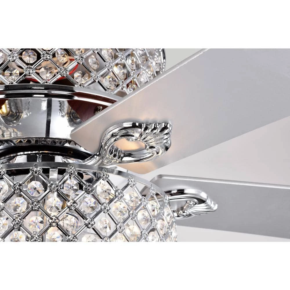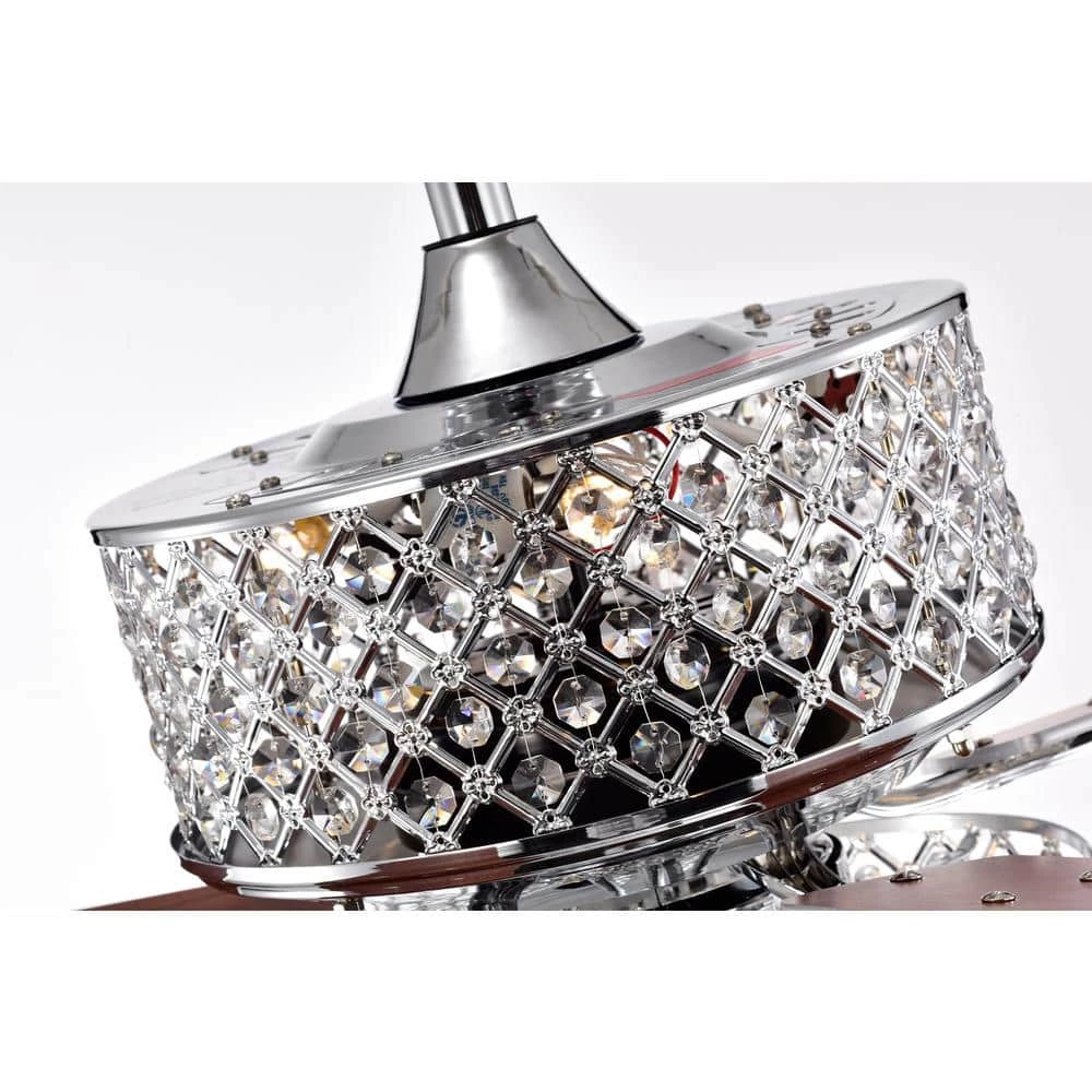 This stunning chrome ceiling fan provides ample airflow to your indoor spaces while gracing your home with ambient light. The crystal light kit features six E12 candelabra style bulbs covered by a beautifully crafted lattice drum shade that casts a soft reflection of light and hanging crystals for added glamour in the living room or bedroom. Easy to install with 2 different mounting options: close or, standard down rod (as pictured). The reversible motor allows this glam ceiling fan to not only cool during the summer but helps keep your rooms warm during the winter.