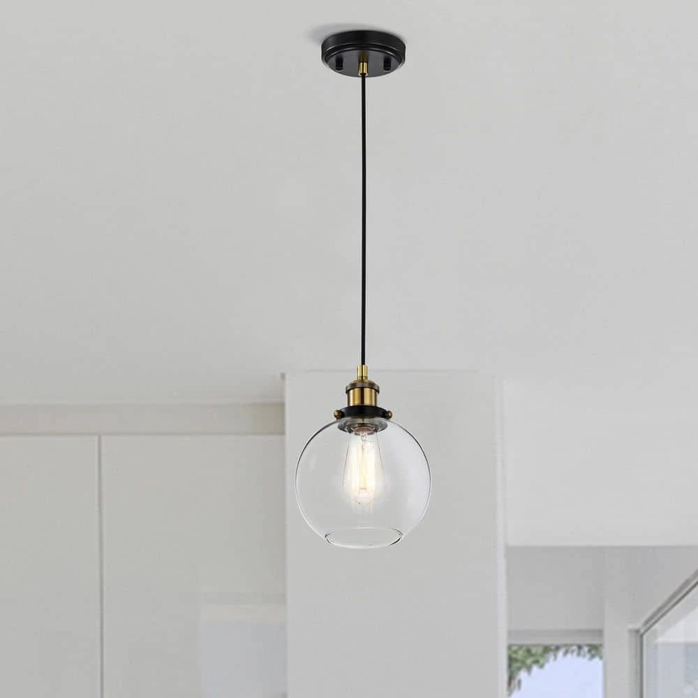 The Mateo 1 light pendant features a black and antique brass finish complete with a clear globe glass shade that allows plenty of light to illuminate any room. At 7 in. W x 9.5 in. H, the minimalist design of this modern mini pendant will beautifully adorn any room. This mini pendant is perfect for pairing above the kitchen island, office, breakfast bar, bedroom or dining room.