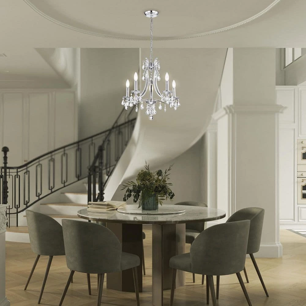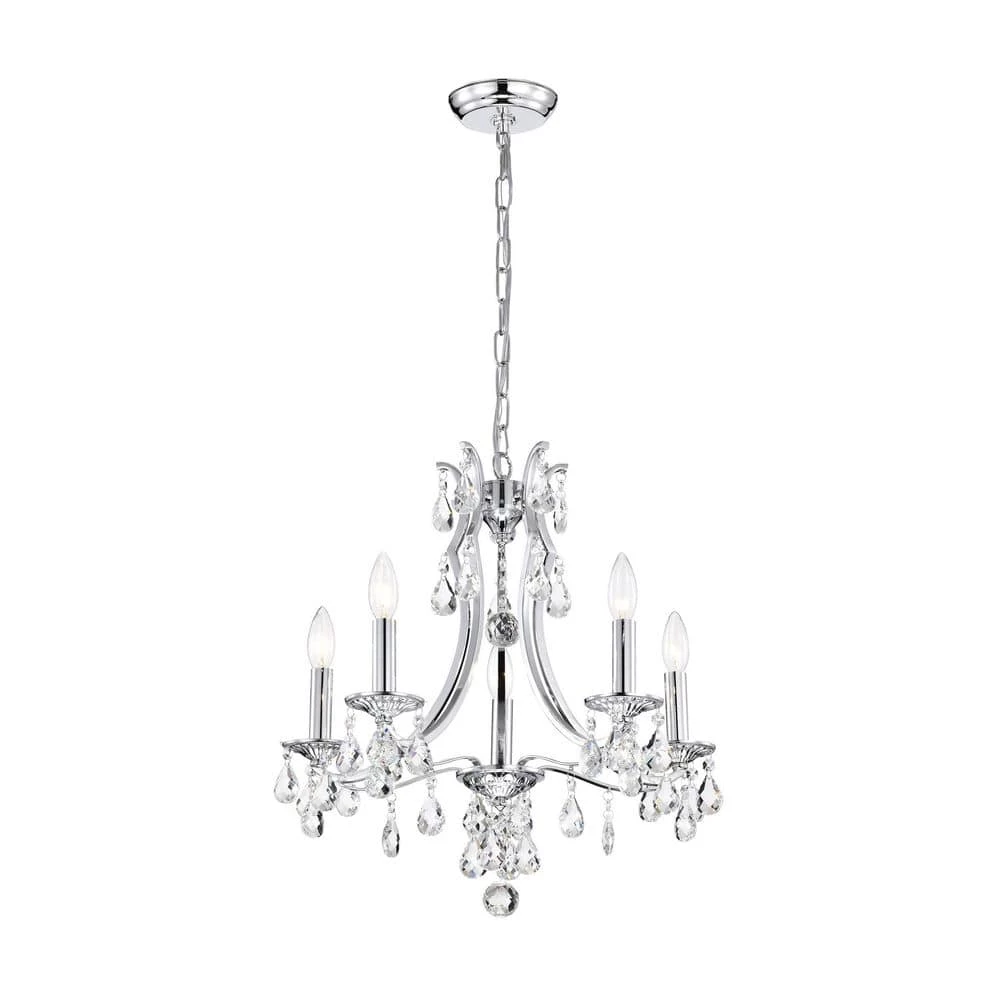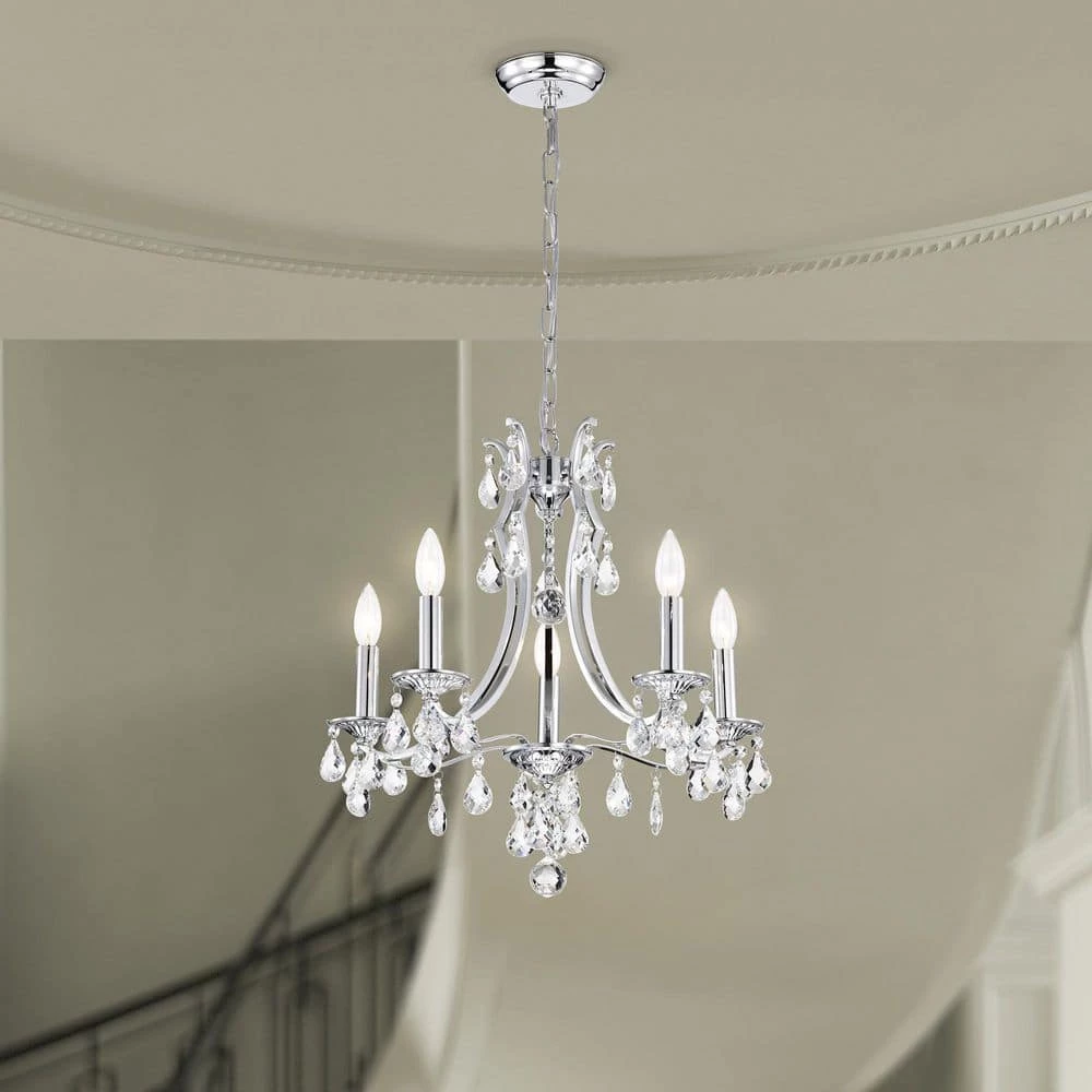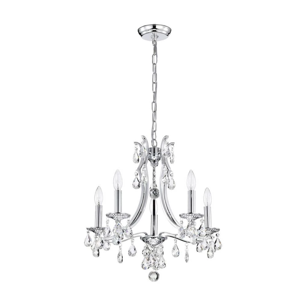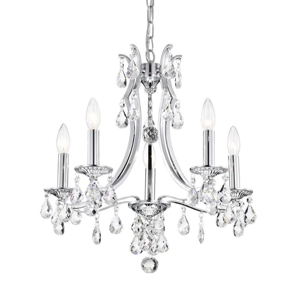 Elevate your home with the elegant Miranda 5-light crystal chandelier. At first sight, the style of this chandelier may seem classic and traditional, however there are subtle details that take this light to the next level. The slight curve of the chandelier arms are an unexpected, yet eye-catching detail. The bobeches feature intricate carvings that complement the multi-faceted teardrop crystals. The chrome finish of this chandelier is sure to reflect the five E12 candelabra bulbs (not included), sending sparkles and shimmer throughout any room. Place this chandelier above the entryway, dining room, or living room for an enchanting ambiance. For ease of installation, this chandelier is equipped with an adjustable 40 in. chain that may be shortened to suit a variety of different ceiling heights or room sizes. We recommend adding a dimmer switch with dimmable bulbs to adjust the mood accordingly.