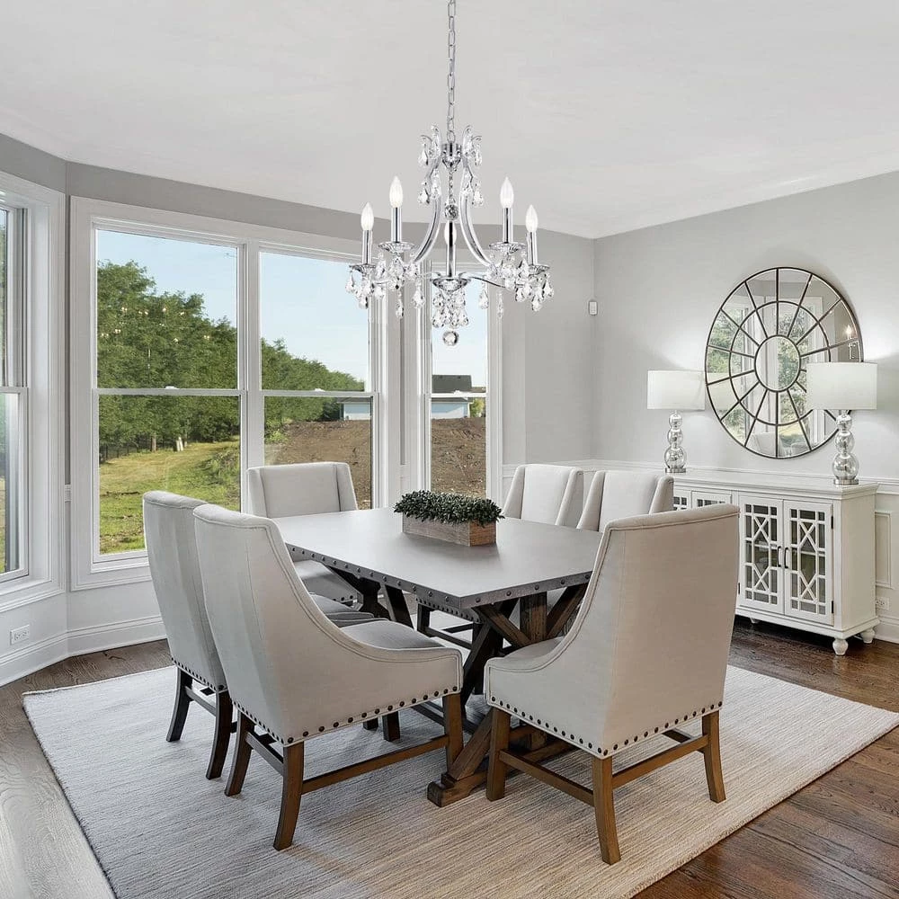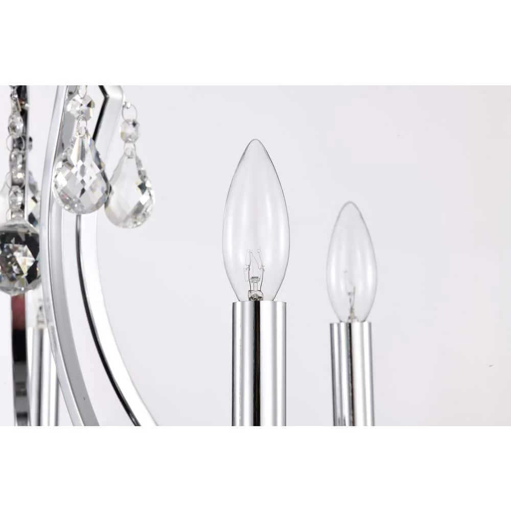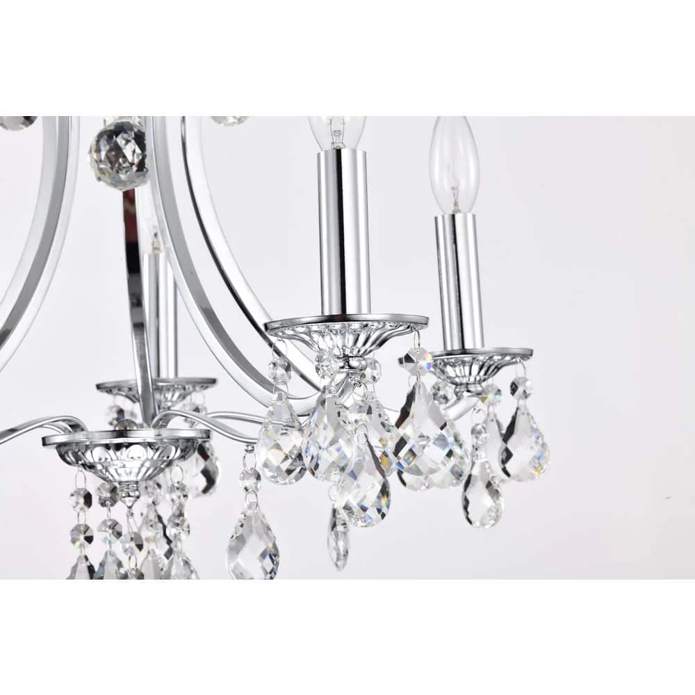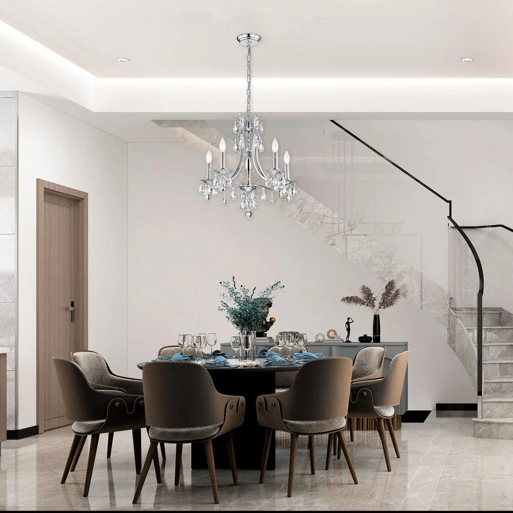 Elevate your home with the elegant Miranda 5-light crystal chandelier. At first sight, the style of this chandelier may seem classic and traditional, however there are subtle details that take this light to the next level. The slight curve of the chandelier arms are an unexpected, yet eye-catching detail. The bobeches feature intricate carvings that complement the multi-faceted teardrop crystals. The chrome finish of this chandelier is sure to reflect the five E12 candelabra bulbs (not included), sending sparkles and shimmer throughout any room. Place this chandelier above the entryway, dining room, or living room for an enchanting ambiance. For ease of installation, this chandelier is equipped with an adjustable 40 in. chain that may be shortened to suit a variety of different ceiling heights or room sizes. We recommend adding a dimmer switch with dimmable bulbs to adjust the mood accordingly.