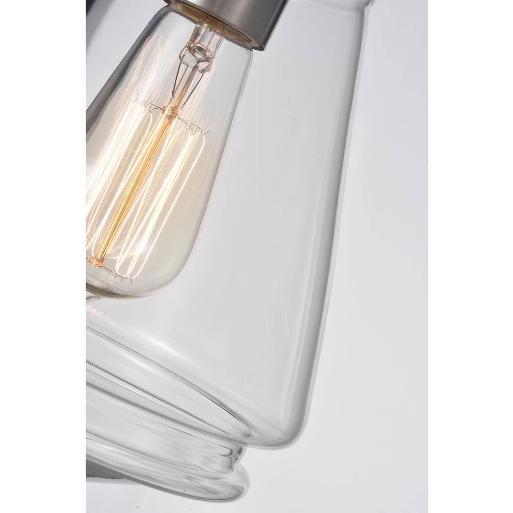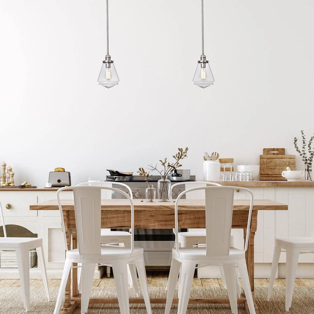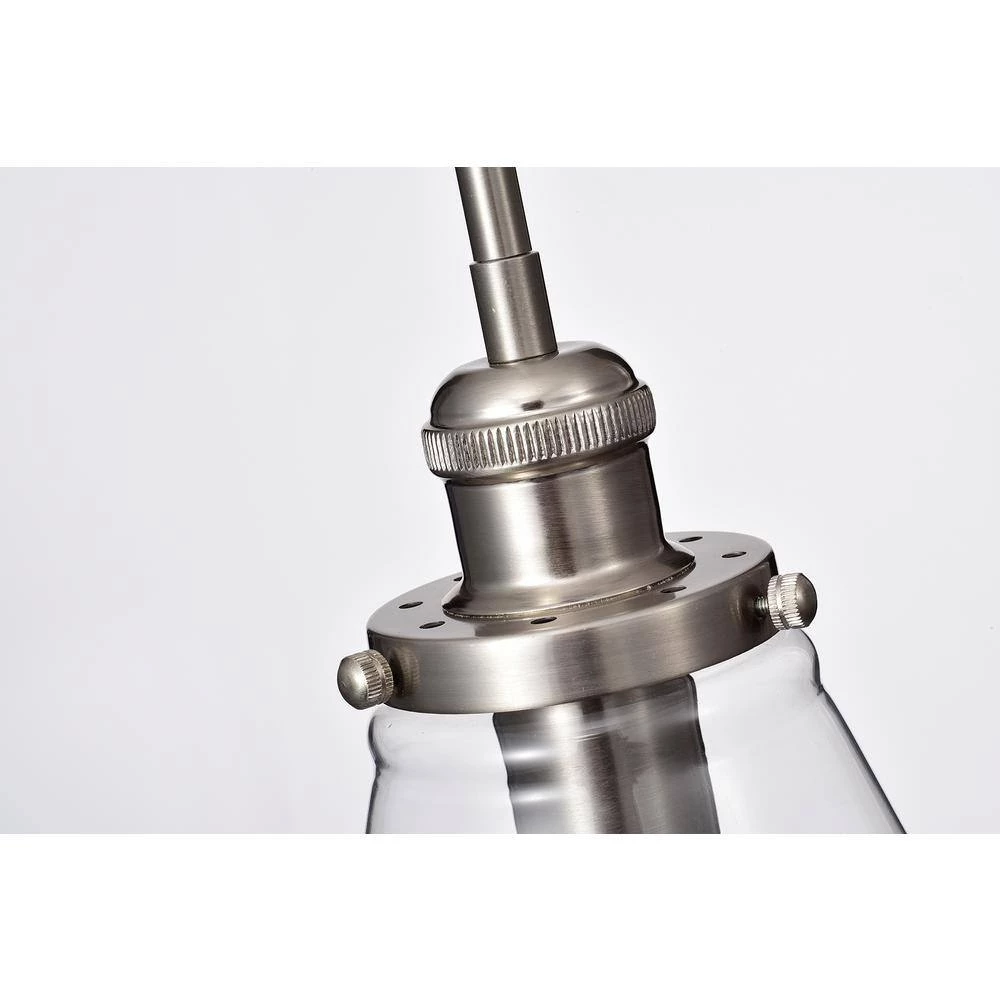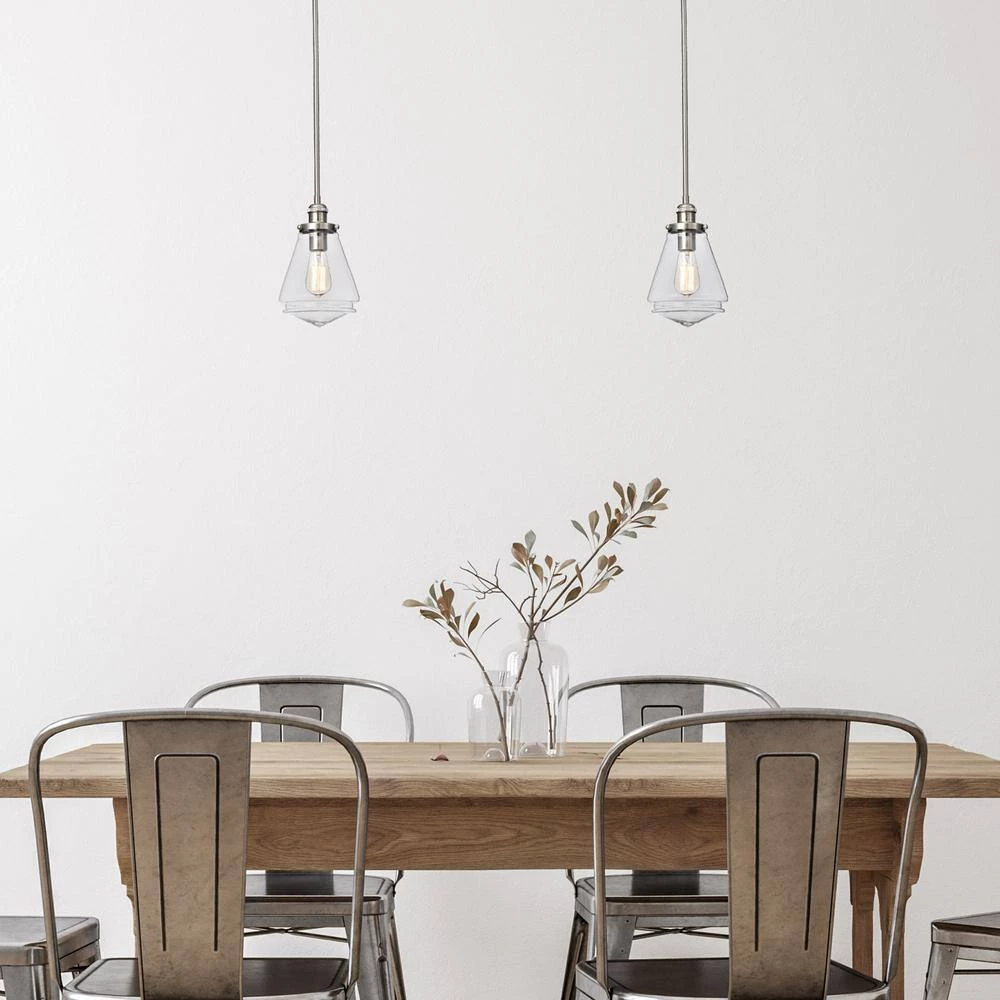 Sleek and modern, this clear glass mini pendant is fabulous. This modern pendant light features a brushed nickel finish with a bell-shaped enclosed clear handblown glass shade. Perfect for your kitchen island or table, its urban theme will complement many transitional, loft and urban kitchen decors. This brushed nickel pendant light comes with 4 rods that allow you to hang this piece at your desired height.