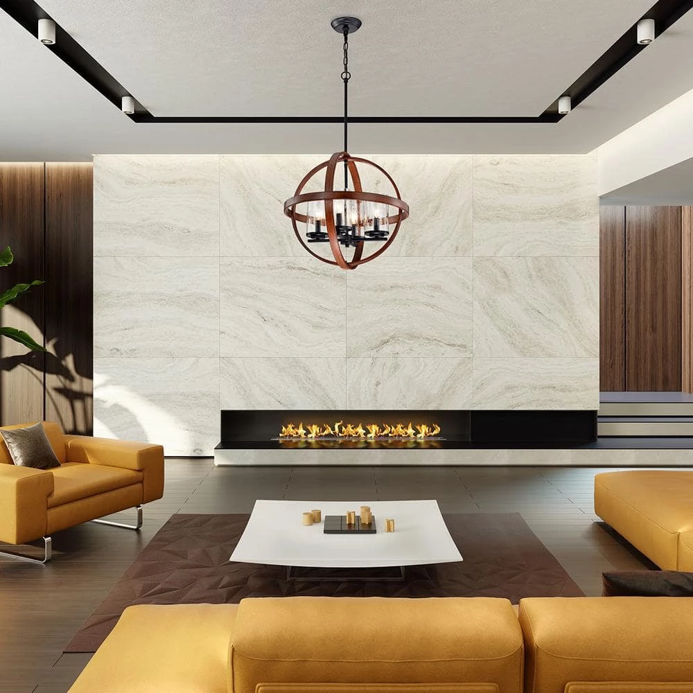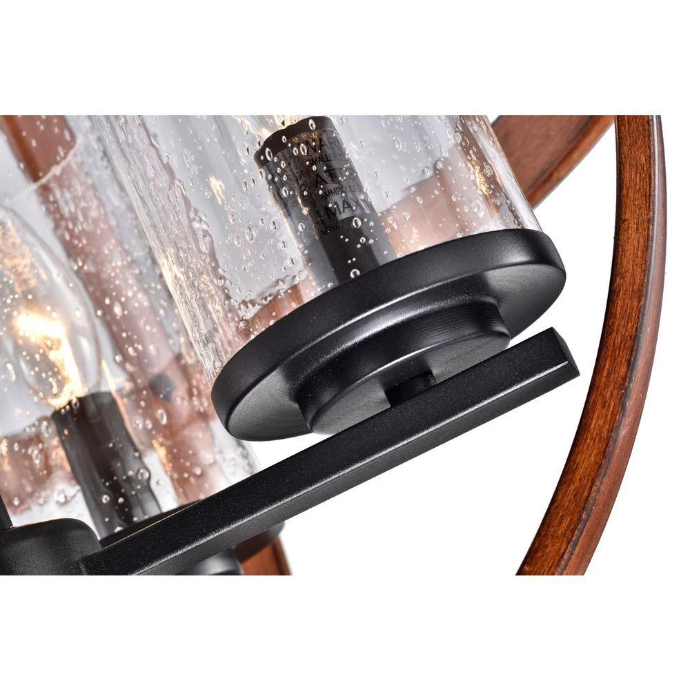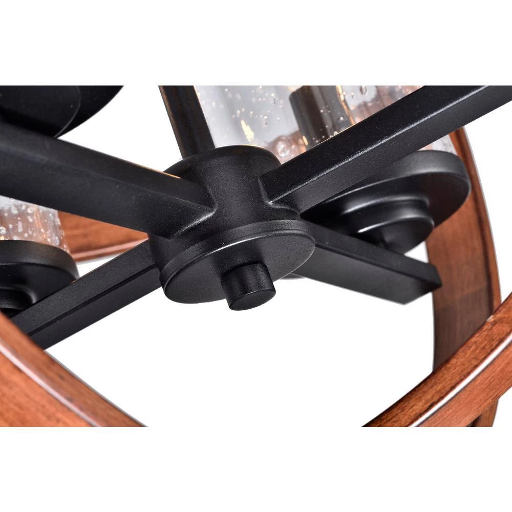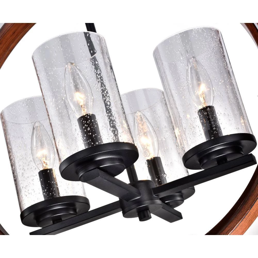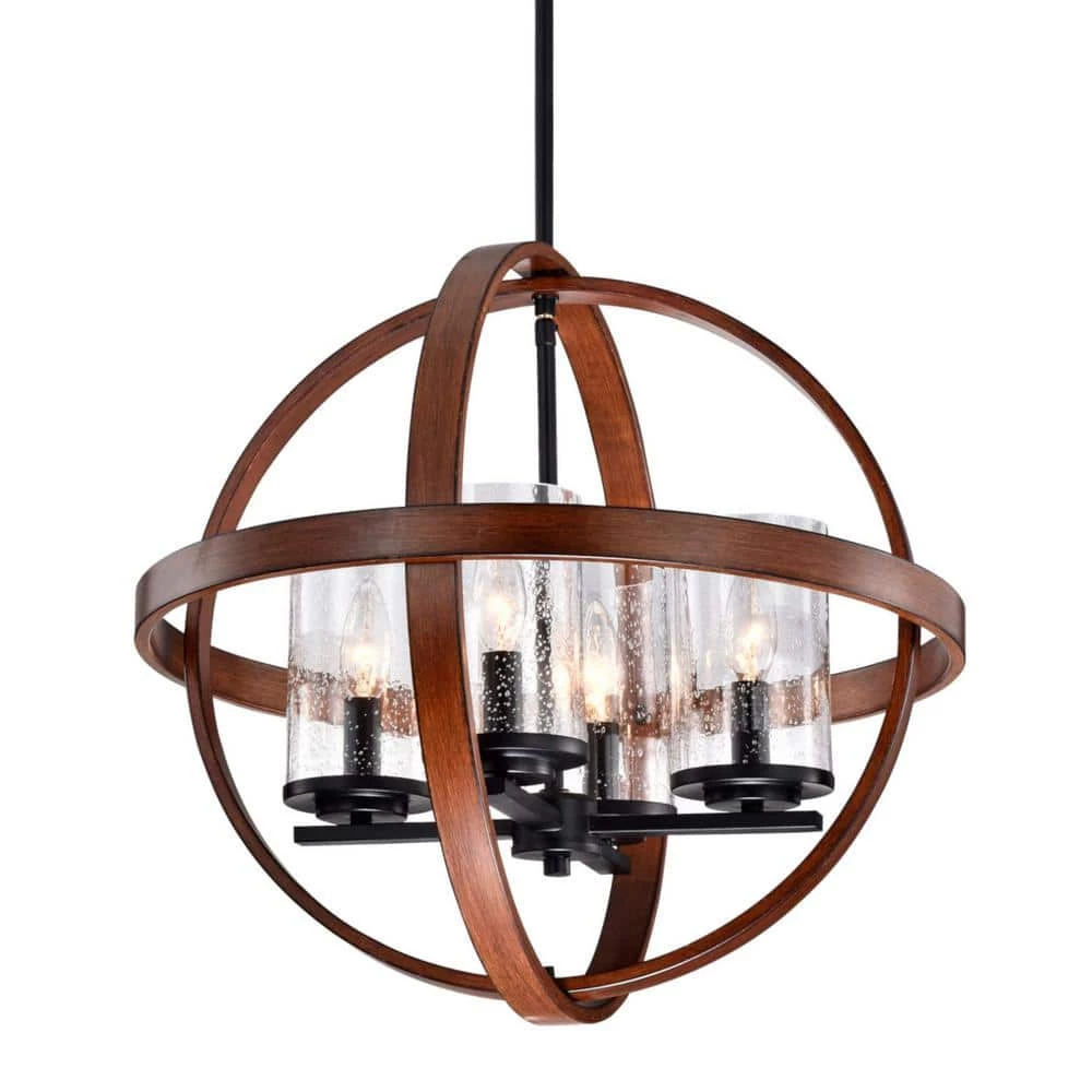 This sphere shaped chandelier mixes wood and black textured finishes to create a rustic Modern Farmhouse Lighting design. This modern farmhouse chandelier is sure to spark interest, whether thecandle-like bulbs are illuminated or not. Beautiful seeded glass sconces surround each glowing bulb. The included rod and chain are designed to be adjustable to create a custom hanging position.