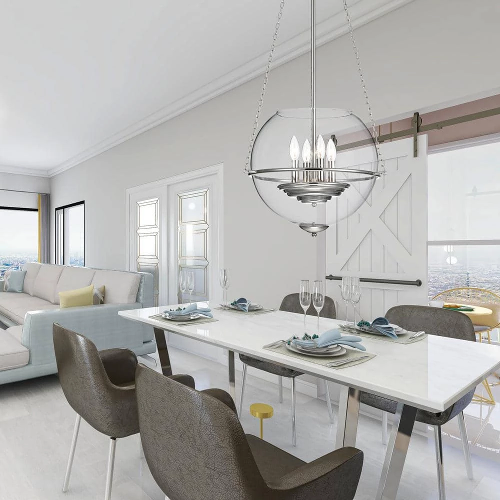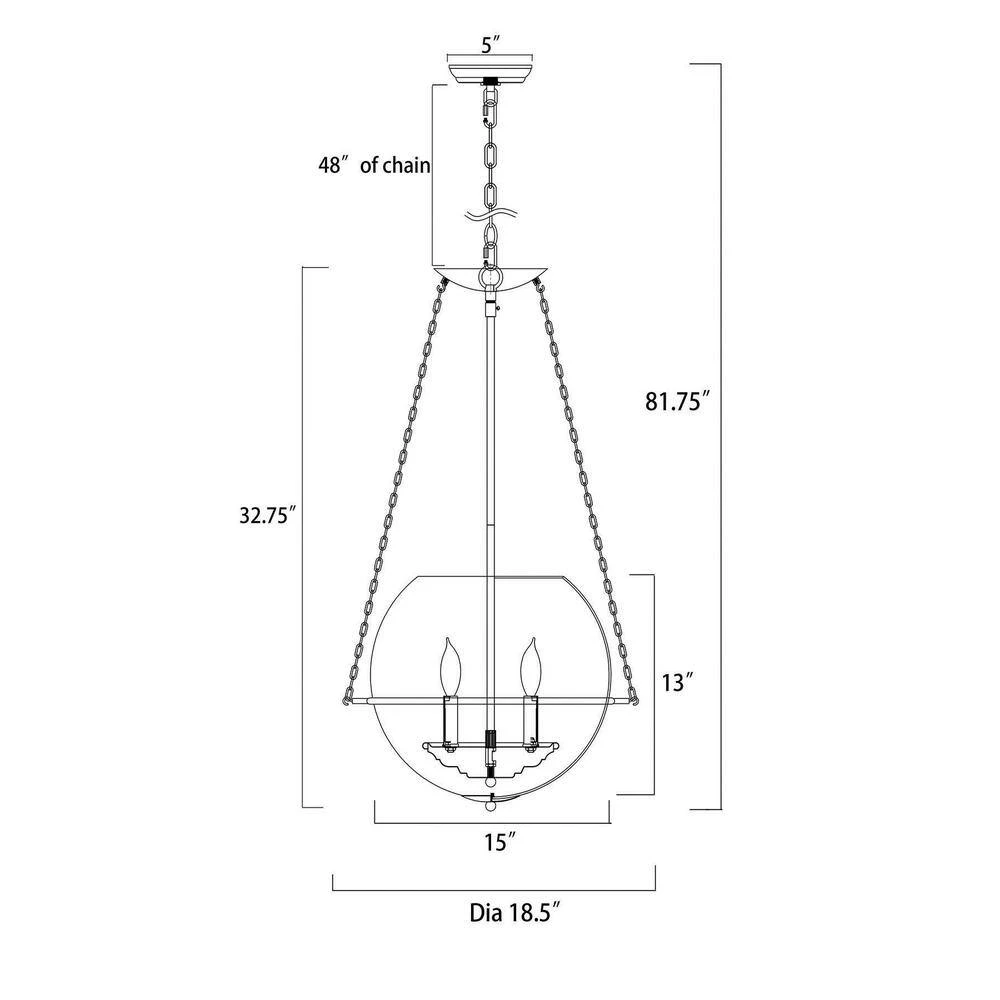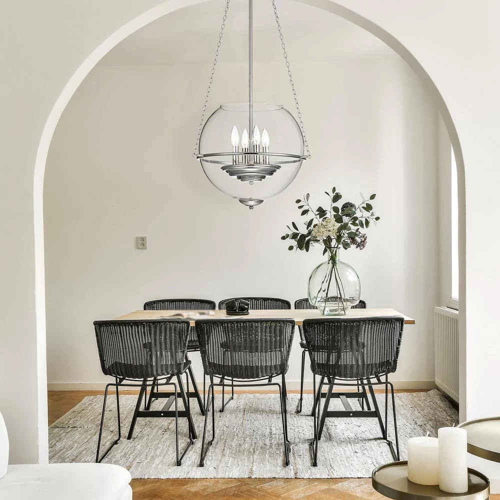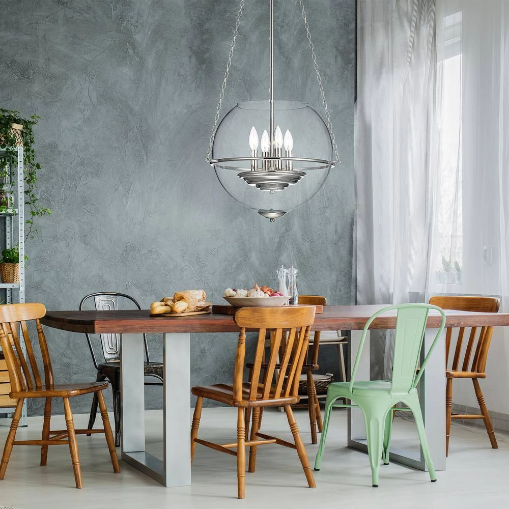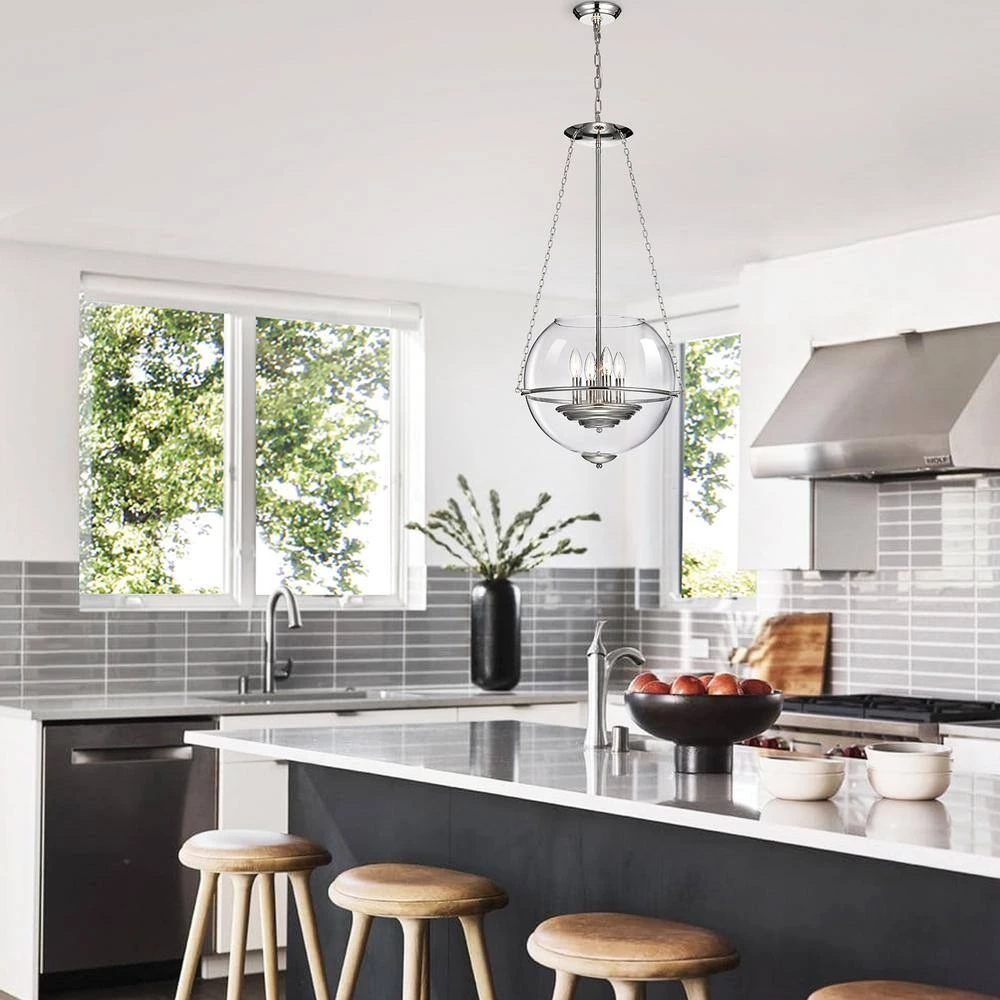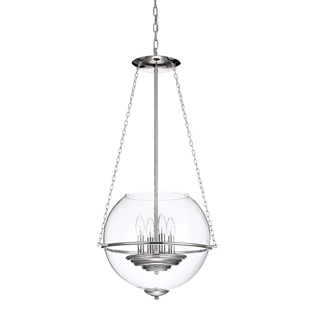 Complete your dining room or kitchen island with this contemporary chandelier. The polished nickel hardware of this modern chandelier sets off the large 15 in. clear glass globe and creates a visual impact in any space. Featuring 4 E12 base lights, try installing some exposed modern filament bulbs to this clear glass chandelier for an added impact. The 48 in. chain can be adjusted by removing links and allows for a custom hanging height.