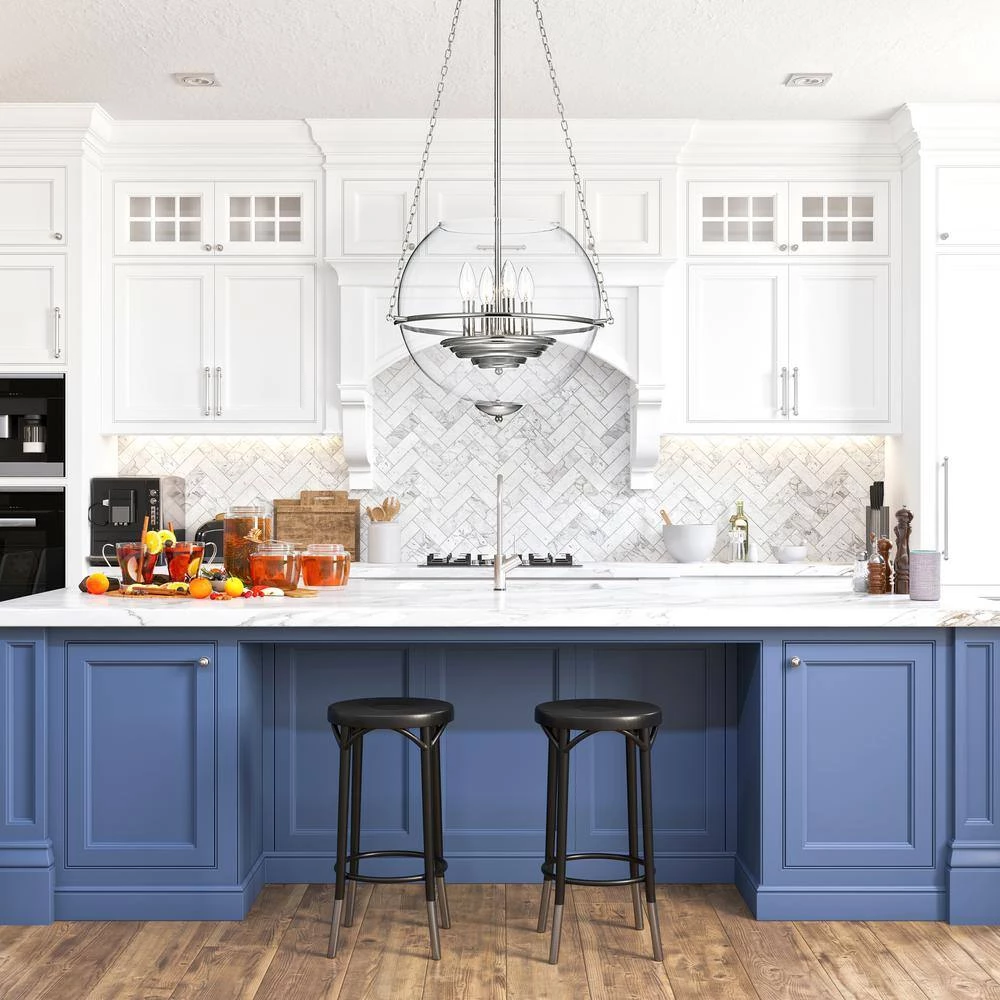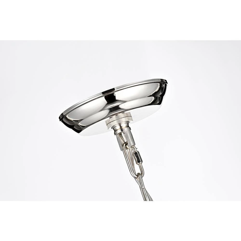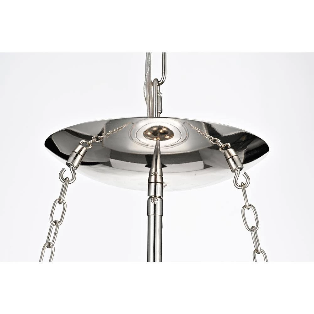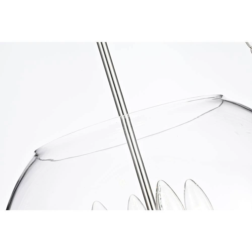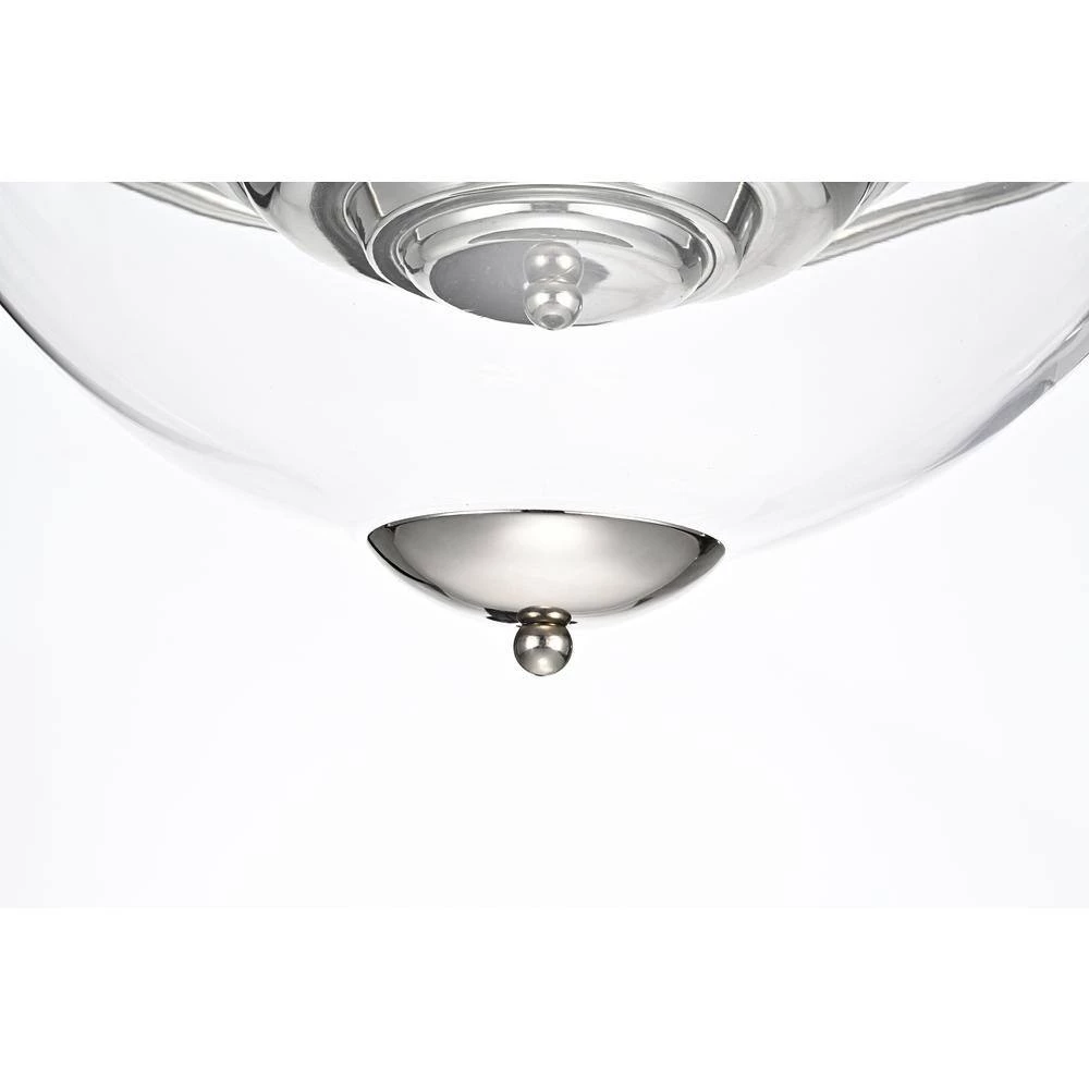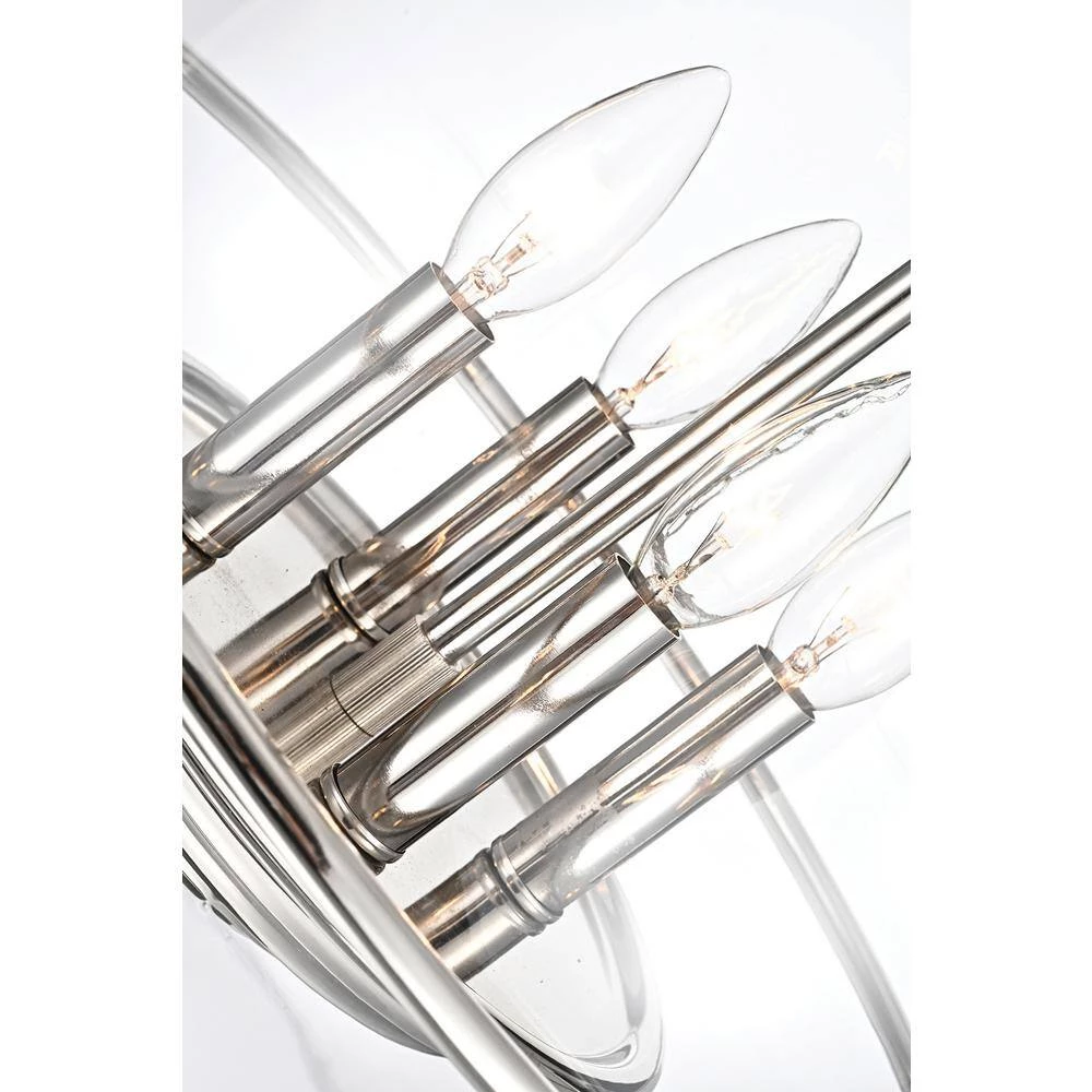 Complete your dining room or kitchen island with this contemporary chandelier. The polished nickel hardware of this modern chandelier sets off the large 15 in. clear glass globe and creates a visual impact in any space. Featuring 4 E12 base lights, try installing some exposed modern filament bulbs to this clear glass chandelier for an added impact. The 48 in. chain can be adjusted by removing links and allows for a custom hanging height.