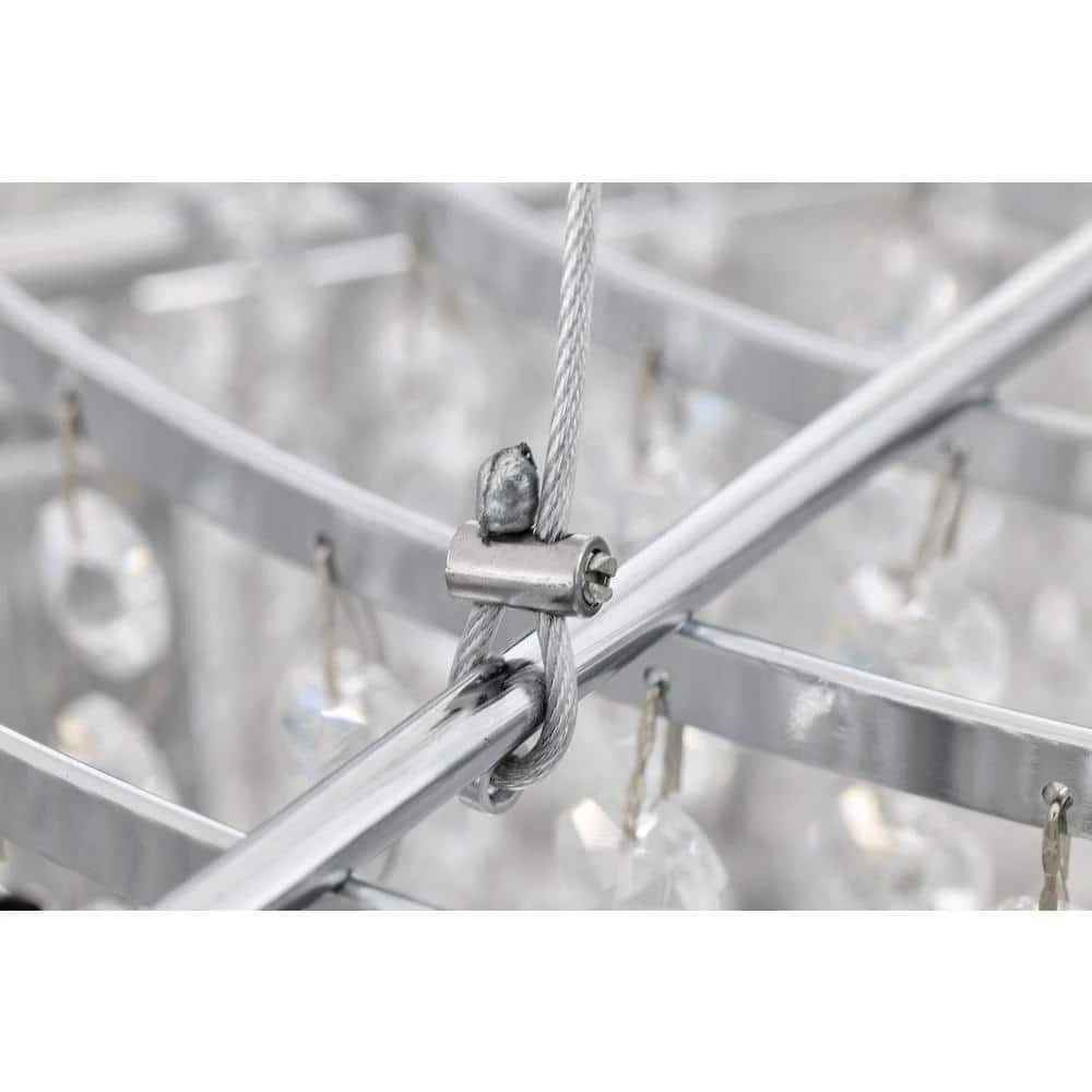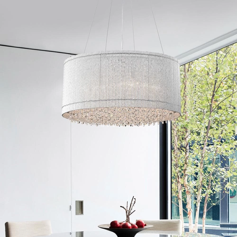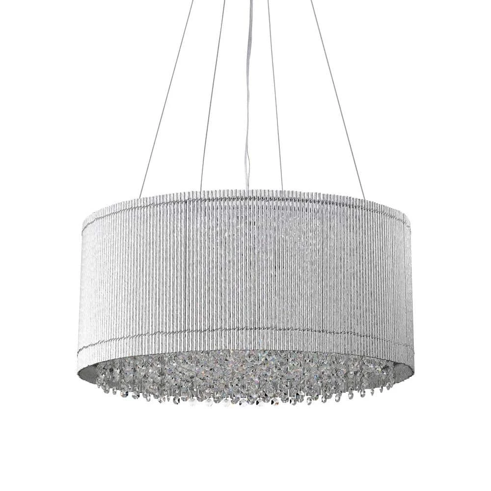 This modern and contemporary 5-light chandelier features etched chrome and sparkling crystal strands that add glam lighting to the home. The classic drum chandelier shade is formed by etched tubes that surround the bulbs to reflect the lights and crystals. The shiny chrome finish of this crystal chandelier complements contemporary furnishings for a timeless appearance. Hanging by four 59 in. wires, this light fixture may be adjusted to suit any ceiling height. The chrome finish, crystal strands, and drum shape make this light the perfect lighting solution as an entryway, dining room, or bedroom chandelier.