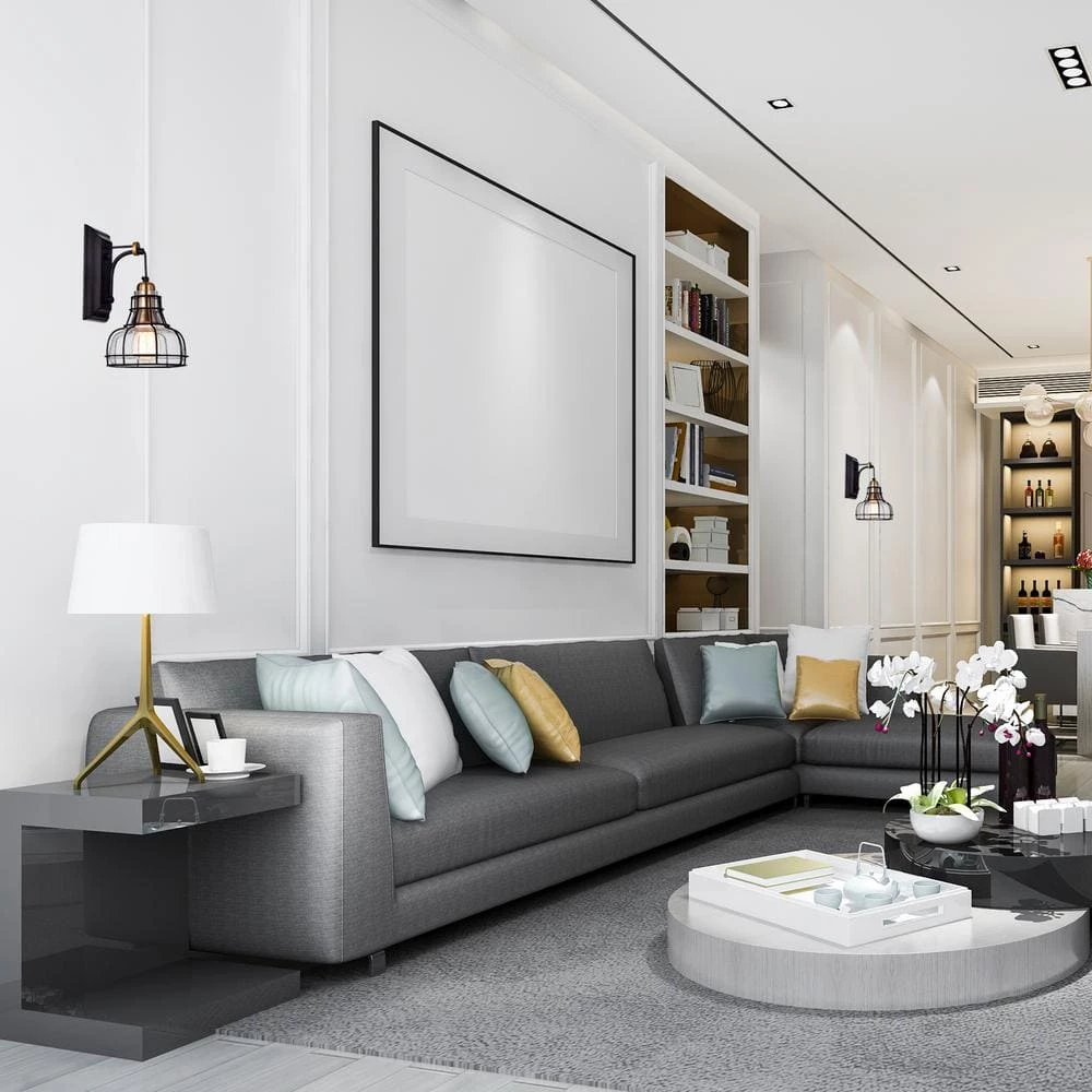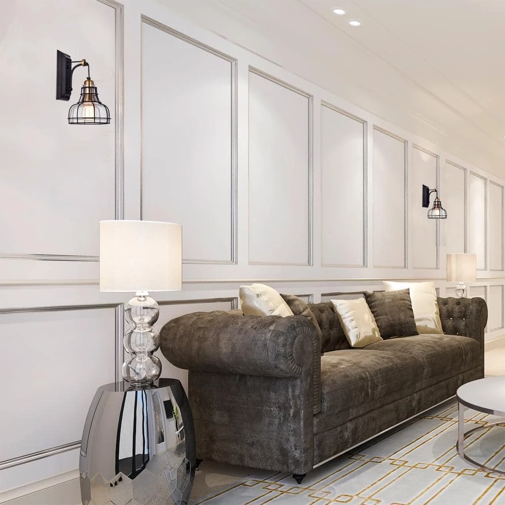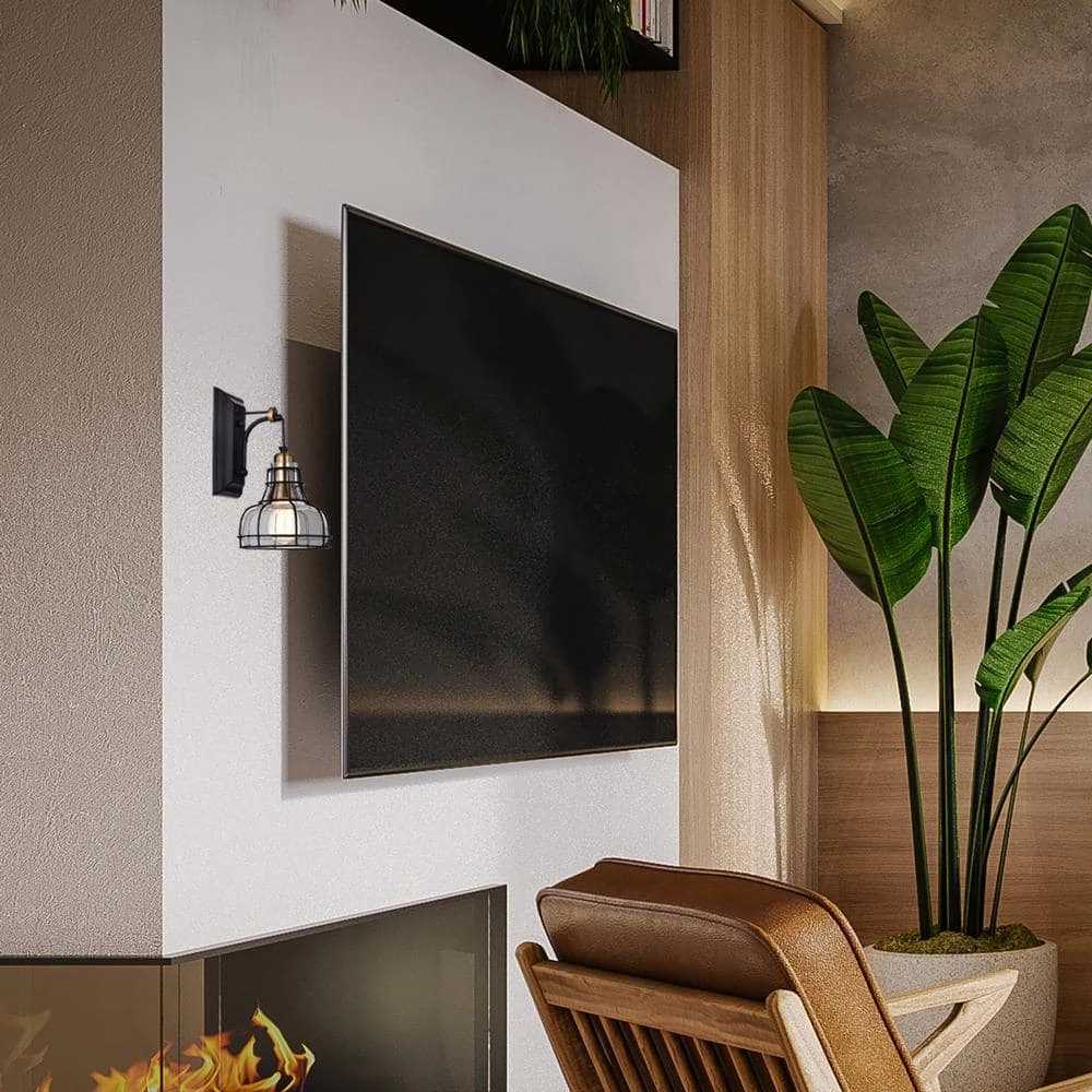 Embrace the industrial design movement with this black wall sconce. This stylish light fixture features a glass shade that is wrapped by a black metal cage. The combination of the black metal, the antique gold, and the thick cage wire give your space an industrial vibe. Use this modern wall sconce to create various levels of lighting in your entryway, hallway, living room, bed room, dining room or bathroom.