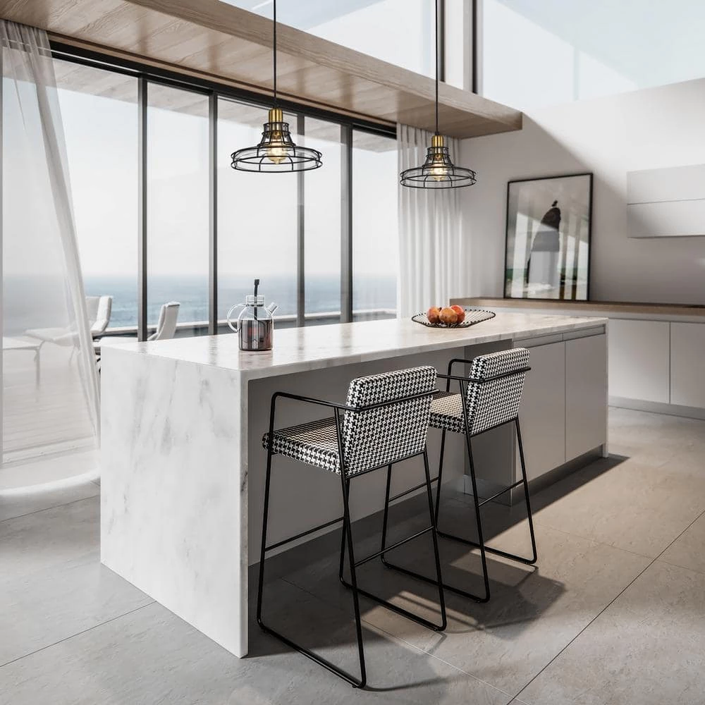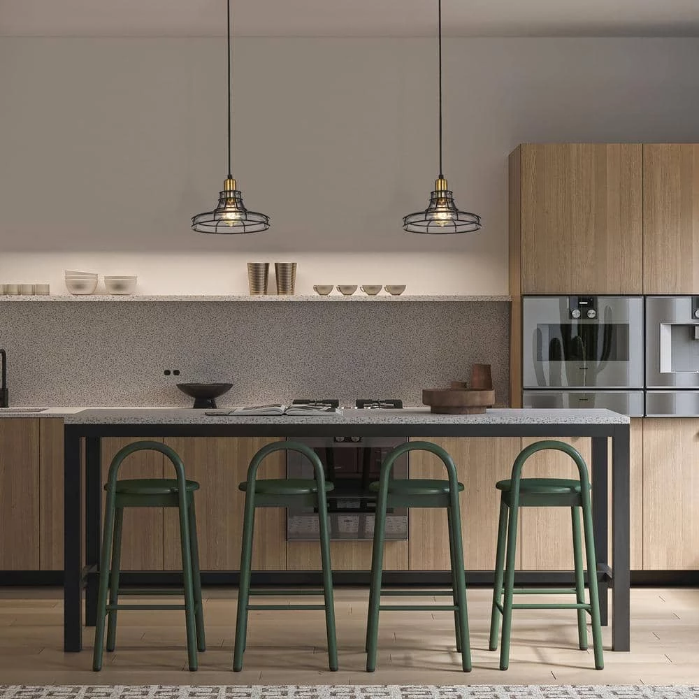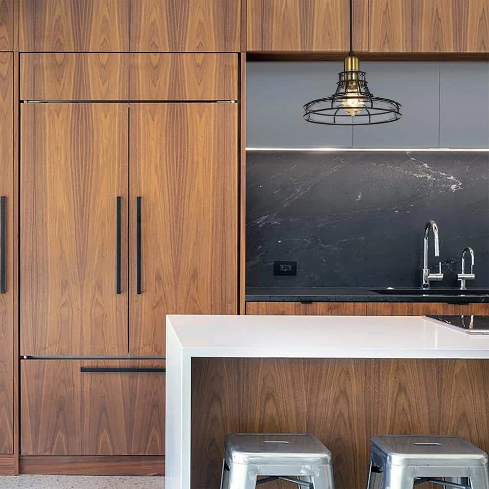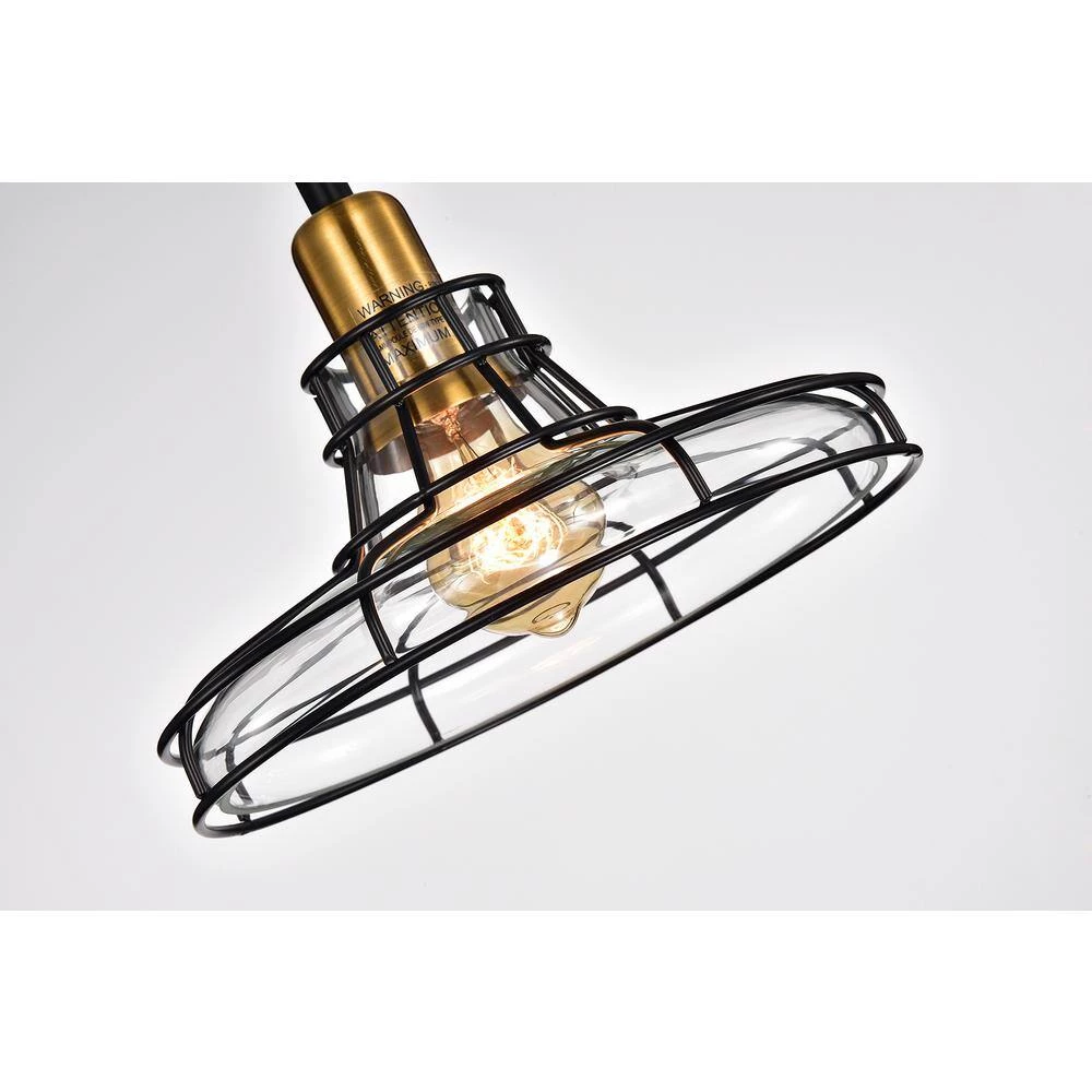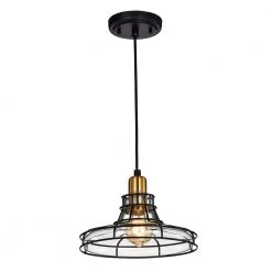 This stylish pendant features a glass shade that is wrapped by a black metal cage. The combination of the black metal, the antique gold and the wrapped wire give your space an industrial vibe. The 60 in. wire is adjustable and the fixture can be hung at a customized height.
