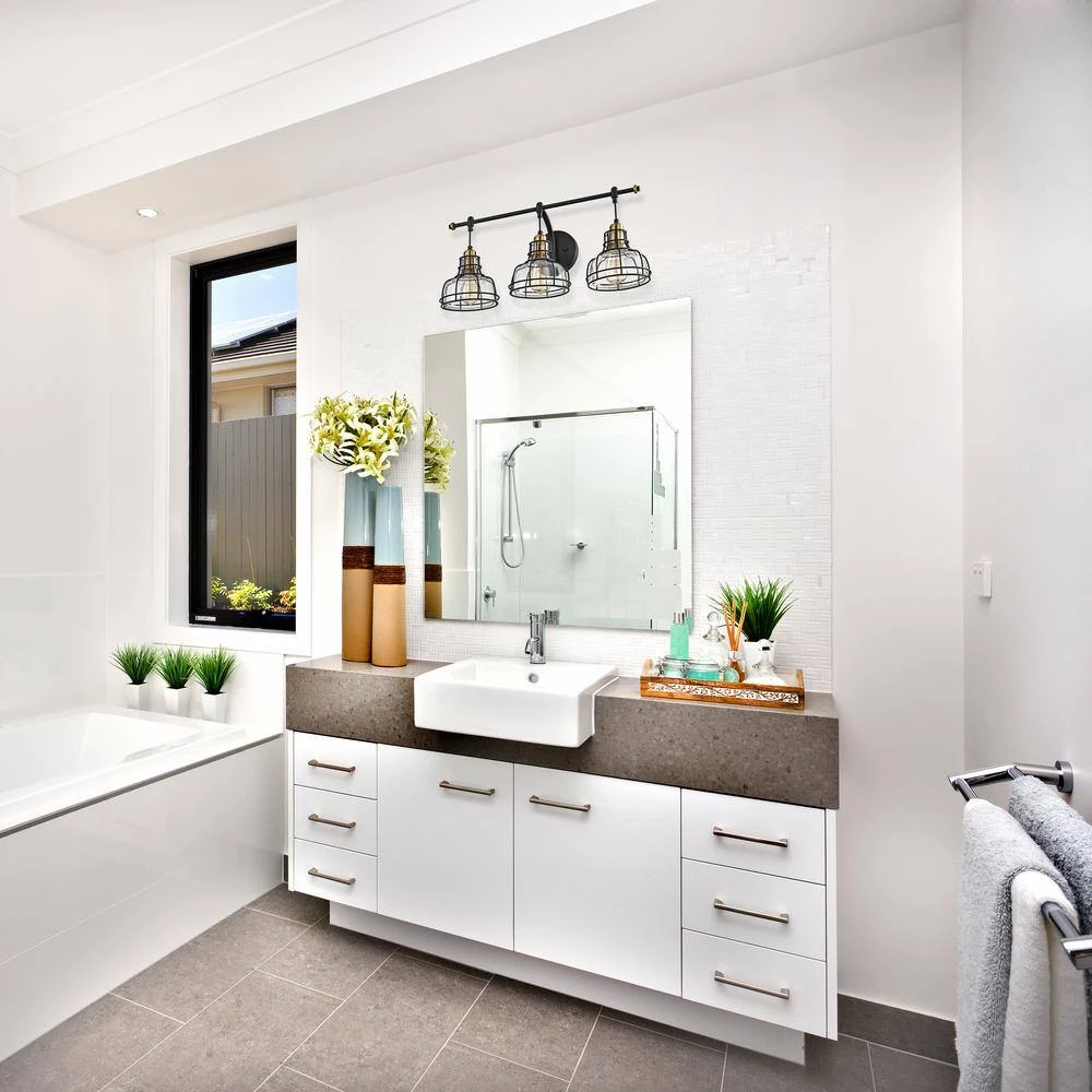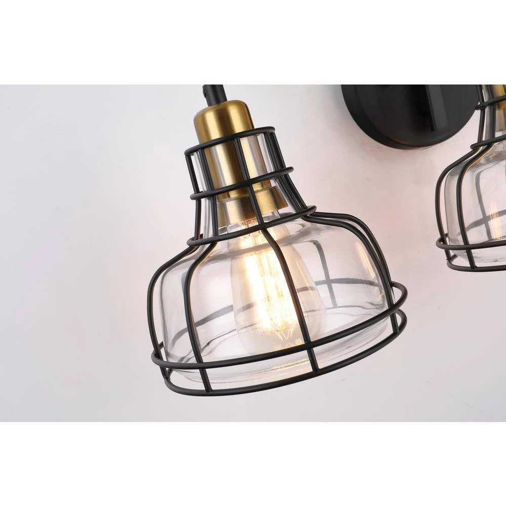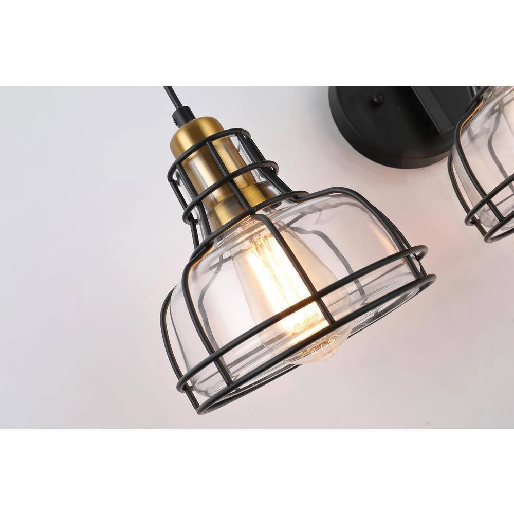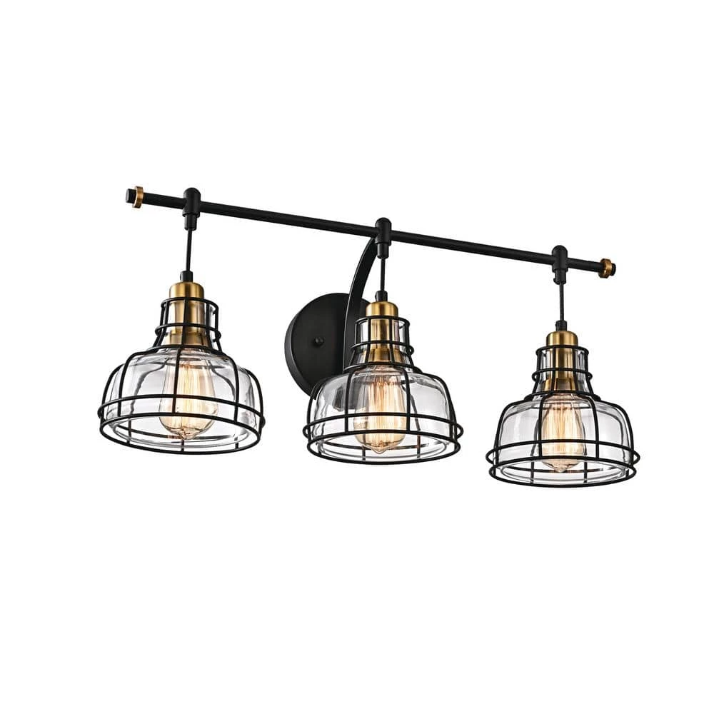 Embrace the industrial design movement with this industrial vanity. This stylish modern light fixture features 3 glass shades that are wrapped by a black metal cage. The combination of the black metal, the antique gold, and the thick cage wire of this black vanity light give the bathroom or bedroom an industrial vibe.