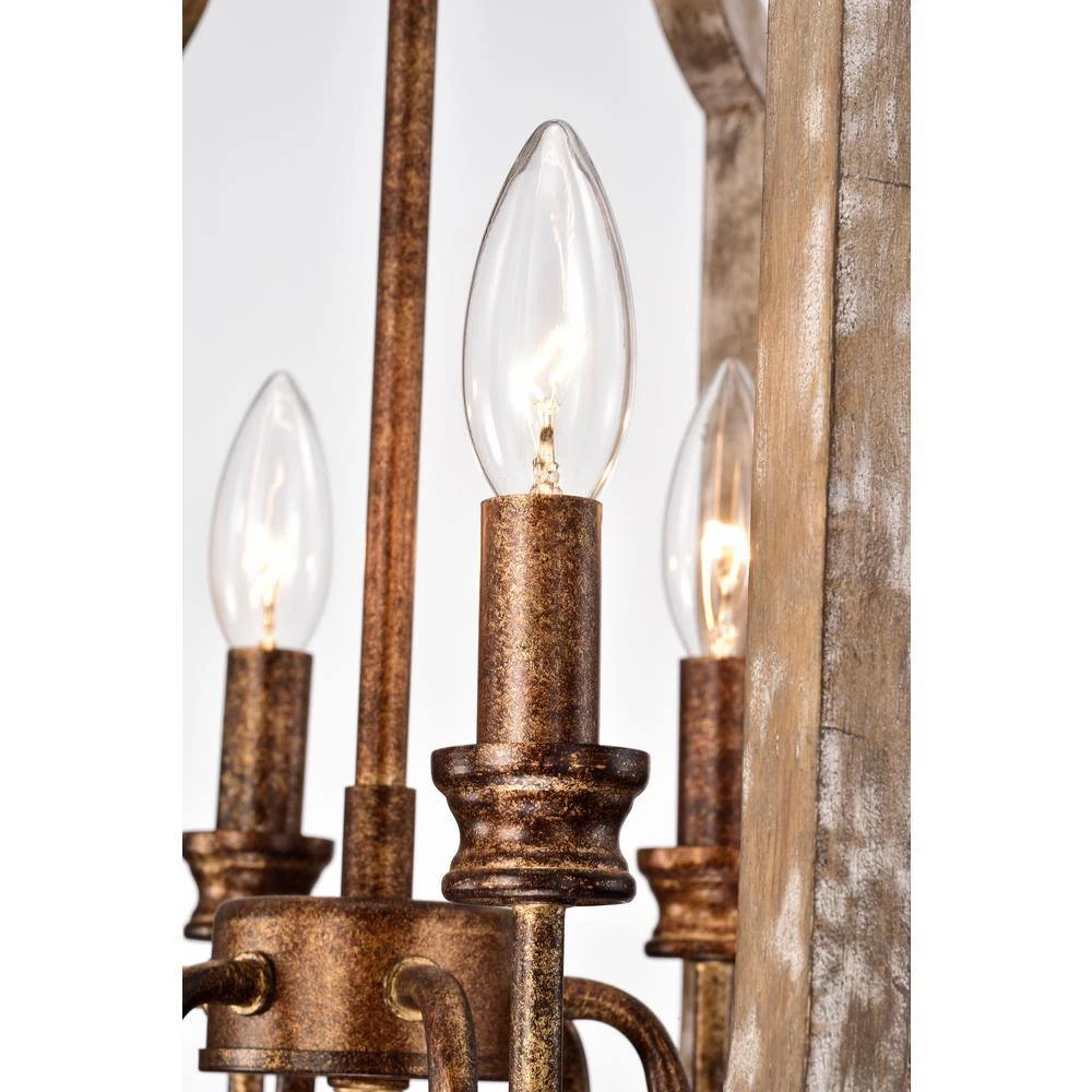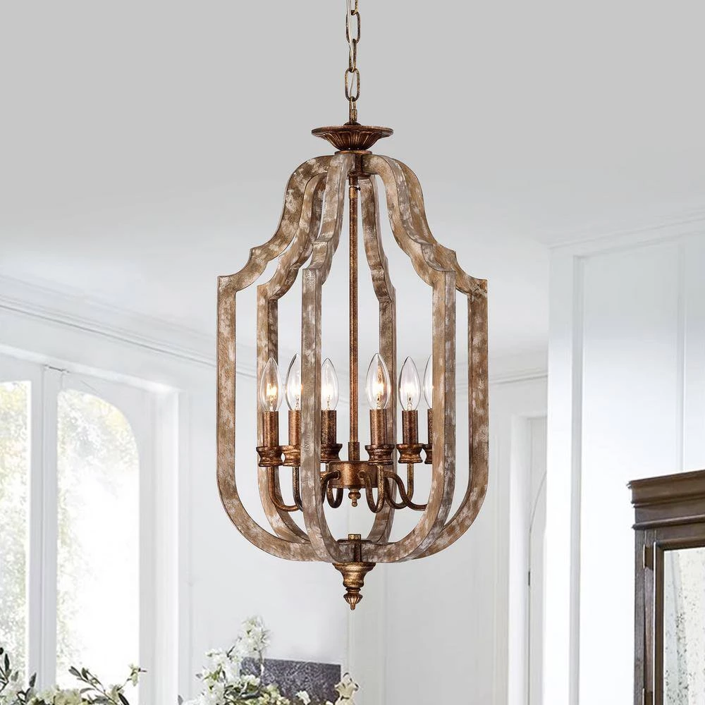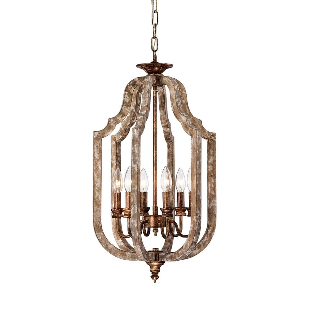 With a mixed material design, our 6-light pendant combines wood and metal for a rustic feel. The weathered wood instantly adds charm to this candlestick chandelier while the antique gold finish adds richness. Offering an abundance of light, this farmhouse chandelier is perfect overhead a dining room, living room, or foyer.