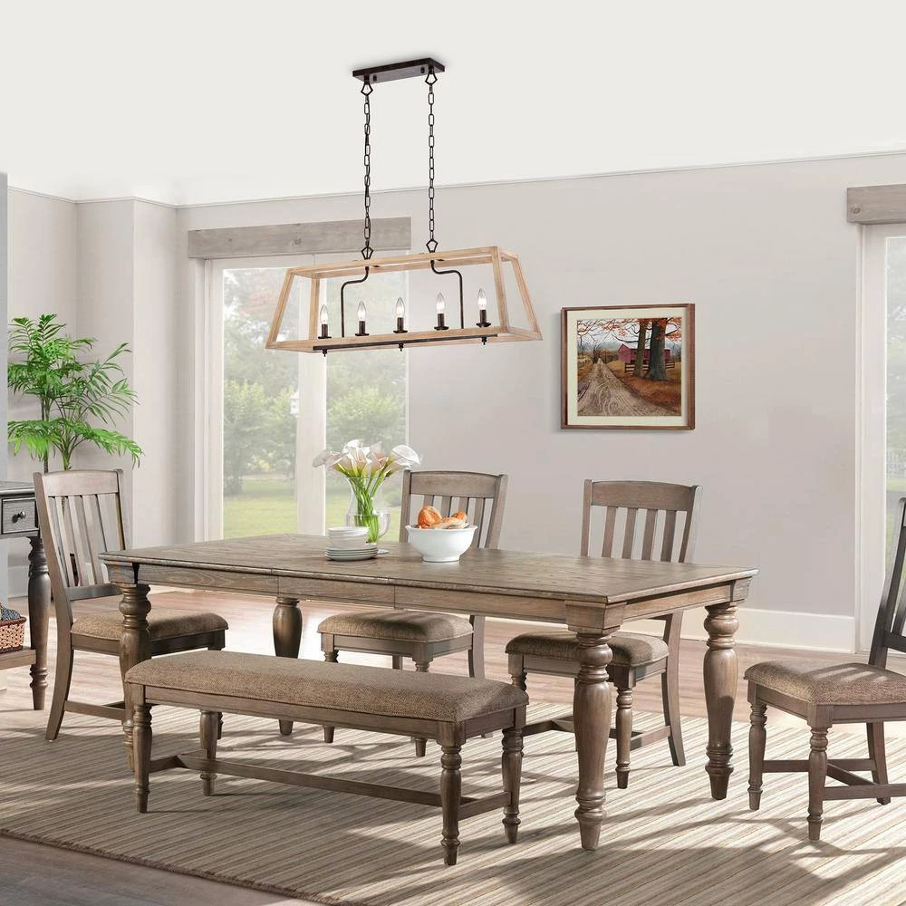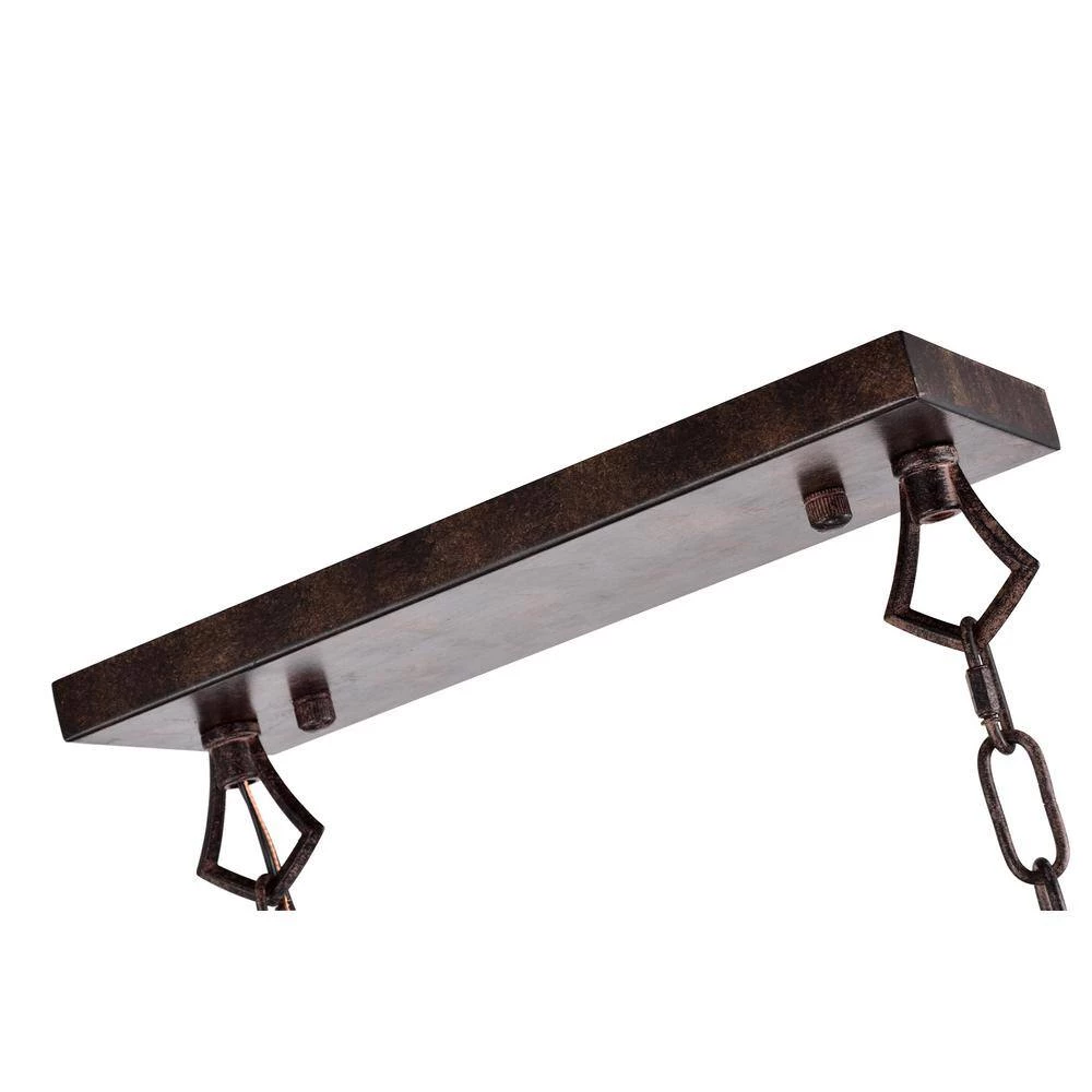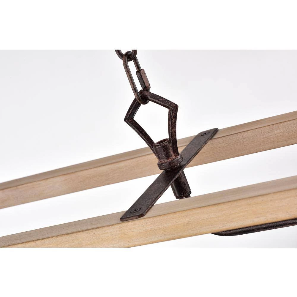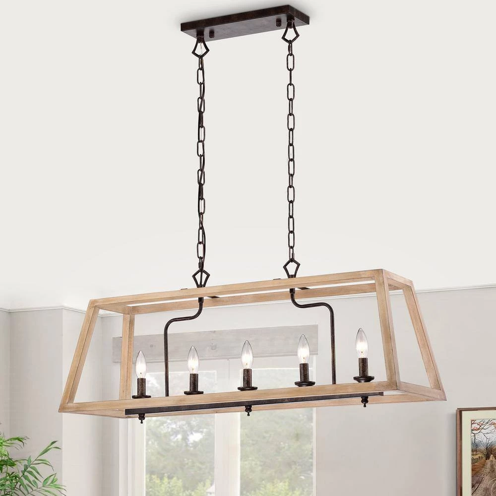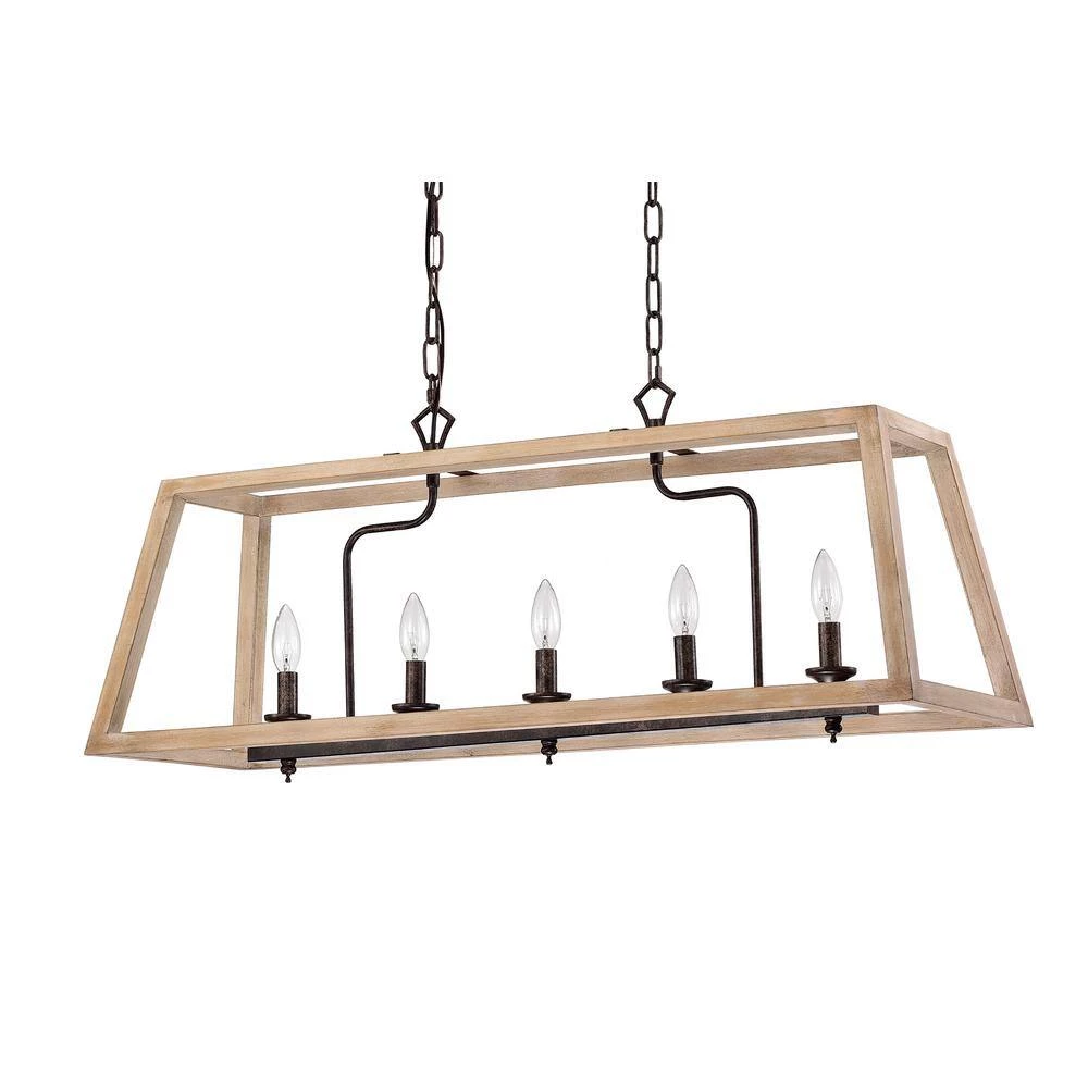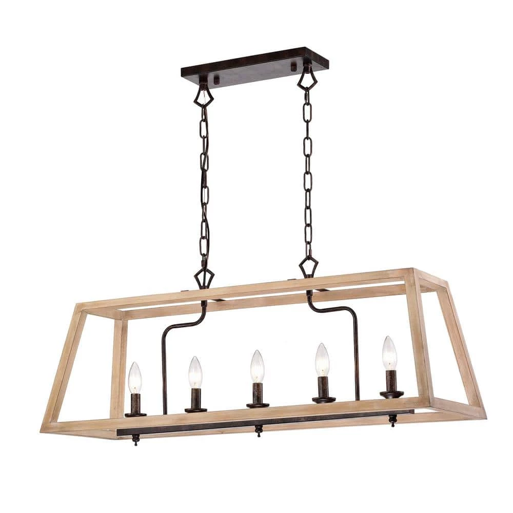 Simplicity combines with rustic charm to create this 5-light chandelier. The clean vintage wood frame offers a contemporary silhouette made more traditional by the rich rustic iron finish on the candelabra style bulbs. The minimal design of this farmhouse chandelier fits perfectly into today’s design trends. Hanging from a 48 in chain, this indoor ceiling light fits perfectly above your kitchen island or dining table.