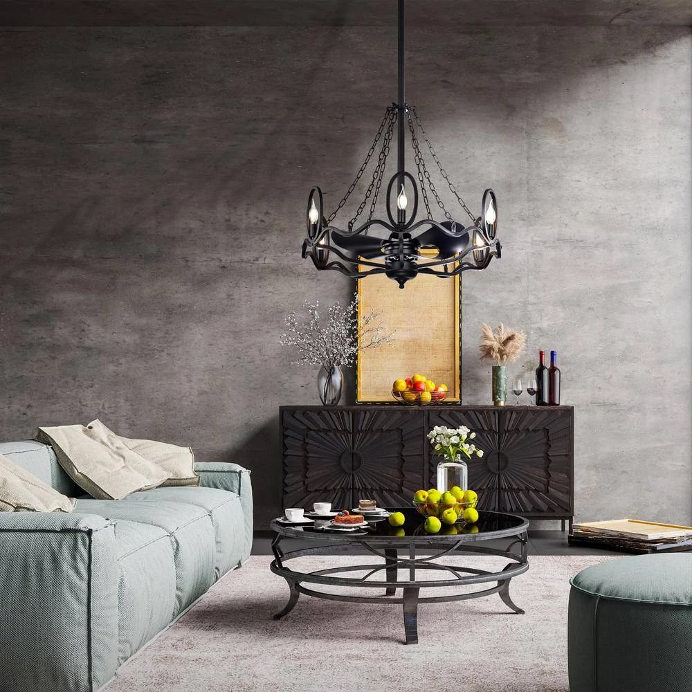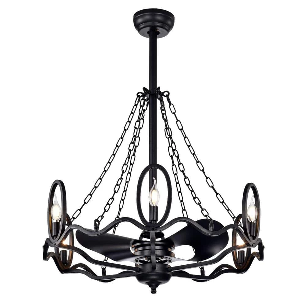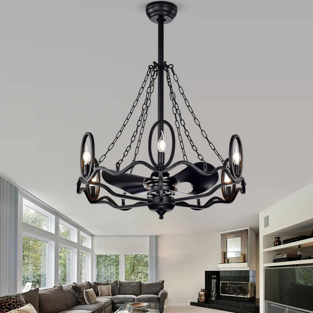 This unique industrial ceiling fan is perfect for small rooms. The forged black hardware and rustic chains of this black ceiling fan make it a perfect fit in any farmhouse or industrial design. The 3-fan blades of this fandelier loop around in combination with the 6 speed motor and create significant airflow that can be adjusted.