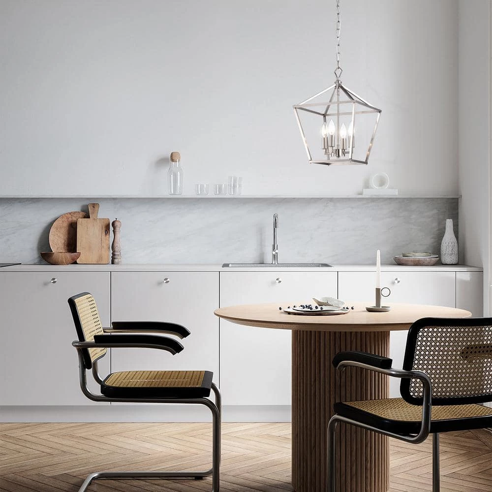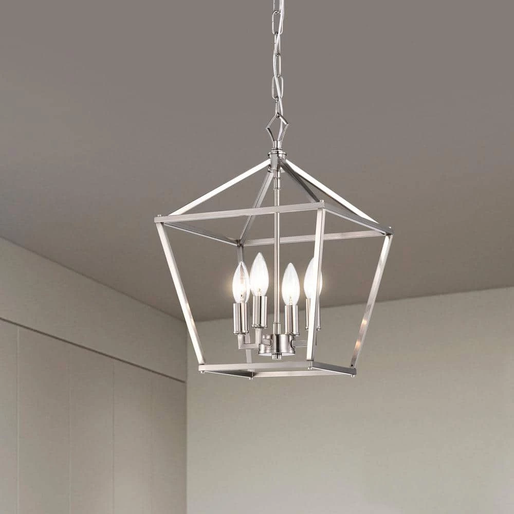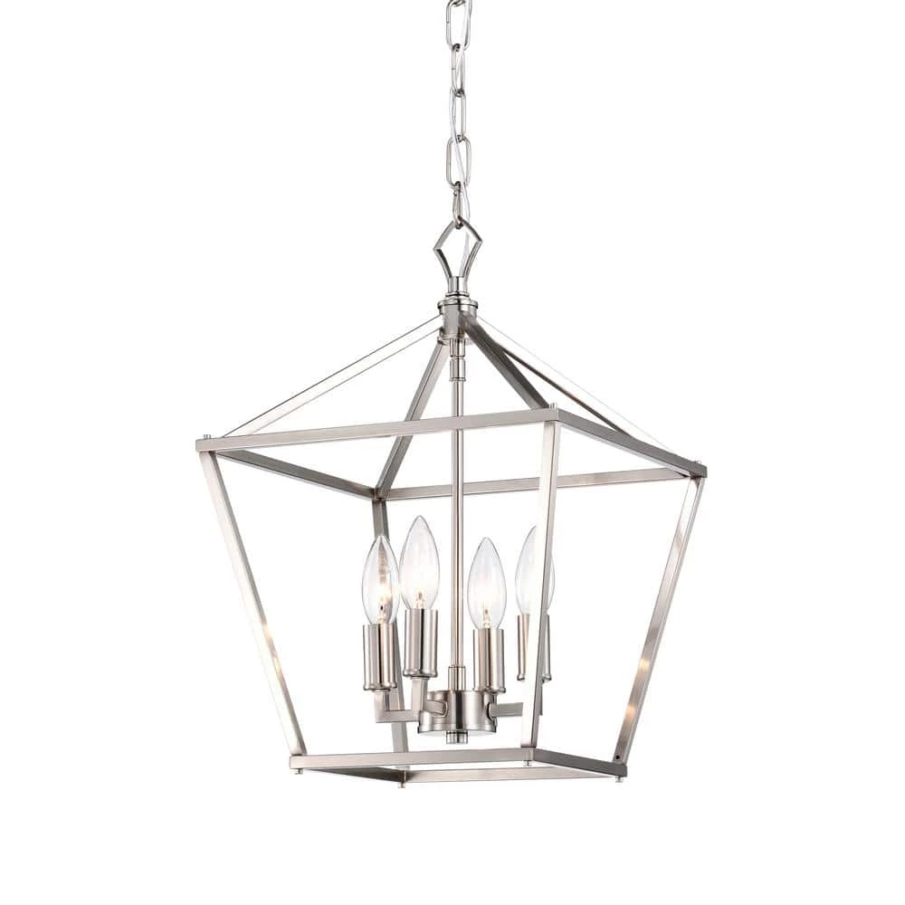 This popular Modern Farmhouse chandelier is the perfect addition to any kitchen, entryway, or dining room. Add 2 or more of these lantern pendants over a kitchen island for a bold statement. The brushed nickel finish of this modern chandelier design gives it versatility, use 4 LED, dimmable, or Edison style bulbs to create acustom look. It comes with brushed nickel candle sleeves and a 40 in. adjustable chain for even more customization.