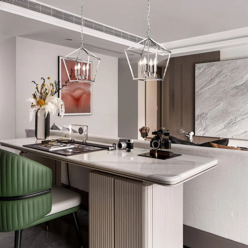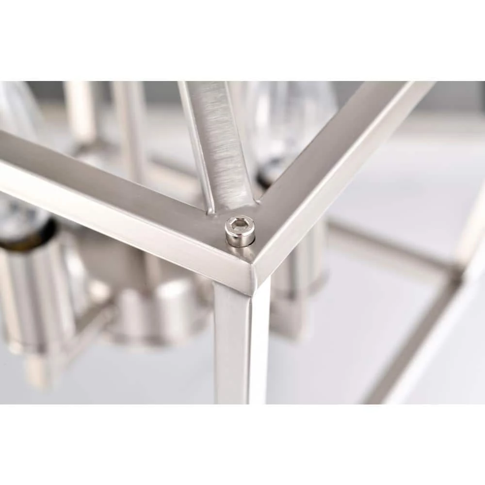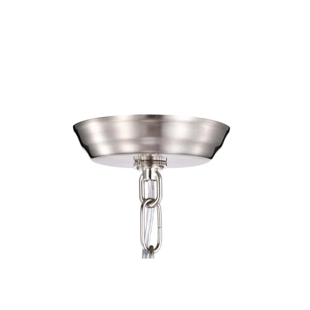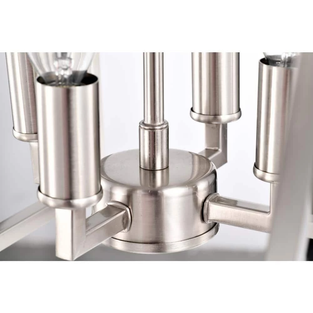 This popular Modern Farmhouse chandelier is the perfect addition to any kitchen, entryway, or dining room. Add 2 or more of these lantern pendants over a kitchen island for a bold statement. The brushed nickel finish of this modern chandelier design gives it versatility, use 4 LED, dimmable, or Edison style bulbs to create acustom look. It comes with brushed nickel candle sleeves and a 40 in. adjustable chain for even more customization.
