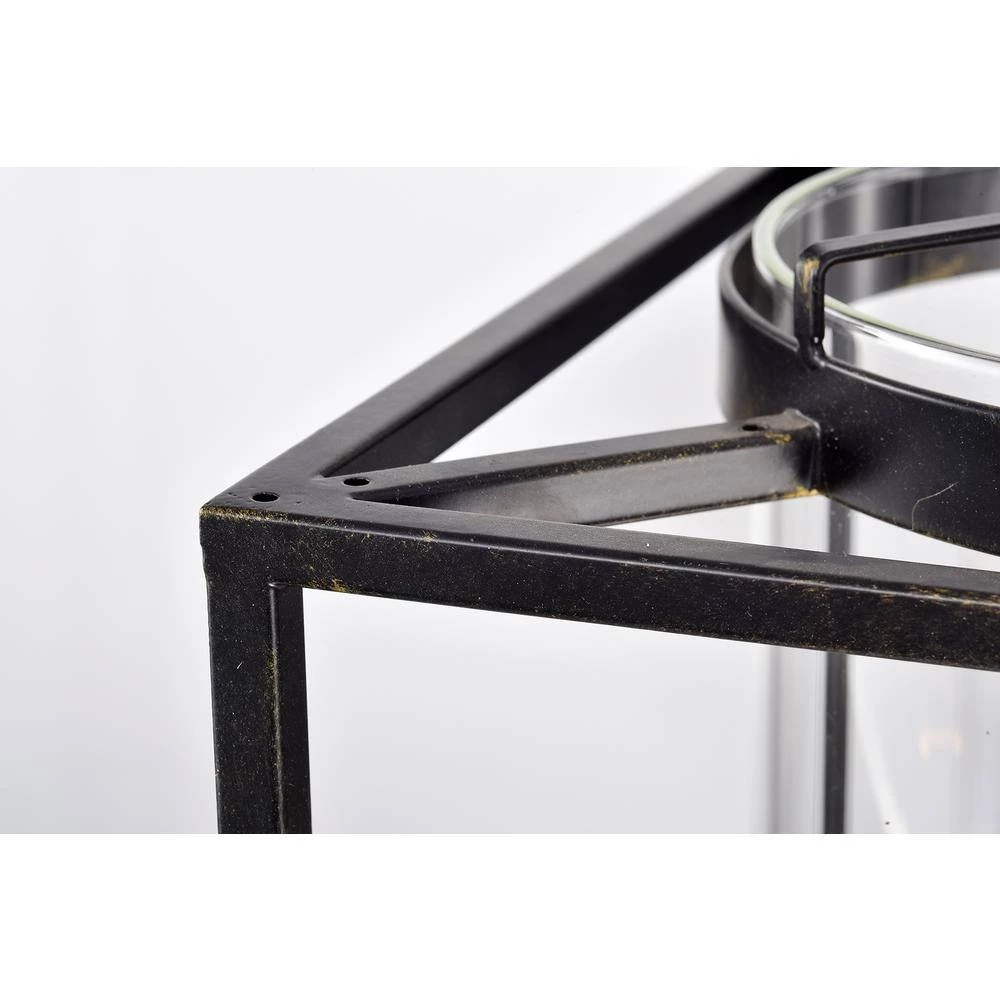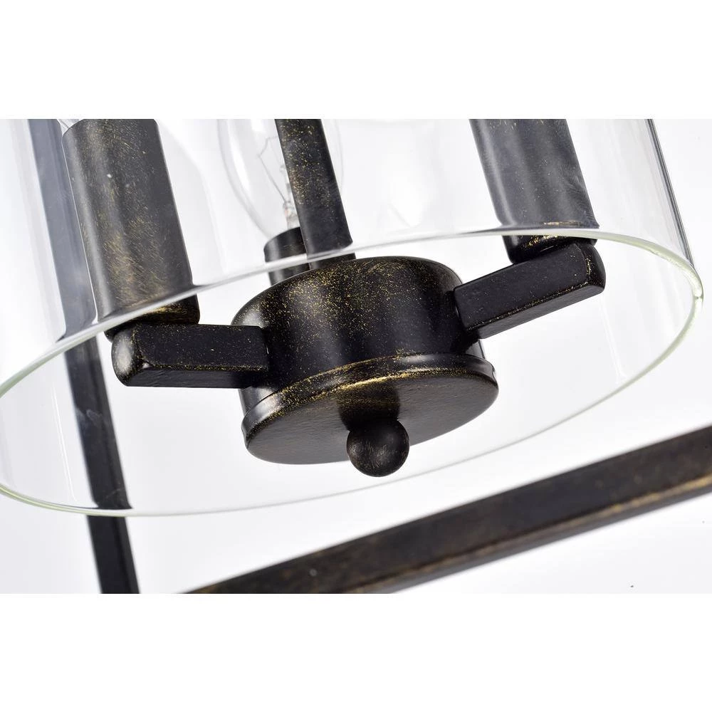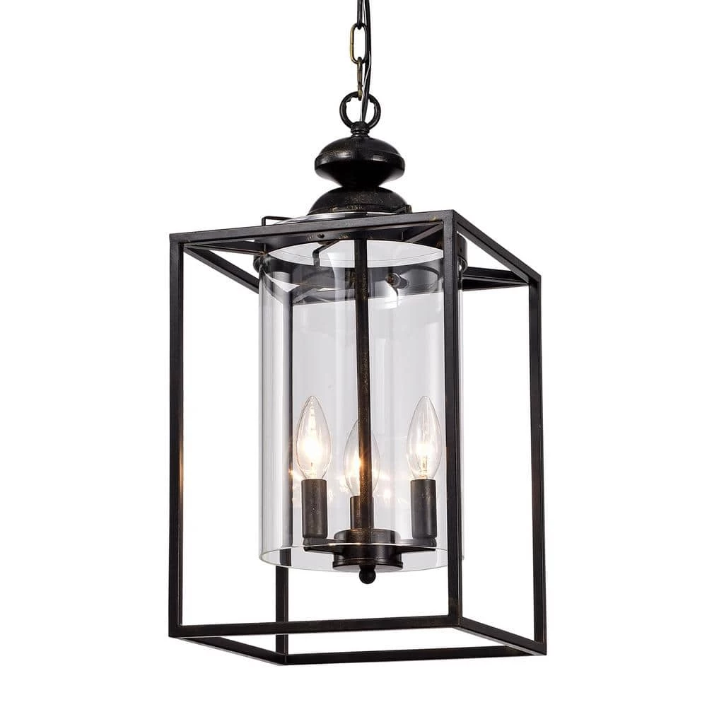 This traditional chandelier is reminiscent of an old English castle. The geometric shape of this antique bronze lantern chandelier contrasts with the cylindrical shape of the clear glass that encasesthe 3 candelabra style bulbs. The 39 in. chain of this farmhouse chandelier is adjustable and an antique bronze color.