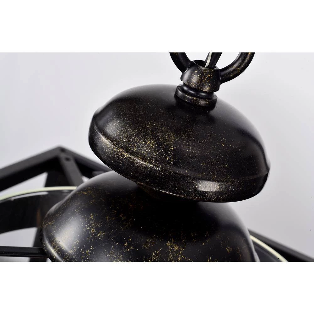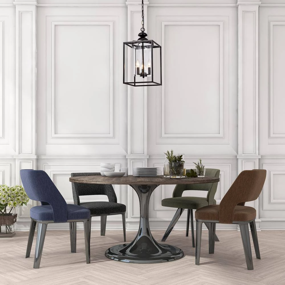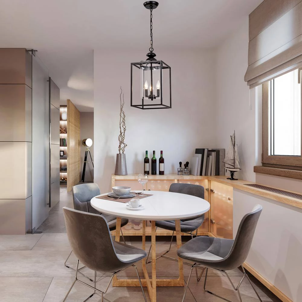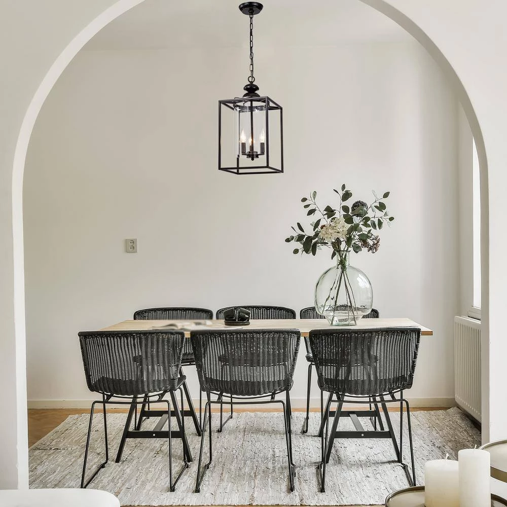 This traditional chandelier is reminiscent of an old English castle. The geometric shape of this antique bronze lantern chandelier contrasts with the cylindrical shape of the clear glass that encasesthe 3 candelabra style bulbs. The 39 in. chain of this farmhouse chandelier is adjustable and an antique bronze color.