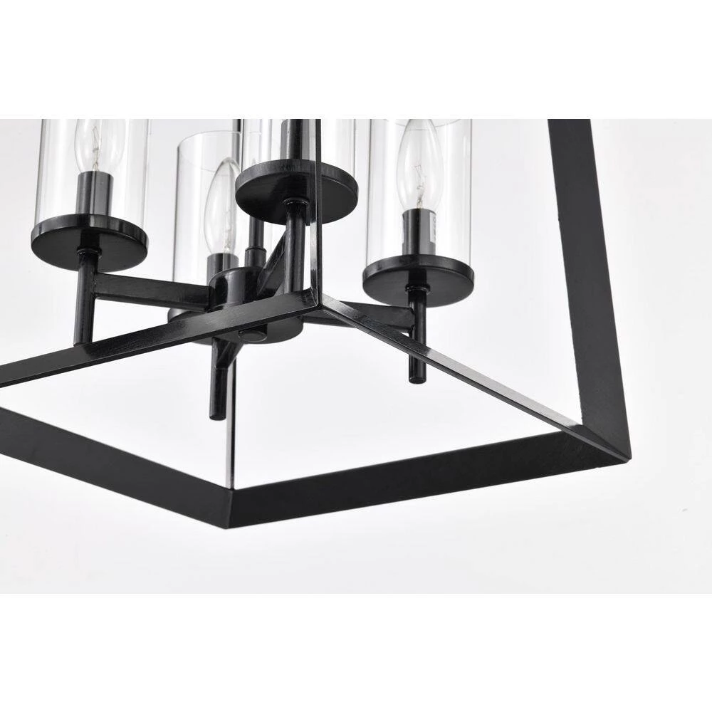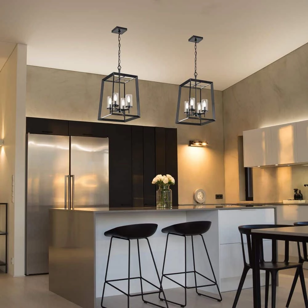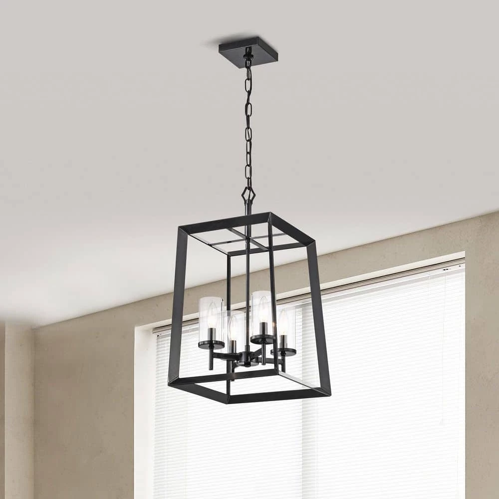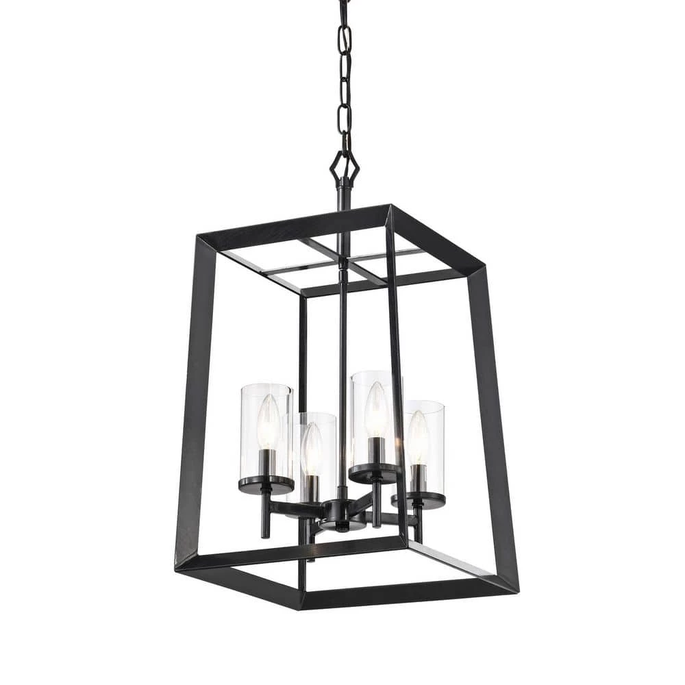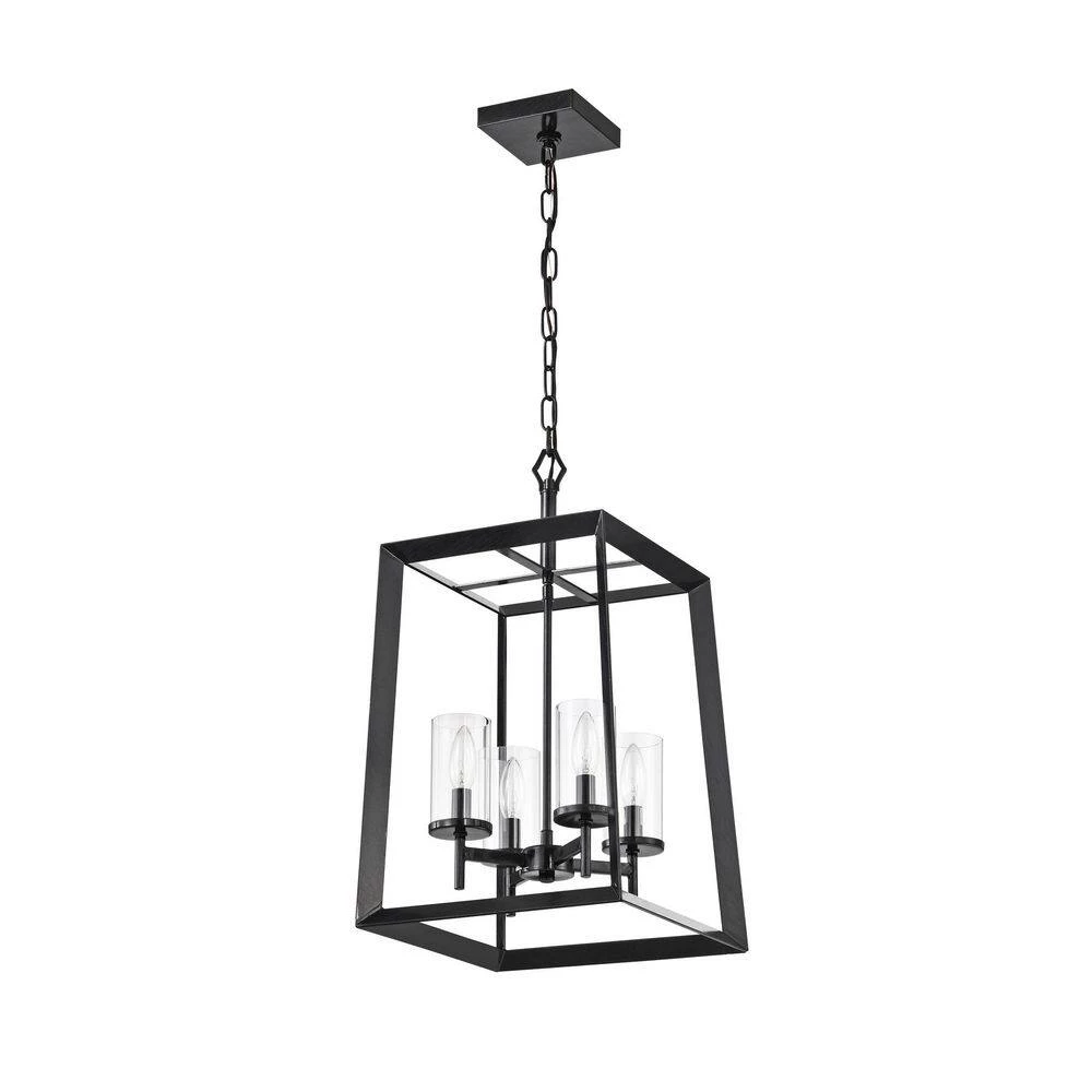 A modern take on the classic lantern style chandelier, the Richard 4-light pendant offers plenty of light. Defined by an antique black open work frame, this chandelier features 4 E12 candelabra style bulbs (not included) encased in a clear glass cylinder shade. This sleek cage pendant light is perfect for traditional, transitional and farmhouse interiors. Place this lantern pendant light above the entryway, kitchen table or dining room to grace your home with minimalist style and bright illumination. For ease of installation, this light fixture comes equipped with a 40 in. chain that may be shortened by removing some links to suit a variety of ceiling heights and room sizes. This light is also compatible with a dimmer switch when installed with dimmable bulbs, allowing you to adjust your light levels accordingly.