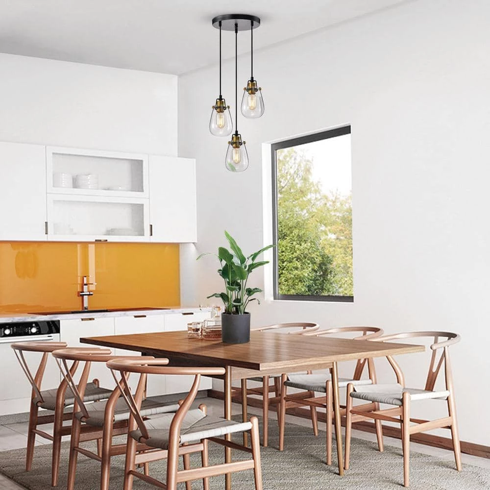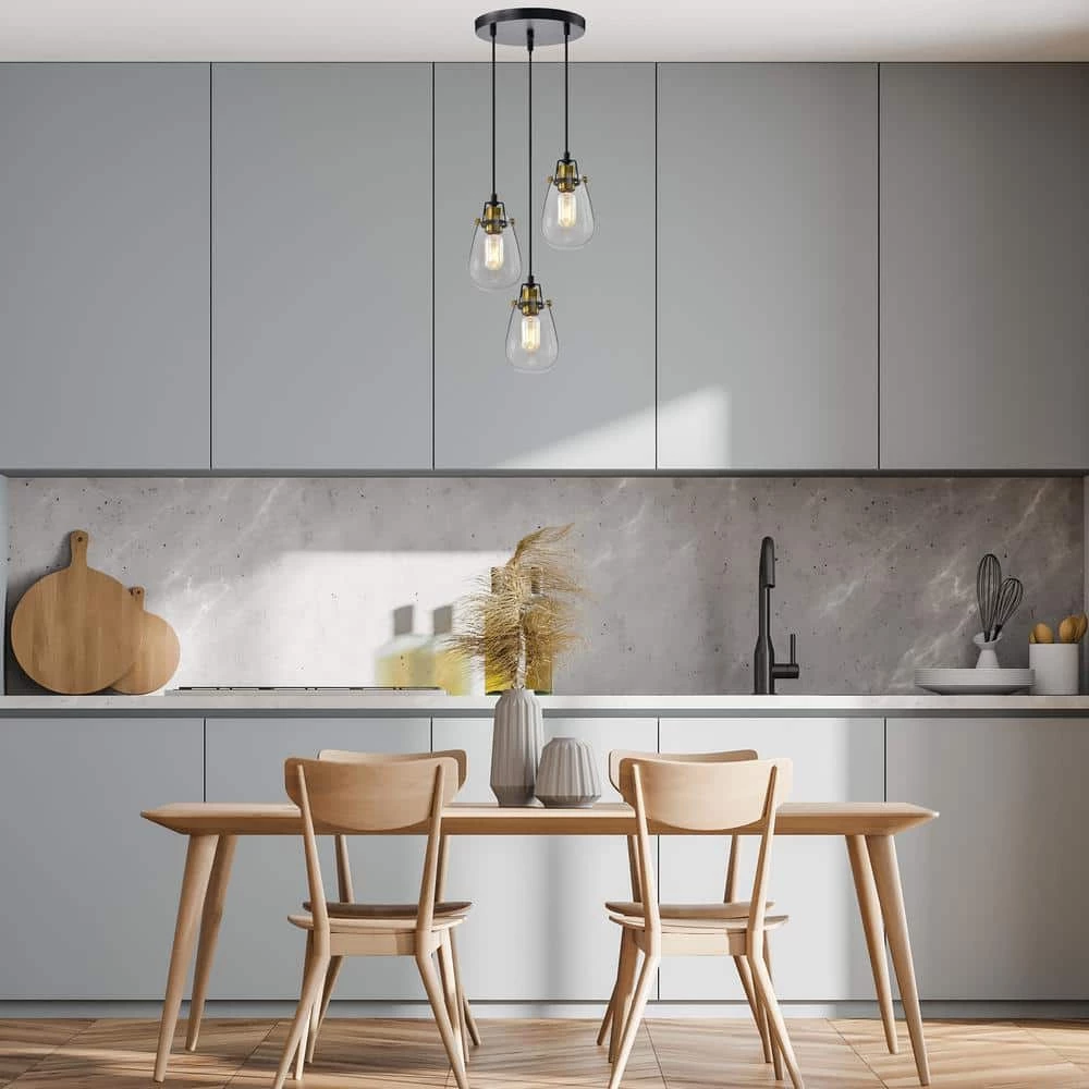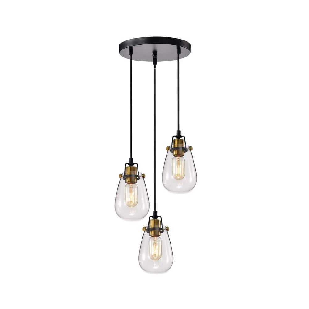Simple and elegant, this modern 3-light pendant light features beautiful handblown glass shades. The antique gold and matte black finishes create a stunning contrast to this industrial chandelier that is perfect for today’s lighting design trends. This modern pendant light comes with three 60 in. cords and are adjustable to create a custom look.