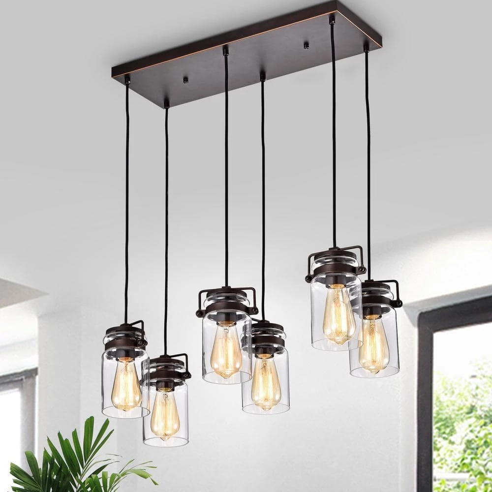 This modern farmhouse lighting piece comes in oil rubbed bronze. Perfect for kitchen islands or over the sink, this fixture will add to your design style. The cord for each glass jar is adjustable.