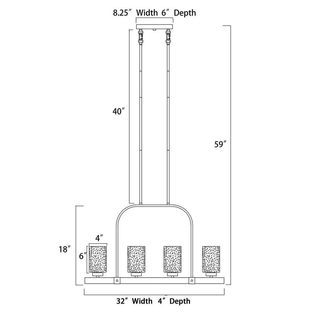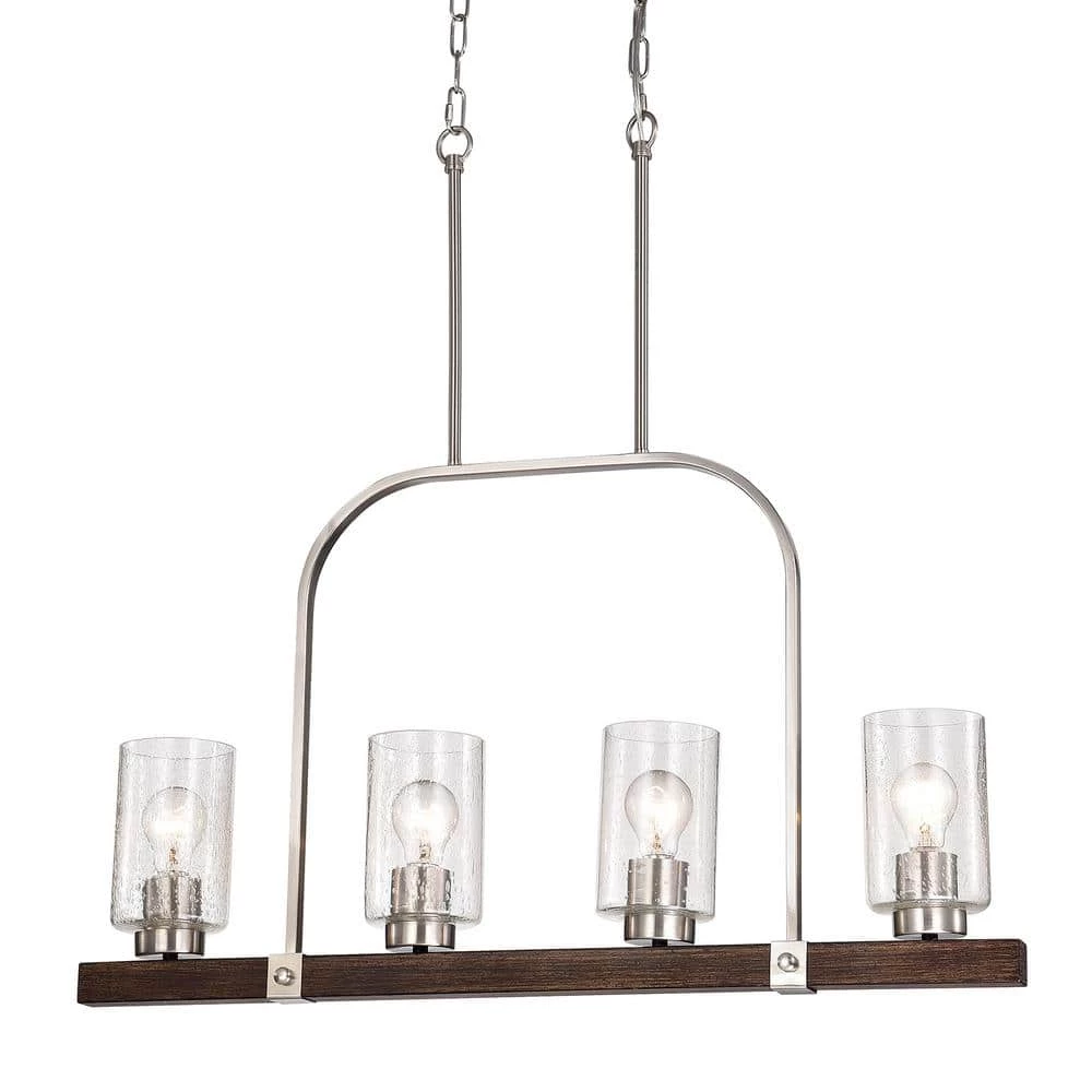 The linear base of this chandelier is painted to be reminiscent of barn wood making this modern chandelier both rustic and contemporary. The brushed nickel and seedy glass shades that surround 4- light linear chandelier creates a unique light fixture. Create a fully customized hanging position with the 48 in. chain of this brushed nickel chandelier.