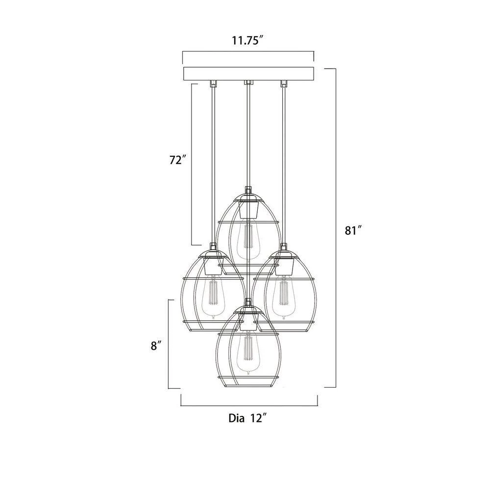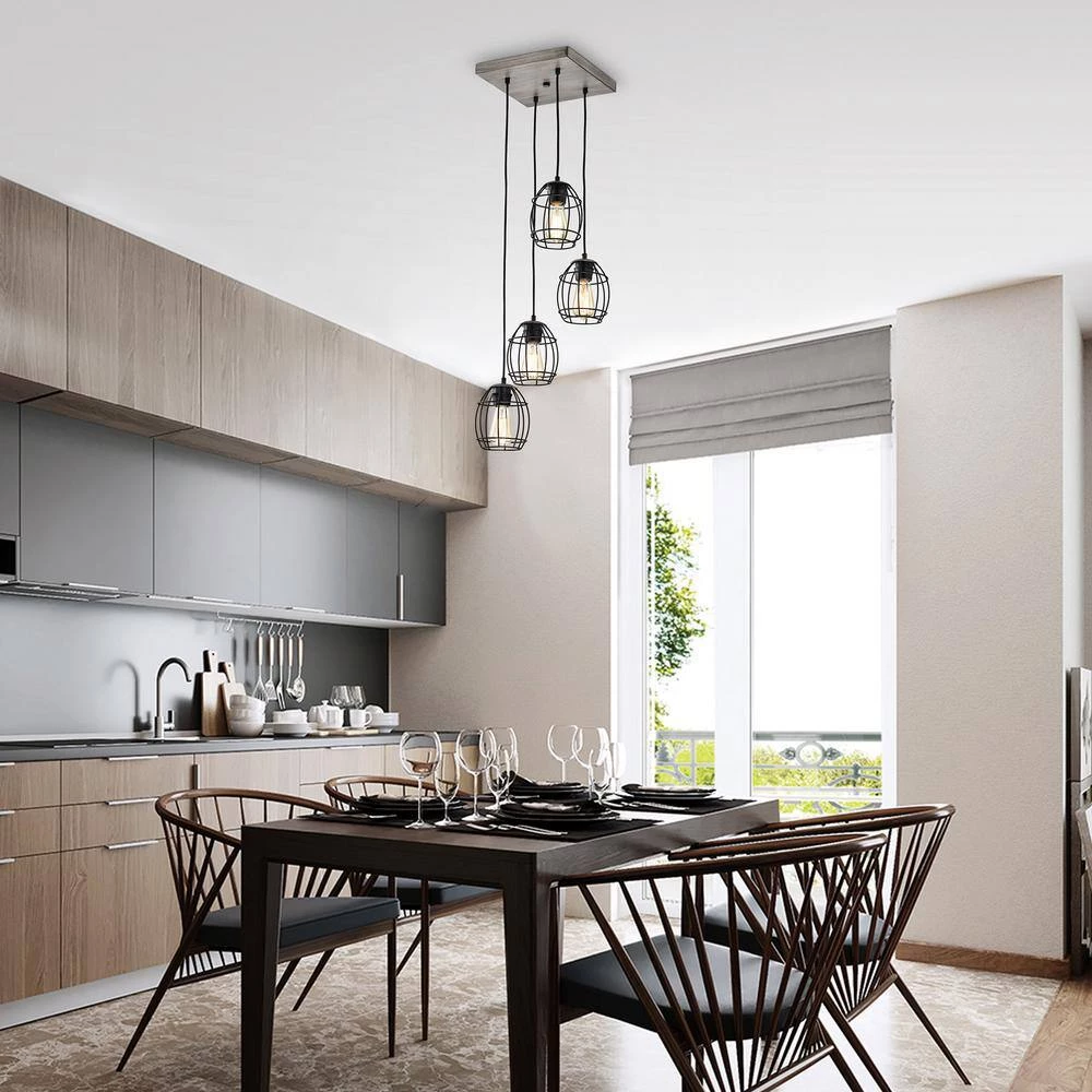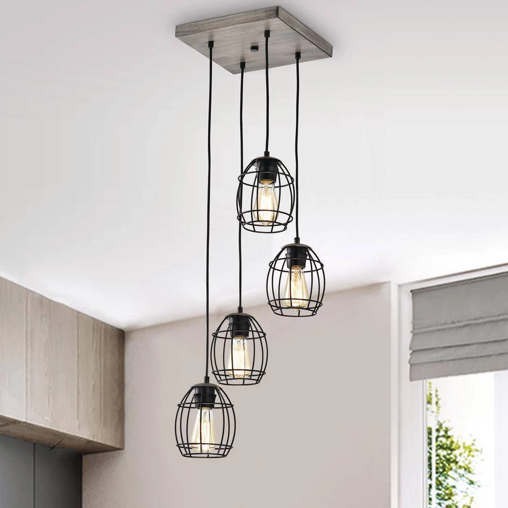 Merging rustic finishes and modern sensibility, our new 4-light pendant commands a space. The black welded cage hangs at different levels, adding intensity to any design plan. The wood finishes on the cage holders and ceiling canopy balance the ceiling light fixture while adding a touch of natural elements. Place this modern pendant light above your kitchen table or living room to complete your interior.