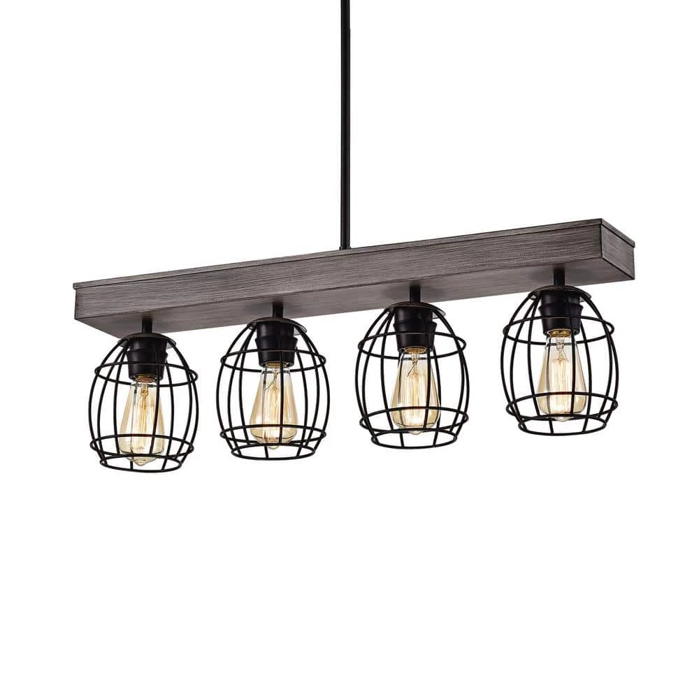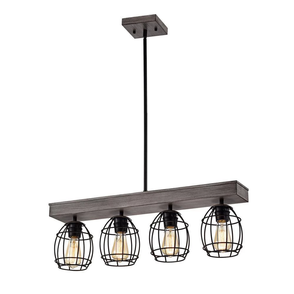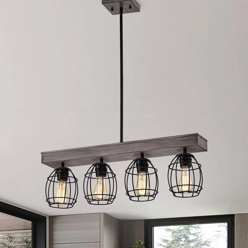 Refresh your space with the unique design of our 4-light pendant. Crafted of steel, this unique linear pendant light features an artful cage design balanced by a matte black and natural wood finish. The combination of curved and straight lines make this lighting fixture a perfect centerpiece over your kitchen island or dining room.