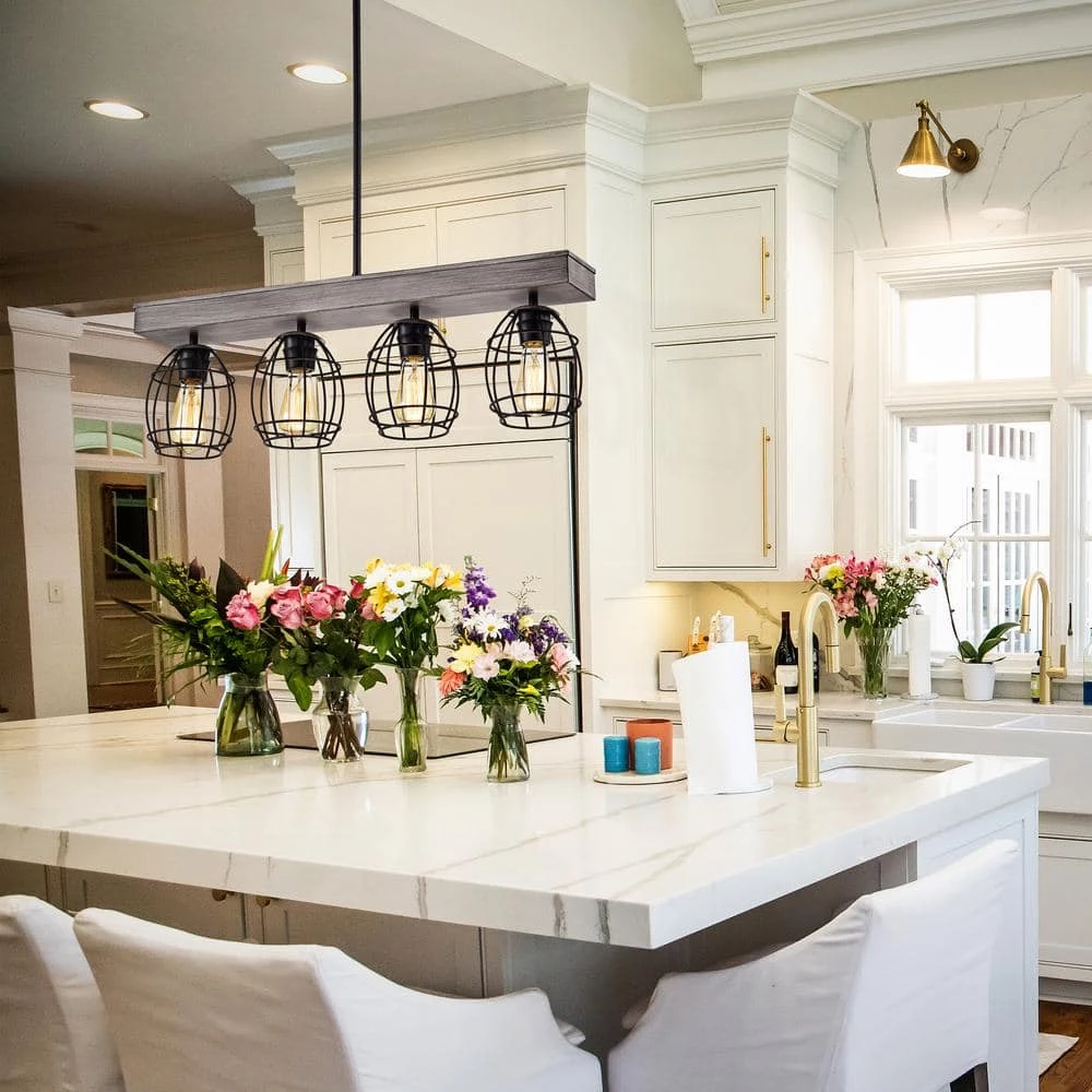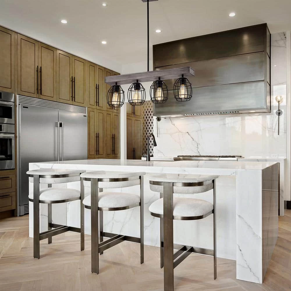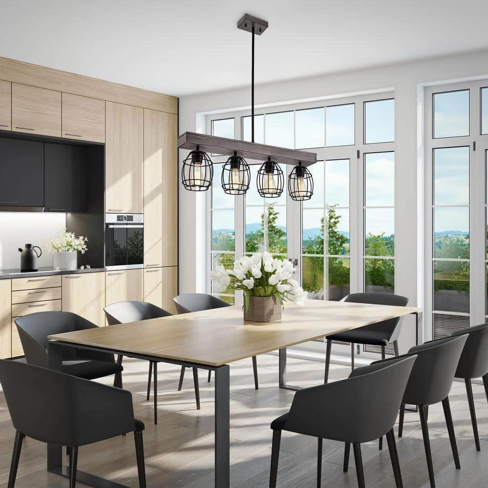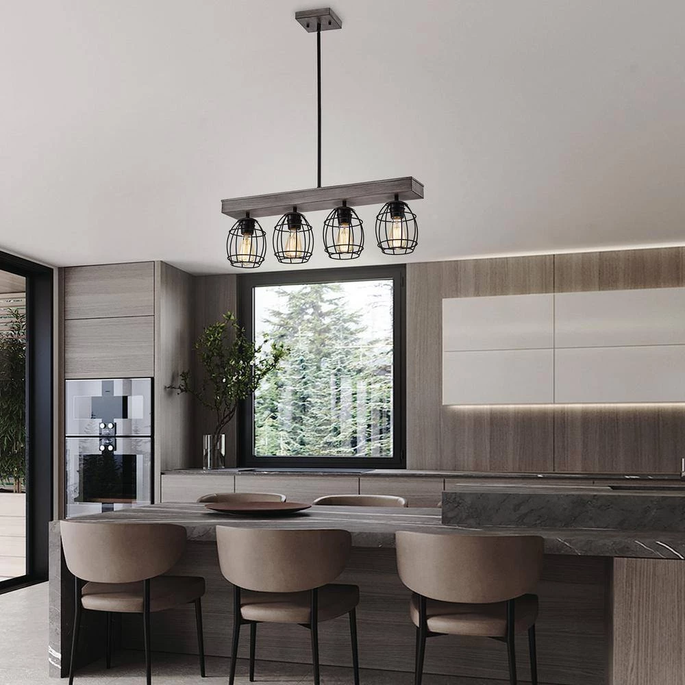 Refresh your space with the unique design of our 4-light pendant. Crafted of steel, this unique linear pendant light features an artful cage design balanced by a matte black and natural wood finish. The combination of curved and straight lines make this lighting fixture a perfect centerpiece over your kitchen island or dining room.