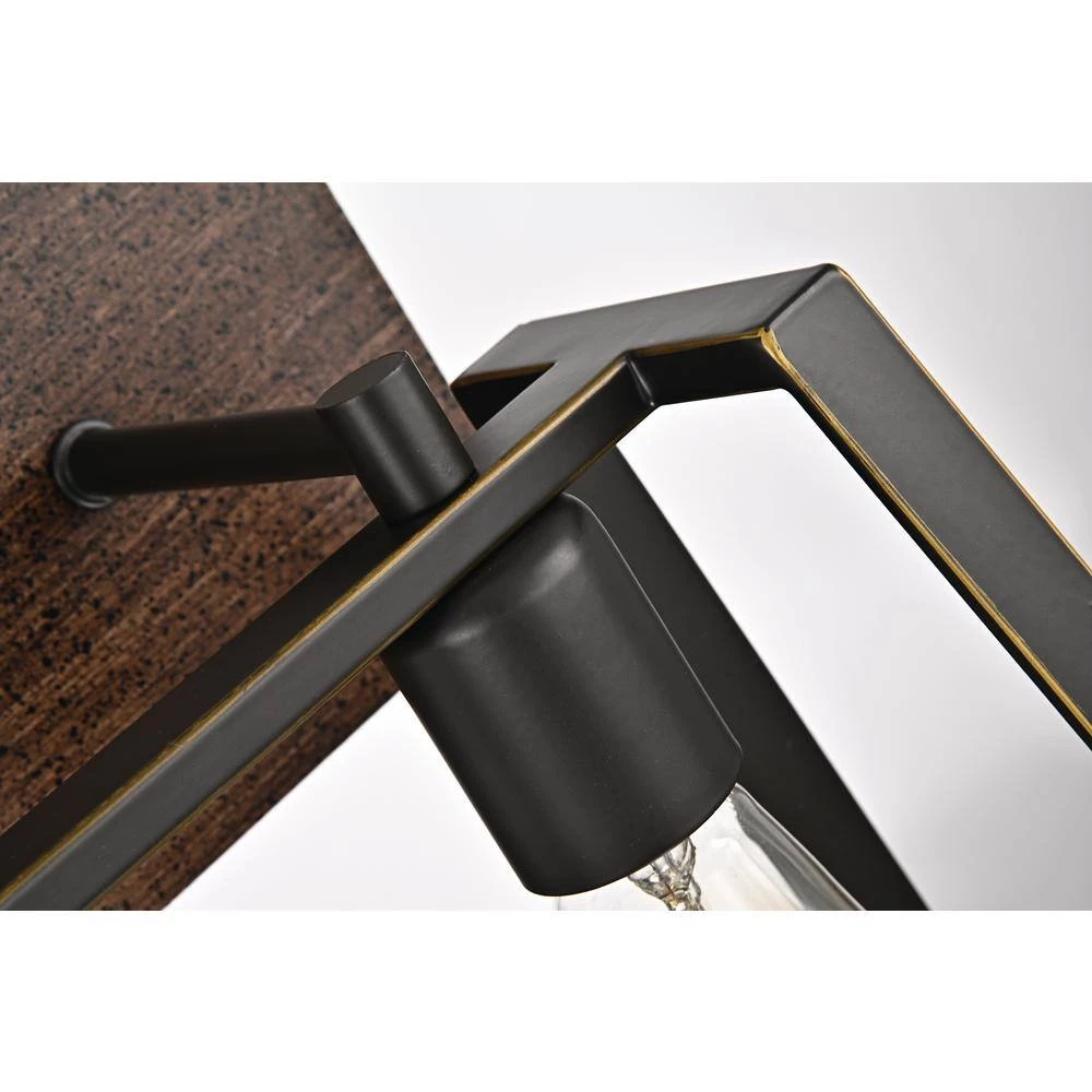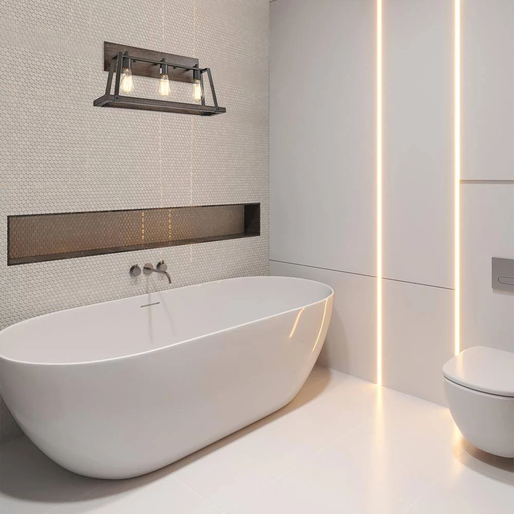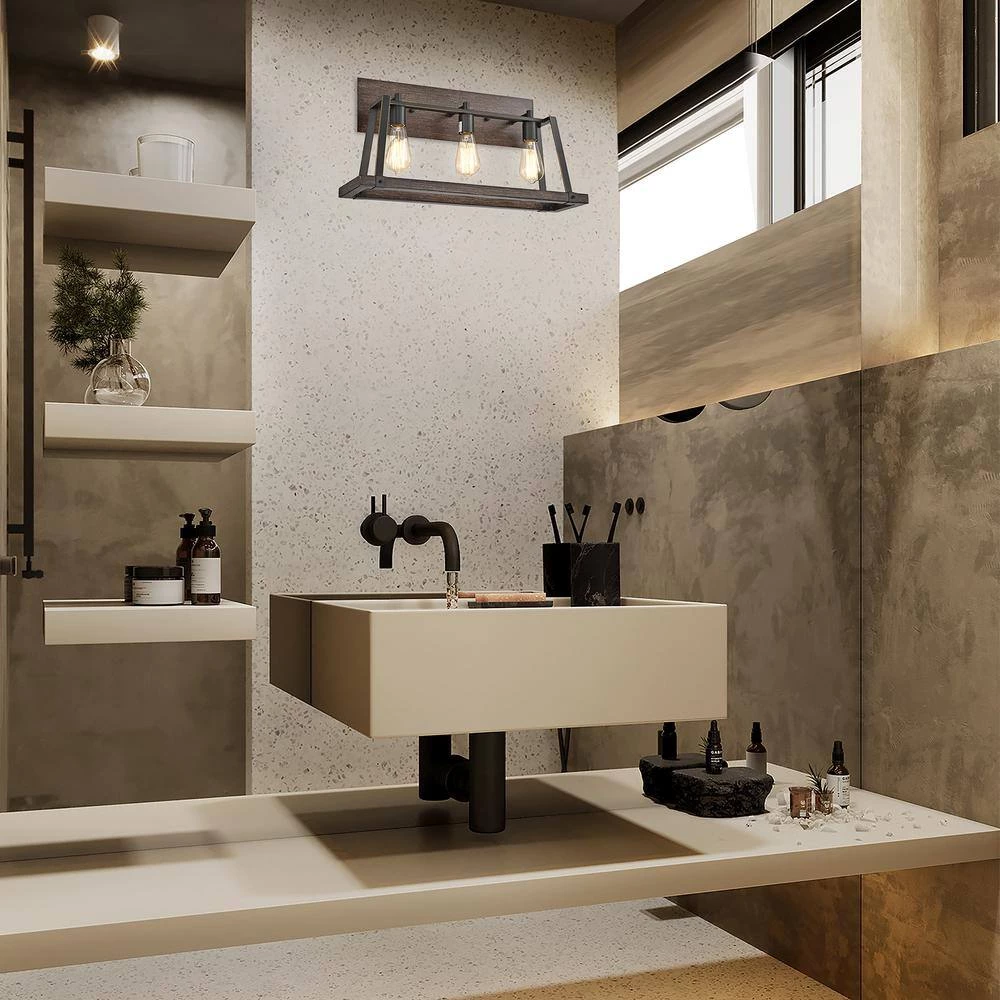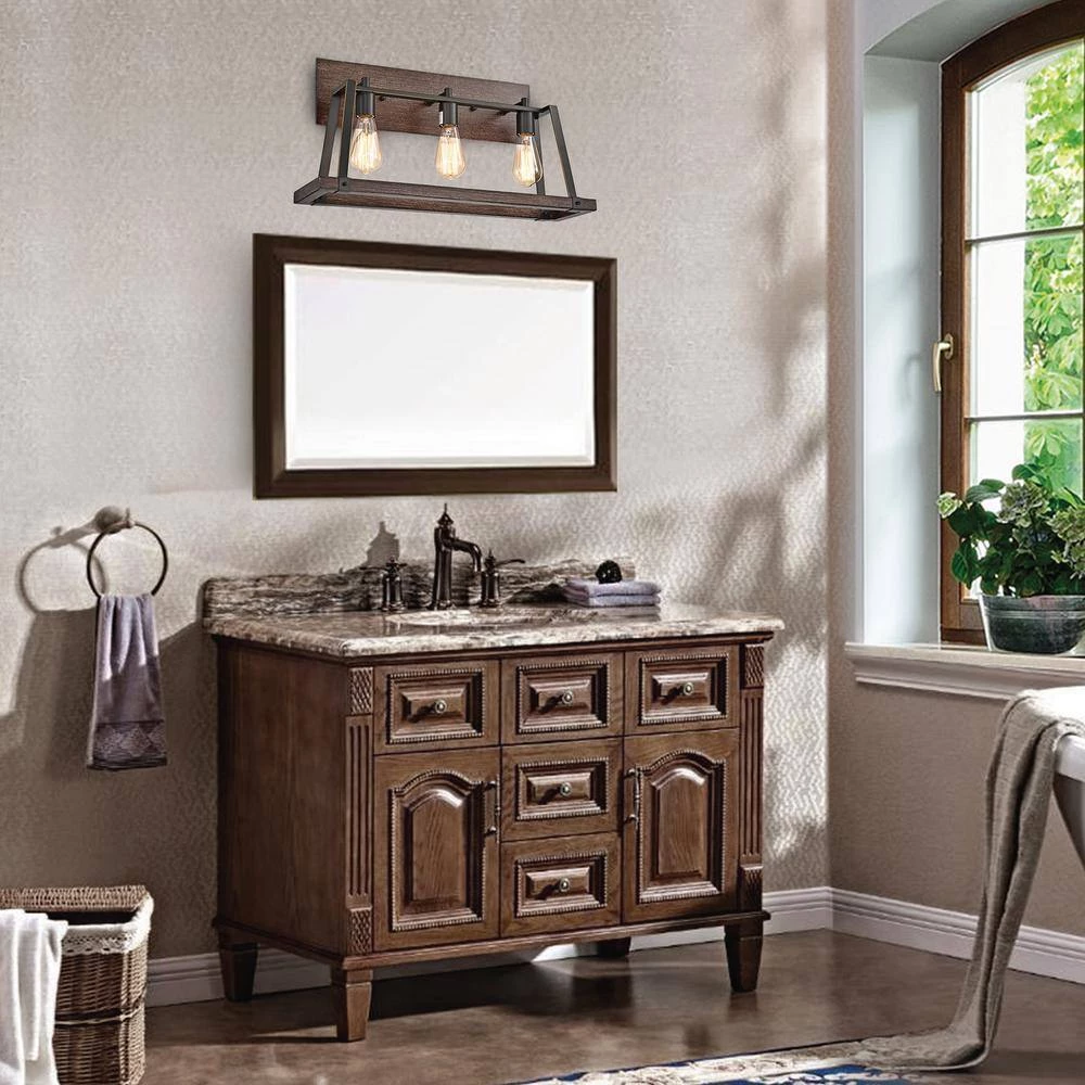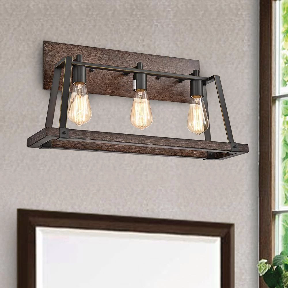 Personalize your bathroom with our 3-light vanity. Defined by an open work frame, the exposed bulbs of this farmhouse vanity light provide ample lighting to your room of choice. The oil rubbed bronze and wood finish of this oil rubbed bronze vanity light complement each other to create a timeless industrial farmhouse design.