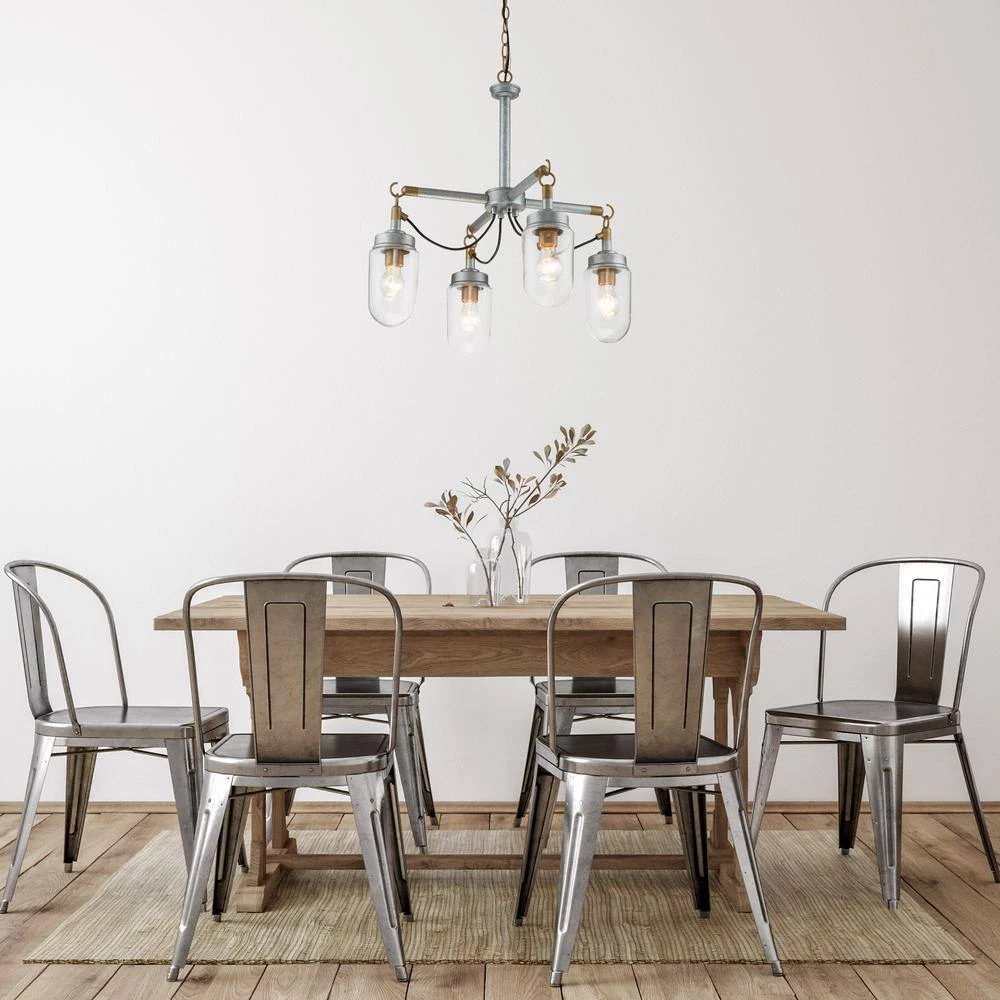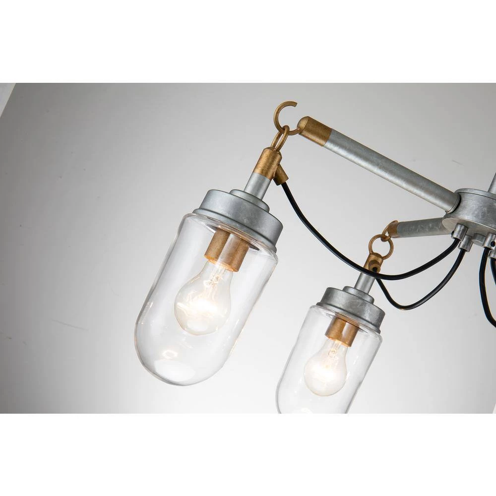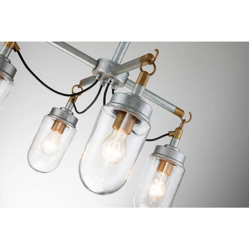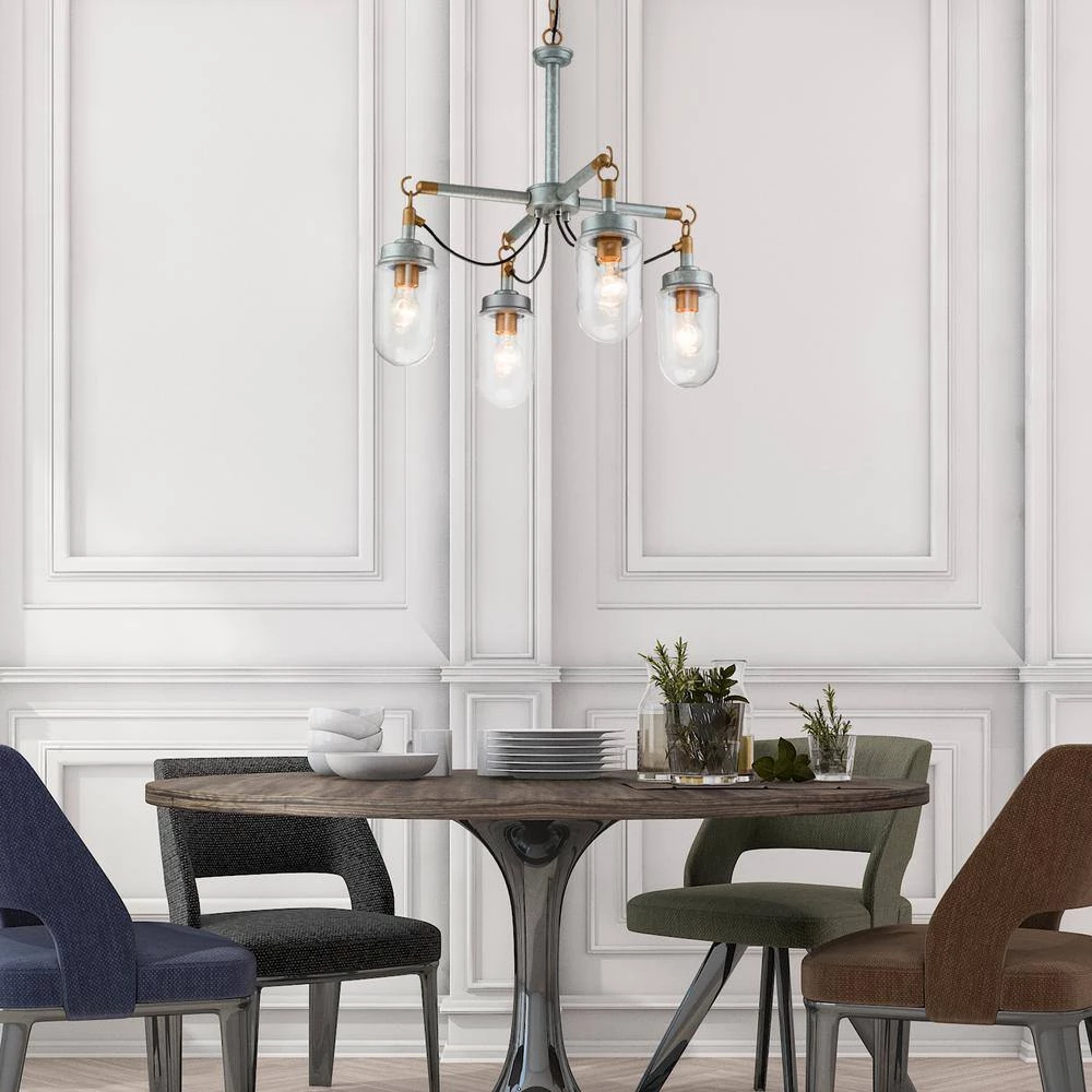 This 4-light chandelier captures the essence of industrial design with its finely crafted details. The unique structure of this industrial chandelier features vintage silver streamlined rods with antique gold hooks that hold 4 clear glass shades. Hanging from a 48 in. chain, this indoor ceiling light is perfect above the foyer, living room, or dining room.