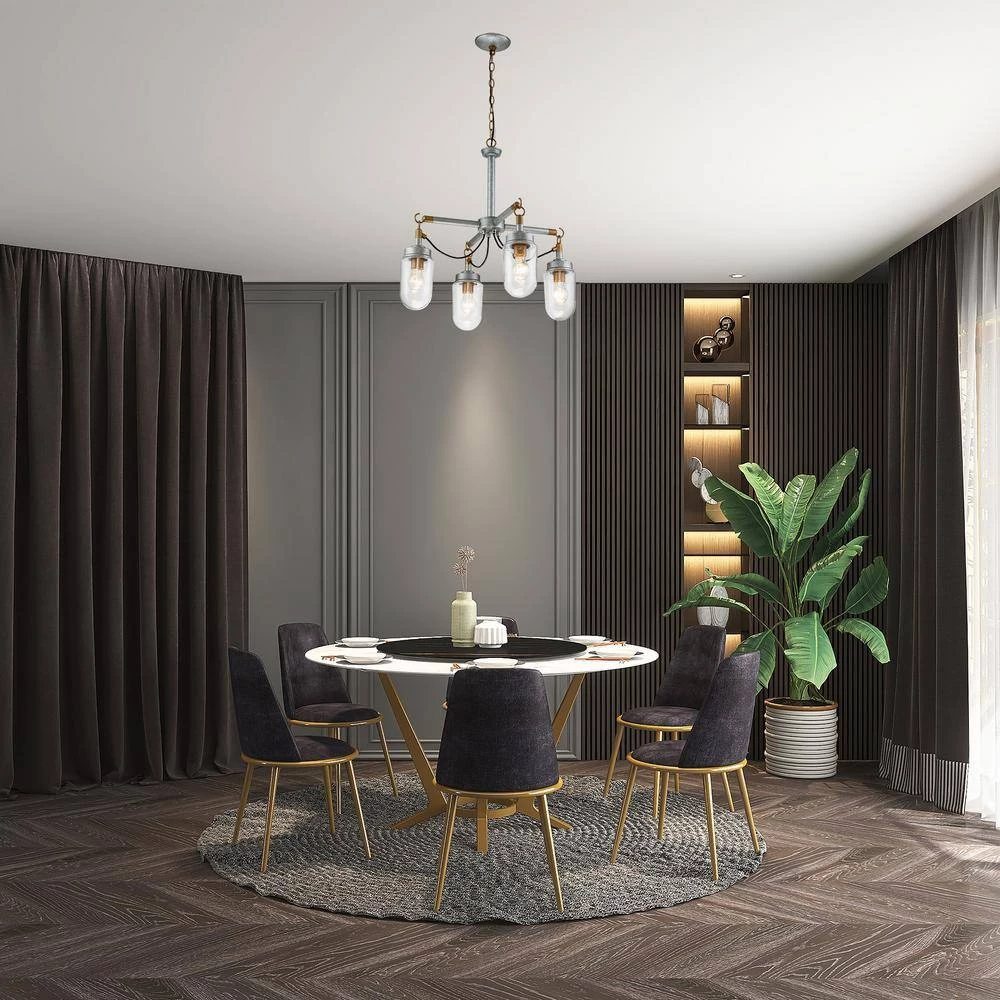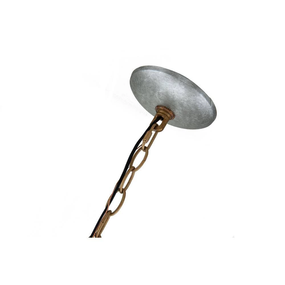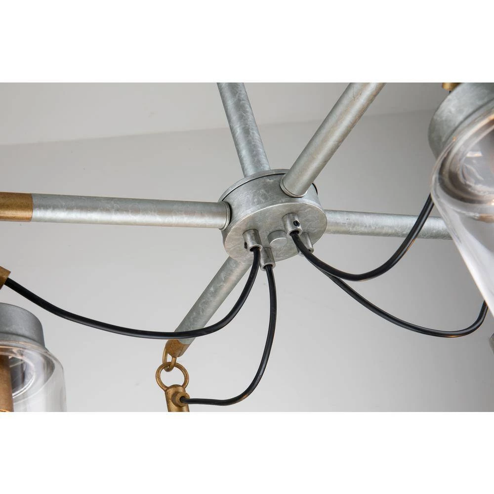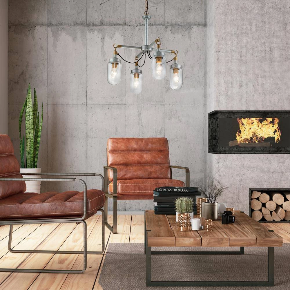 This 4-light chandelier captures the essence of industrial design with its finely crafted details. The unique structure of this industrial chandelier features vintage silver streamlined rods with antique gold hooks that hold 4 clear glass shades. Hanging from a 48 in. chain, this indoor ceiling light is perfect above the foyer, living room, or dining room.