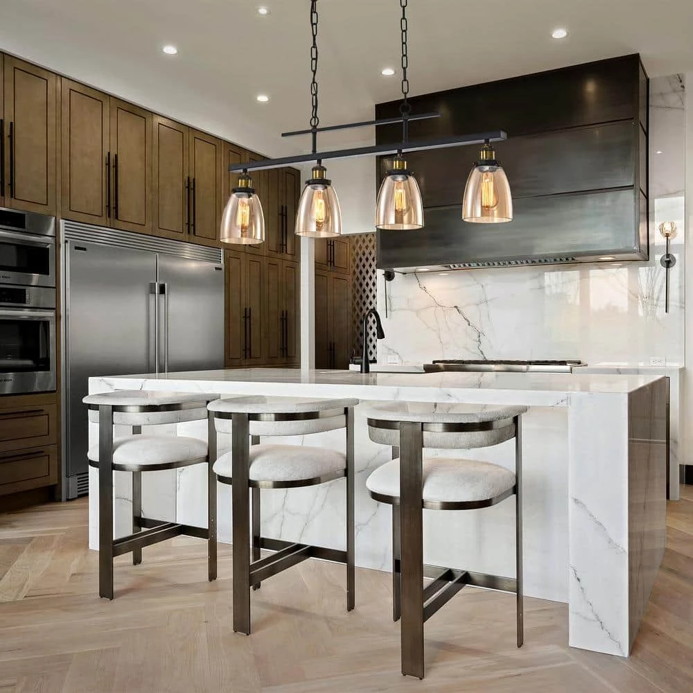 Illuminate your kitchen with modern style with this charming 4-light glass shade kitchen island chandelier. It features an antique black finish and amber hue glass shades. The 4-light chandelier design provides abundant light to the area while adding a welcoming, warm ambiance. This black linear chandelier comes with a 39 in. adjustable chains make it perfect for any room size or situation. The antique black hardware gives it an antique feel that screams traditional yet contemporary.